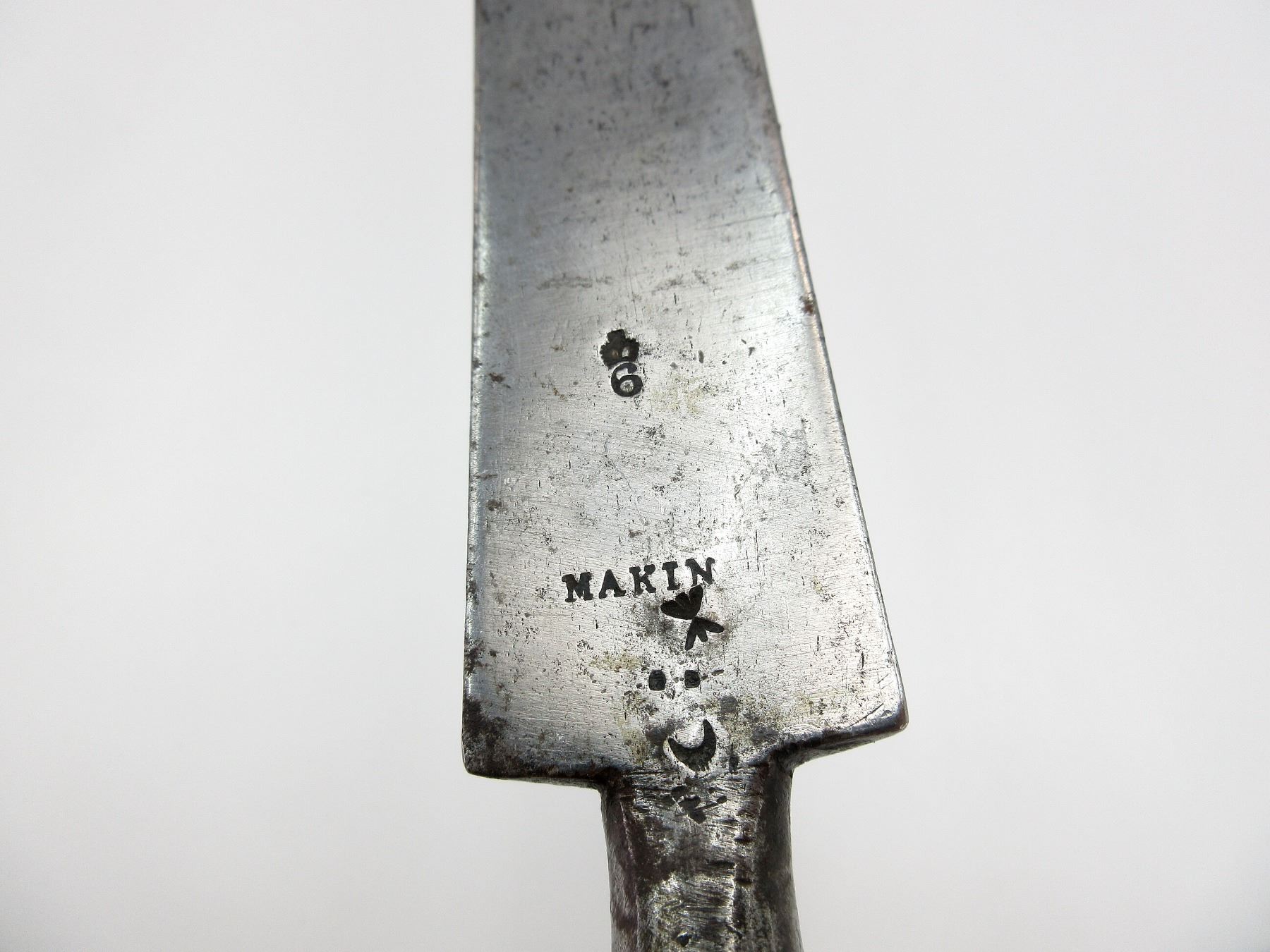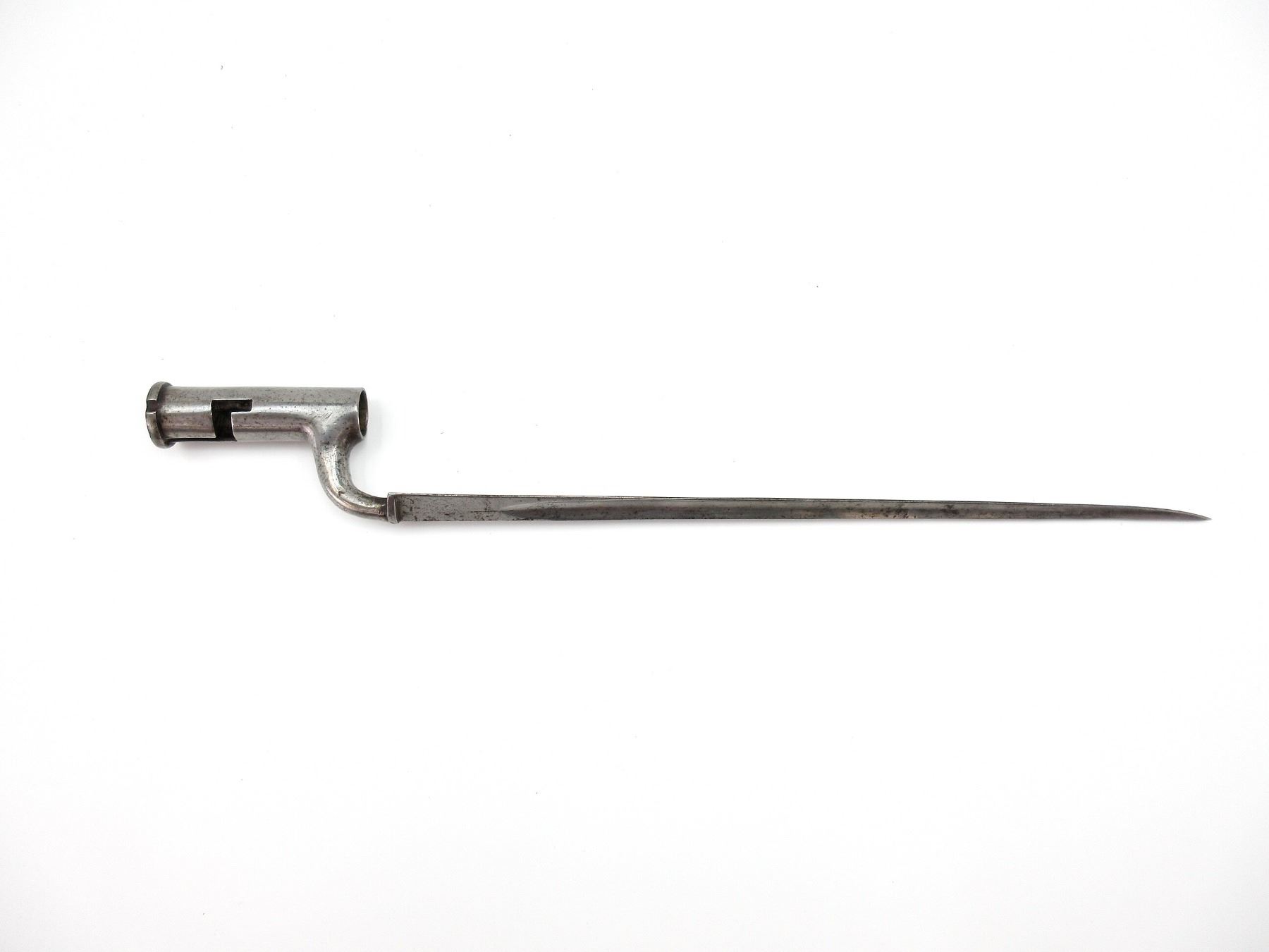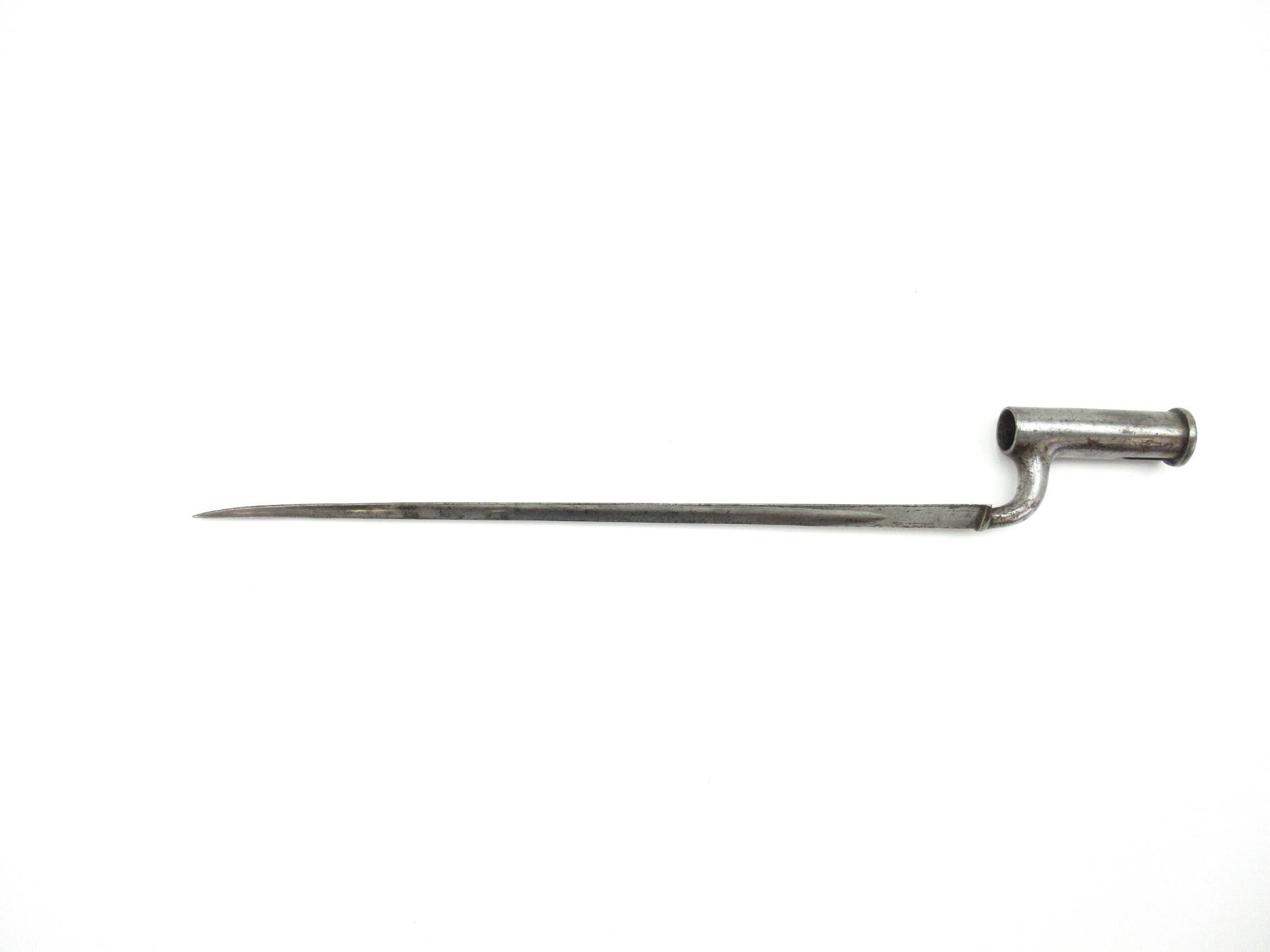 (1) CONSIGNOR STATES: "SOCKET BAYONET FOR 1842 PATTERN ARMS WITH GROOVE FOR SIGHTING WITH RIFLED ARMS, IDENTIFIED IN PRIEST'S BAYONET BOOK ON PAGE 54 AS A BAYONET FOR TRIALS OF RIFLED ARMS", SIMILAR TO INDIA PATTERN BROWN BESS SOCKET BAYONET FOR USE WITH .75 CAL. INDIA PATTERN BROWN BESS FLINTLOCK MUSKET, BLADE MARKED: "MAKIN", CROWN OVER "6", PROOF MARK & TWO BROAD ARROWS FACING EACH OTHER, NO VISIBLE MARKINGS ON SOCKET, 30MM WIDE BLADE, MUZZLE RING APPROX. 0.99" DIA., BLADE APPROX. 16 7/8" & OAL APPROX. 21 5/8". SEE PHOTOS.