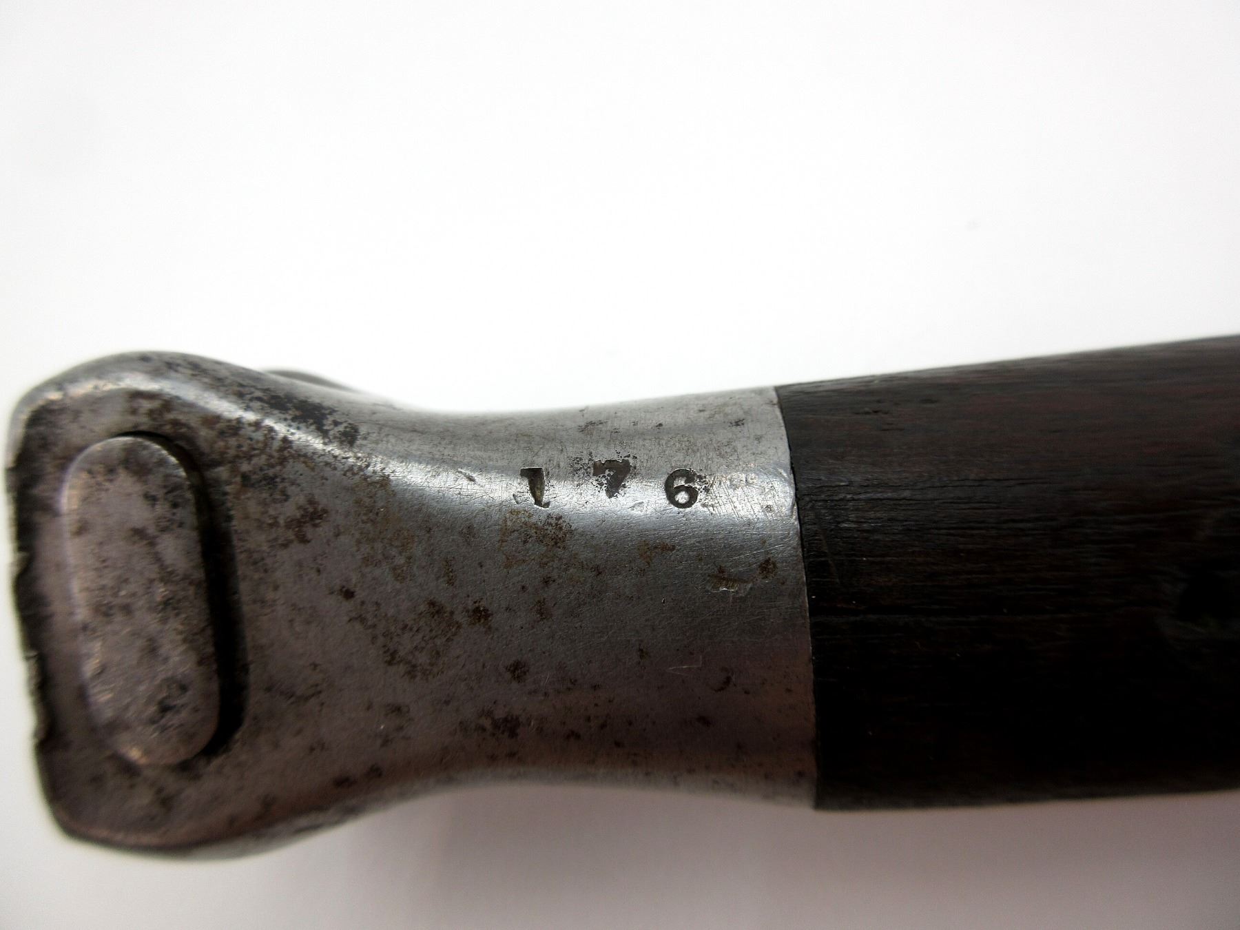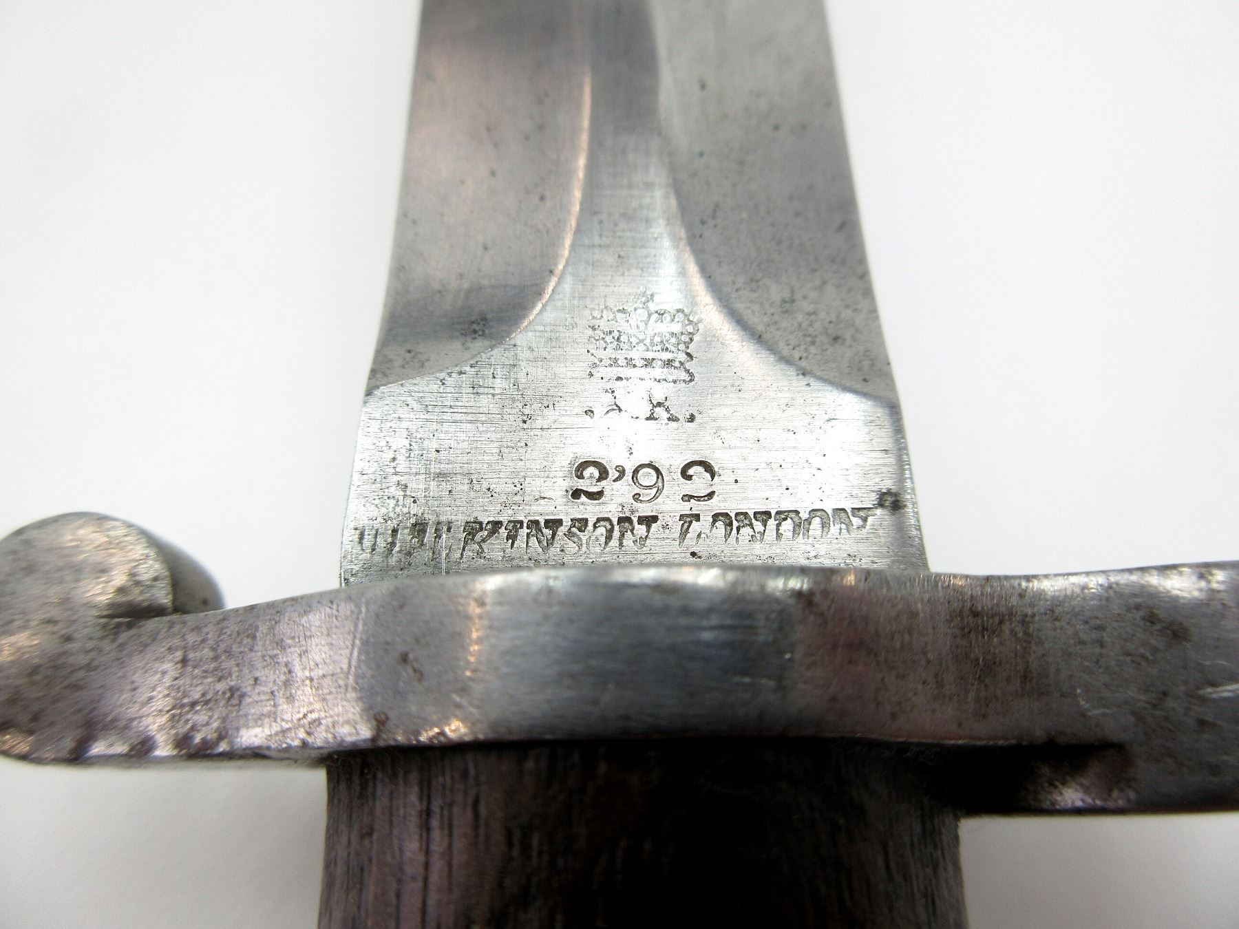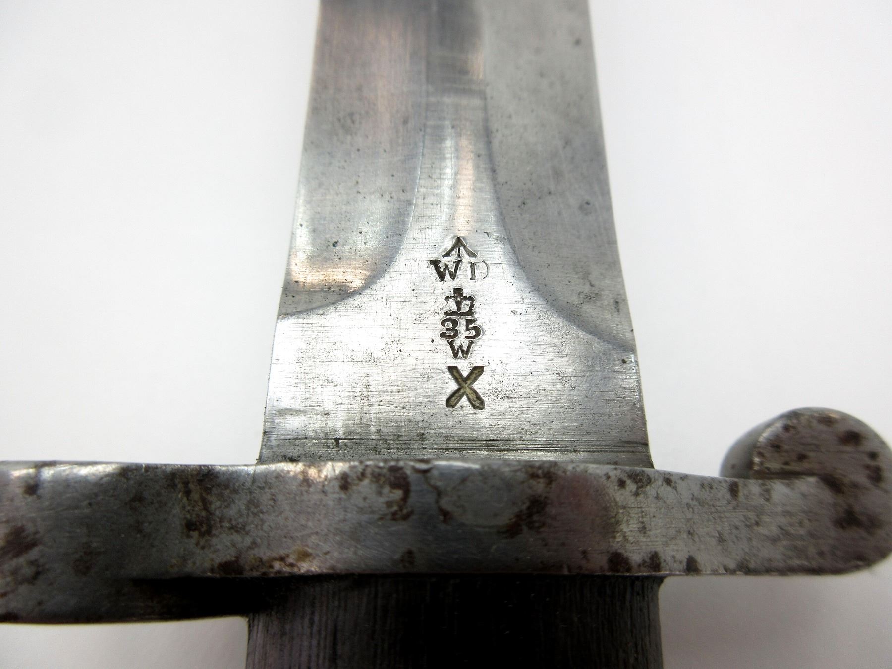 (1) FITS 1888 LEE METFORD & LONG LEE ENFIELD RIFLES, RICASSO MARKED: CROWN OVER "VR" OVER "2 '92" OVER "WILKINSON LONDON", OTHER-SIDE MARKED: BROAD ARROW OVER "WD", CROWN OVER "35" OVER "W" & "X (BEND TEST)", 2-PIECE WOOD GRIP, ONE SIDE MARKED WITH FAINT / UN-CLEAR MARKING, METAL POMMEL, MARKED: "176", CATCH RELEASE IS STUCK, LEATHER & METAL SCABBARD, BOTH METAL ENDS MARKED: CROWN OVER "B9" OVER "E", THROAT MARKED: "176" & "12" CROSSED OUT, BLADE APPROX 12" & OAL APPROX. 16 5/8". SEE PHOTOS.