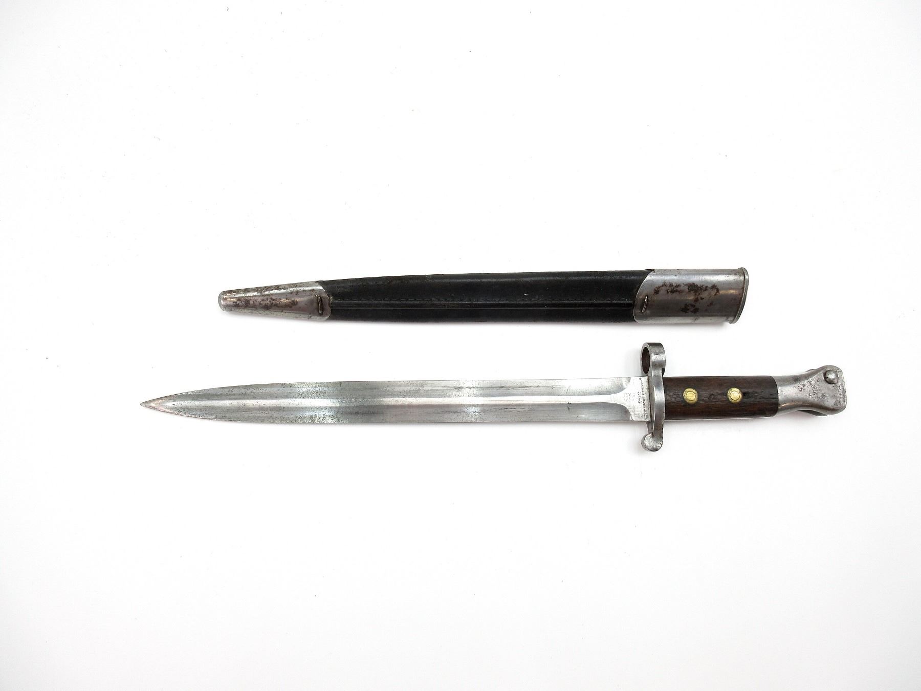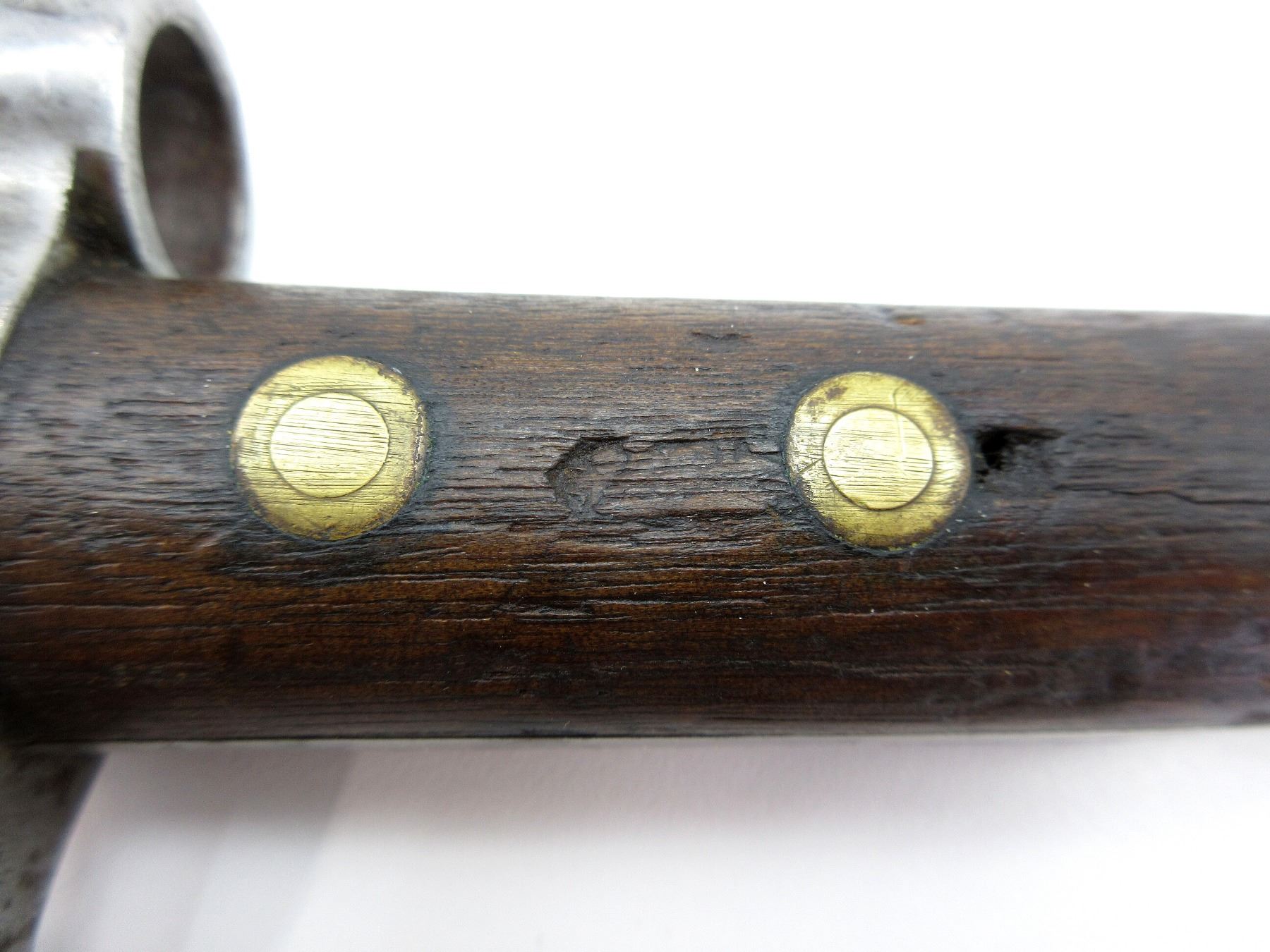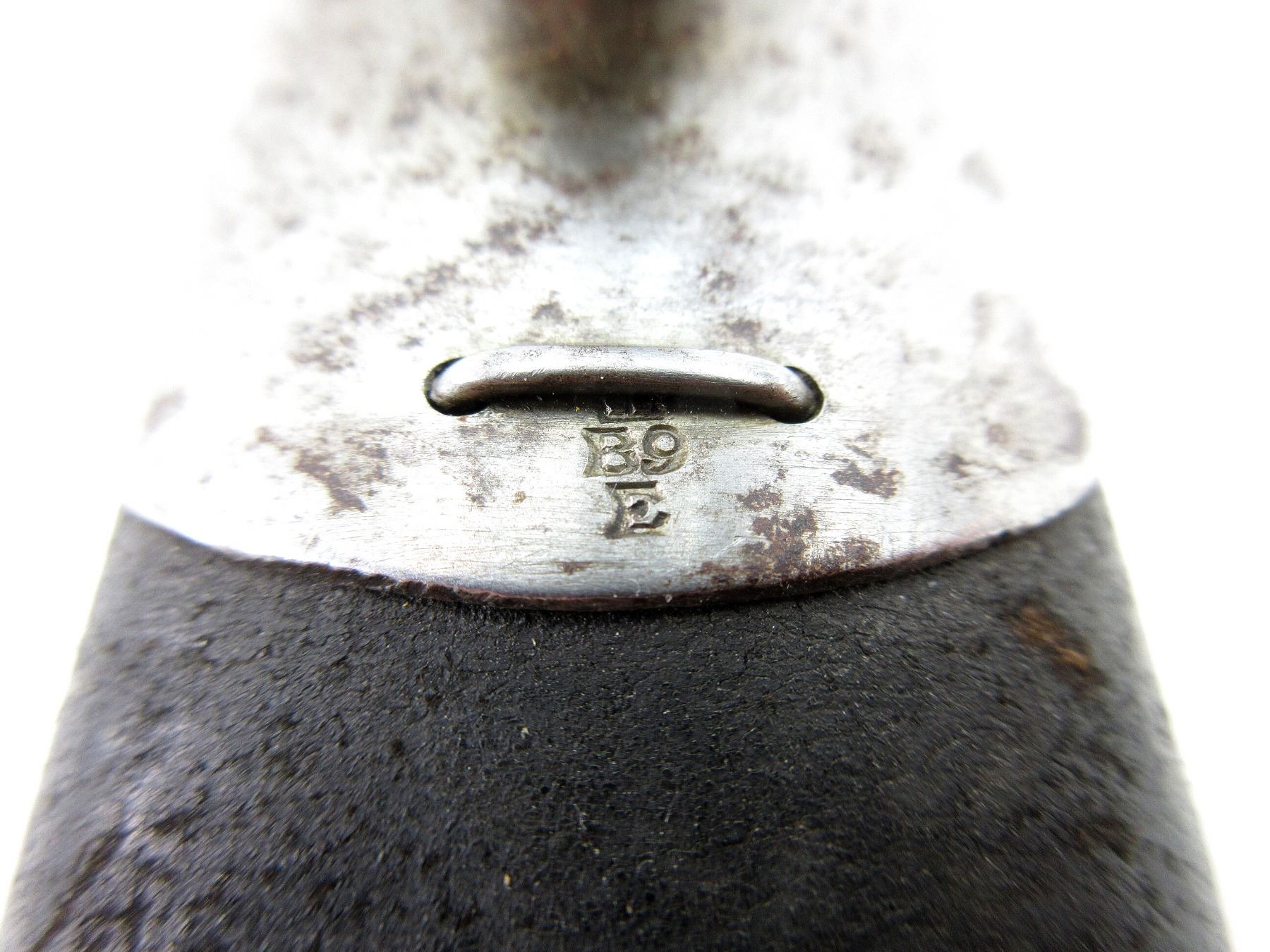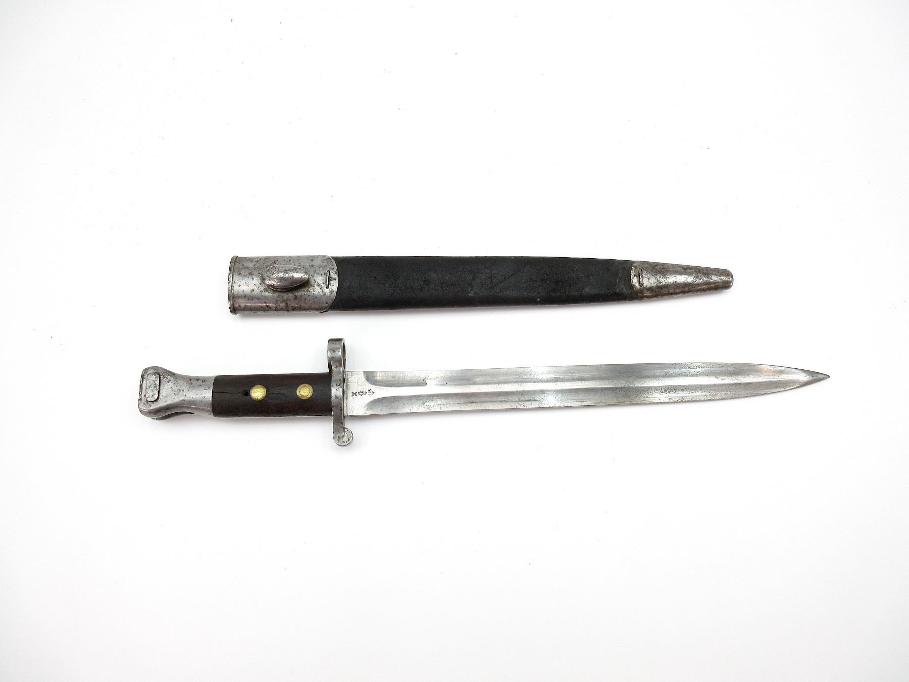 (1) FITS 1888 LEE METFORD & LONG LEE ENFIELD RIFLES, RICASSO MARKED: CROWN OVER "VR" OVER "2 '92" OVER "WILKINSON LONDON", OTHER-SIDE MARKED: BROAD ARROW OVER "WD", CROWN OVER "35" OVER "W" & "X (BEND TEST)", 2-PIECE WOOD GRIP, ONE SIDE MARKED WITH FAINT / UN-CLEAR MARKING, METAL POMMEL, MARKED: "176", CATCH RELEASE IS STUCK, LEATHER & METAL SCABBARD, BOTH METAL ENDS MARKED: CROWN OVER "B9" OVER "E", THROAT MARKED: "176" & "12" CROSSED OUT, BLADE APPROX 12" & OAL APPROX. 16 5/8". SEE PHOTOS.