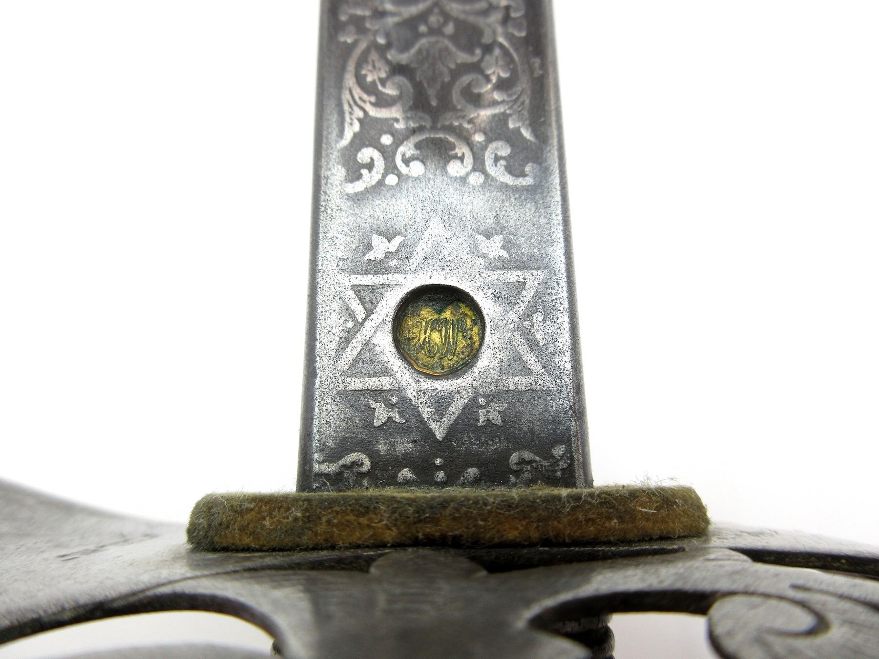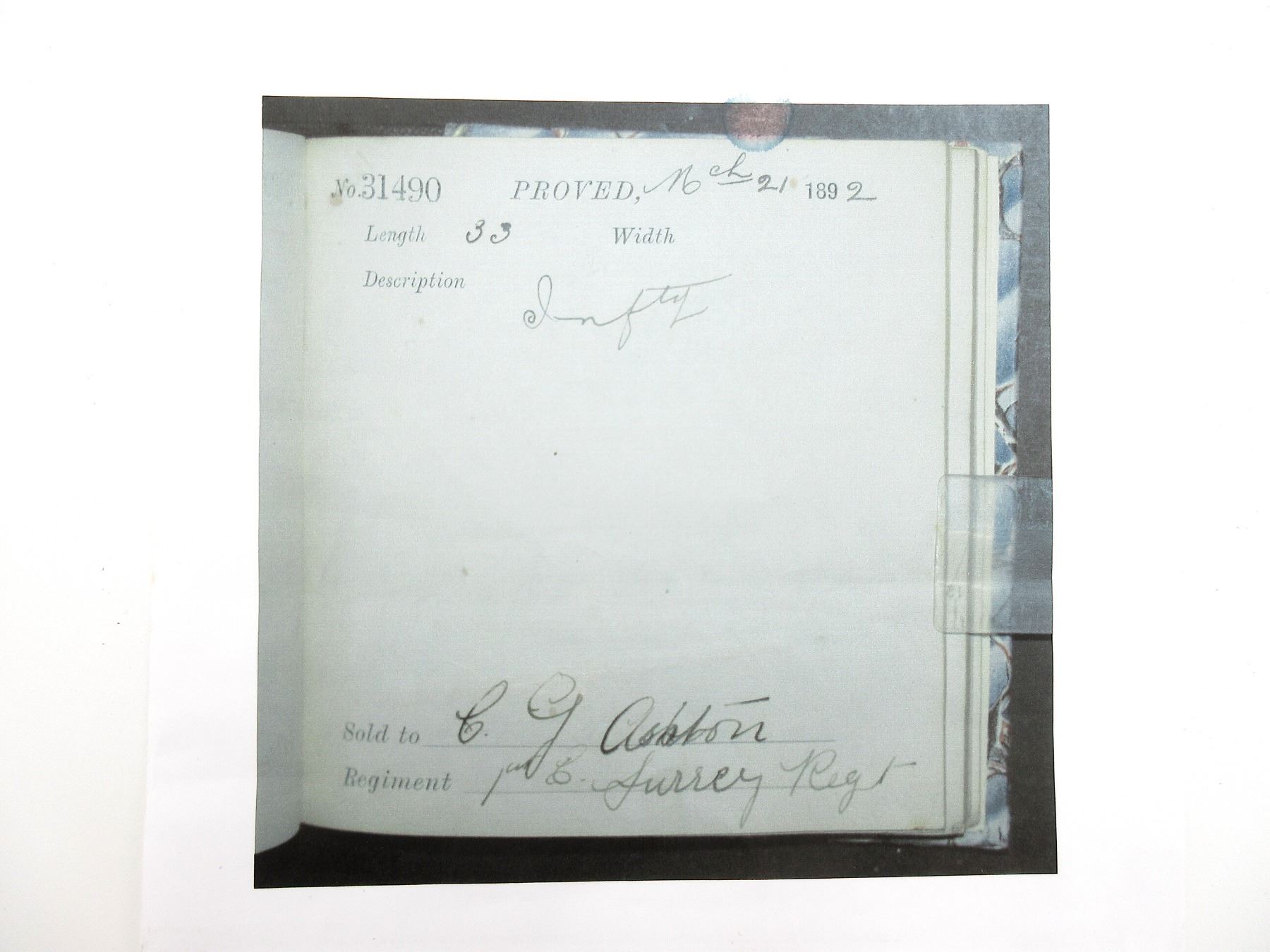 (1) 1892 PATTERN SWORD RE-HILTED WITH 1895 PATTERN HILT, SINGLE-FULLERED BLADE, RICASSO ACID ETCHED: "HENRY, WILKINSON, PALL, ????, LONDON" (PARTIALLY FADED), BLADE ACID ETCHED: "CGA (CHARLES GOUGH ASHTON), CROWN OVER CYPHER & OTHER DECORATIVE ETCHINGS, OTHER-SIDE ACID ETCHED: SIX POINTED STAR WITH "HW" IN THE CENTER, BOARS HEAD CREST WITH "FIDE ET AMORE", CROWN OVER VICTORIA COAT OF ARMS & OTHER DECORATIVE ETCHINGS, BLADE SPINE MARKED: "31490", LEATHER BUFFER PAD / WASHER, DECORATIVE STEEL HILT MARKED: "STEEL HILT" & VICTORIA CYPHER DESIGNED IN HILT, WIRE WRAPPED GRIP, METAL POMMEL, NO VISIBLE MARKINGS, STEEL SCABBARD WITH TWO HANGERS, NO VISIBLE MARKINGS, BLADE APPROX. 32.25", OAL APPROX. 38 1/8" & (1) SET OF RESEARCH PAPERS DETAILING THE SWORD, PROVING THE SWORD TO HAVE BELONGED TO CHARLES GOUGH ASHTON & DETAILING CHARLES GOUGH ASHTON & HIS MILITARY CAREER. SEE PHOTOS.