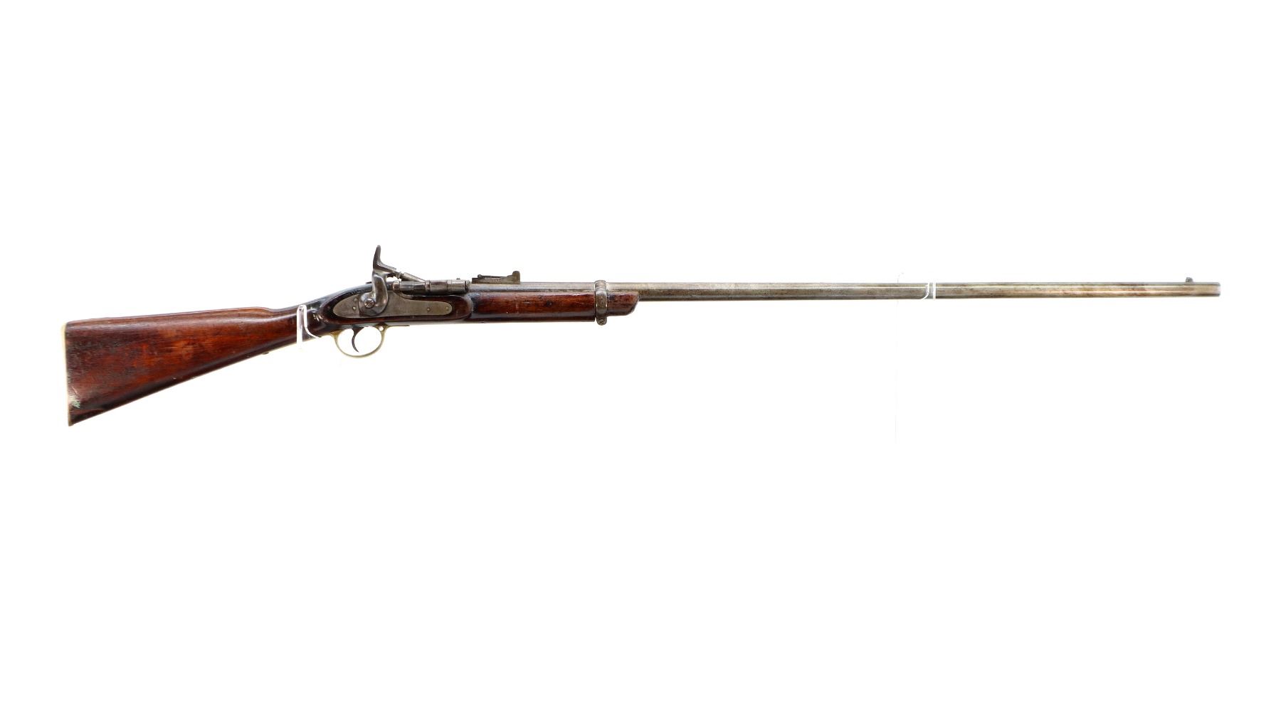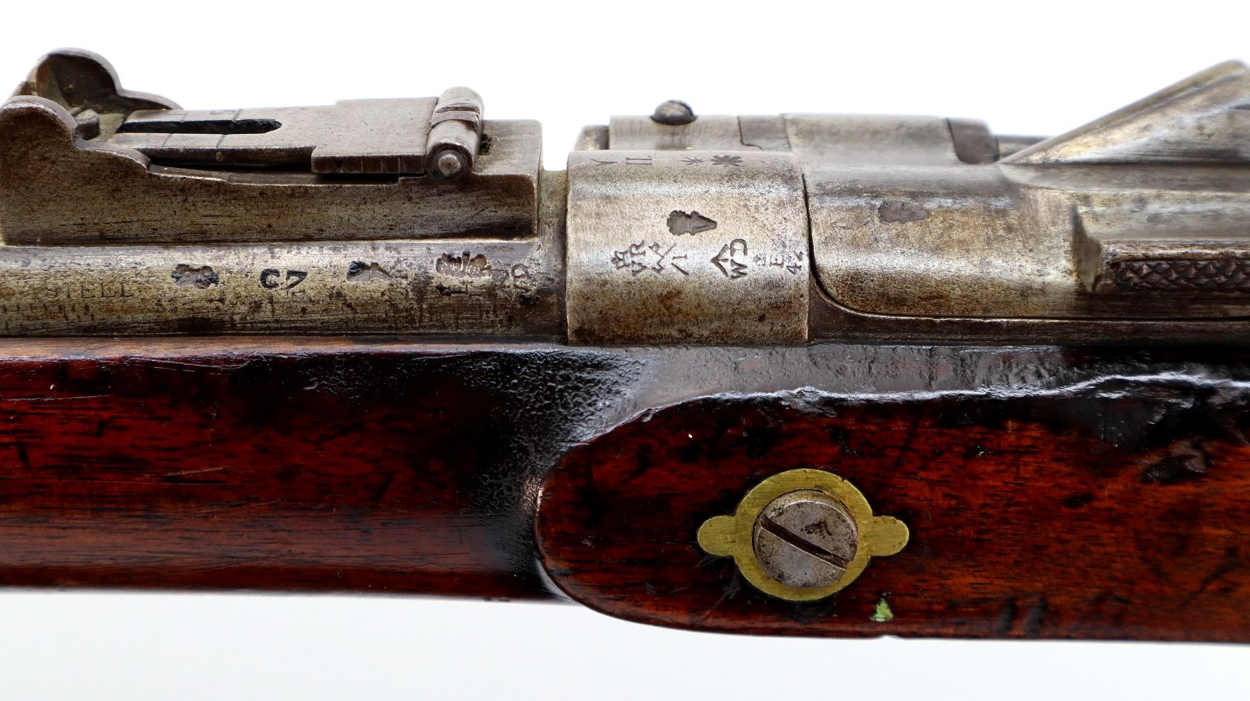 Main Description: Manufactured by Tower 1855. Blade front sight with ramp, adjustable u notched rear sight, firing pin and retainer are damaged, breech block does not open, lock marked Crown VR with checkered spur hammer that functions. One piece sporterized wood stock, straight grip, smooth brass butt plate with unmarked tang, stock cracked and repaired at toe.