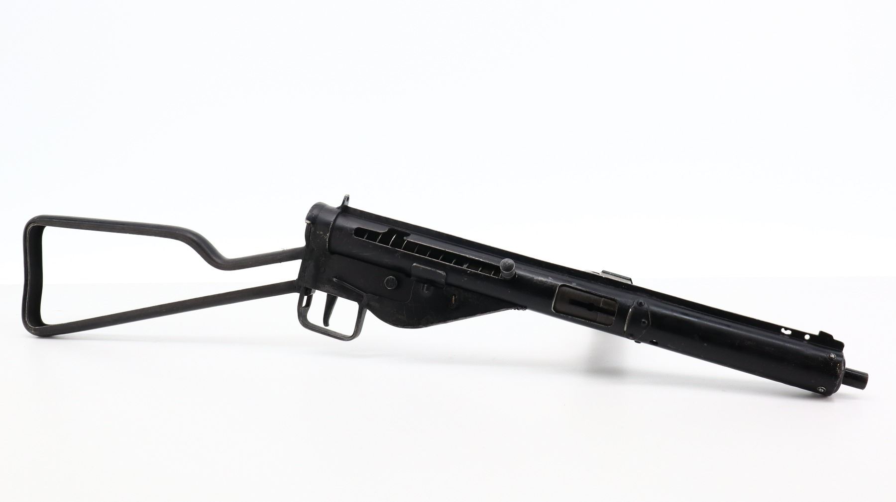 5/10 DEACTIVATED, BRITISH STEN , MODEL: MKIII, CALIBER: 9MM LUGER , BLADE FRONT SIGHT. FIXED REAR PEEP SIGHT. RECEIVER STAMPED BLANK ONLY. BOLT MOVES. TRIGGER DOES NOT FUNCTION. LOOP TYPE BUTT STOCK. MAG IS REMOVEABLE. METAL FINISH SHOWS SCRATCHES, HANDLING MARKS AND WEAR. ACTION: DEACTIVATED , BARREL LENGTH: NA , SERIAL # 66117, CLASS: CANADIAN DEACTIVATE, NO LICENSE REQUIRED, CONDITION: 5/10 DEACTIVATED