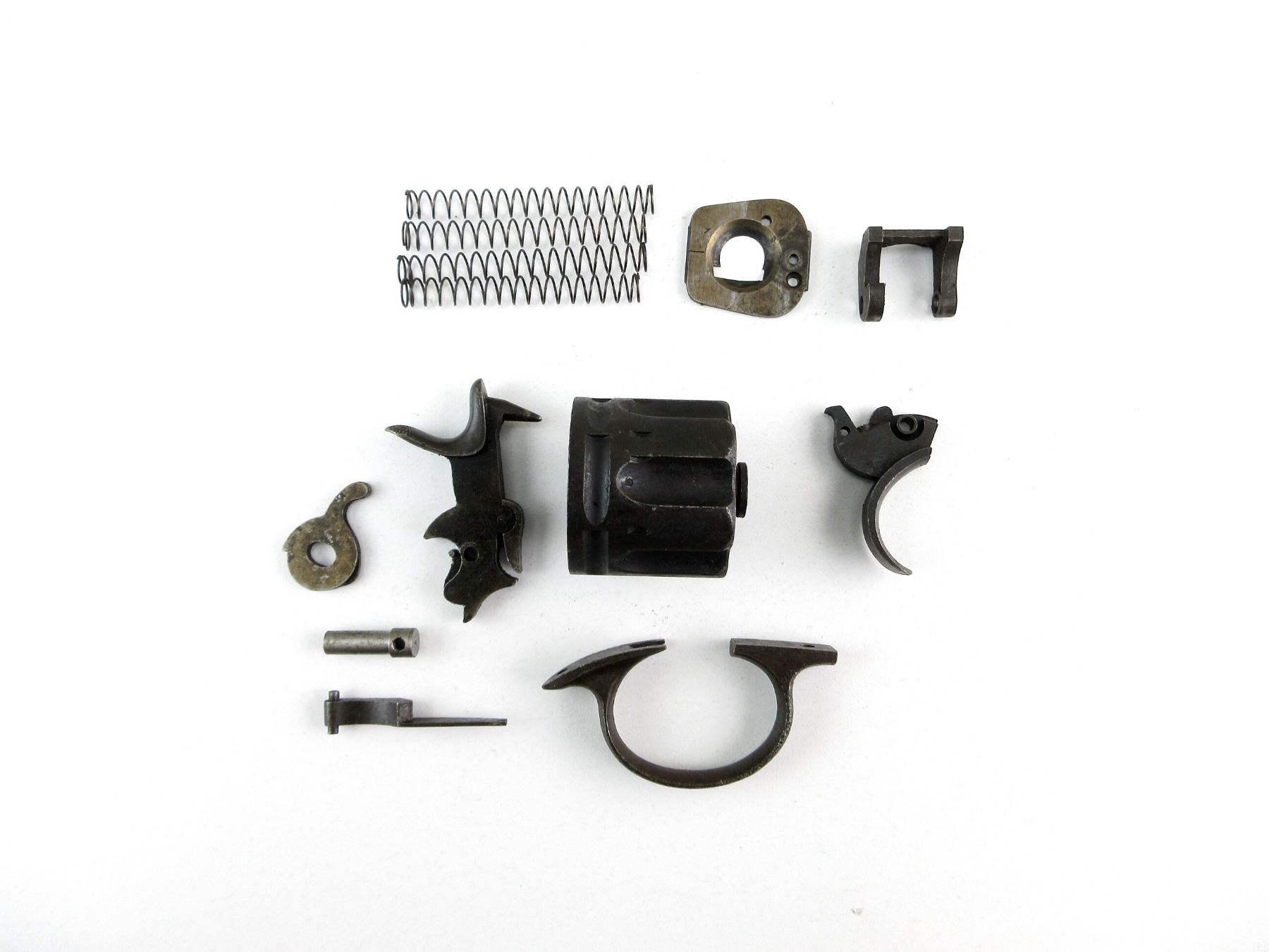 FITS .455 WEBLEY LARGE FRAME, LOT INCLUDES; HAMMER ASSEMBLY, TRIGGER, TRIGGER GUARD, RECOIL PLATE, EXTRACTOR LEVER, CYLINDER CAM, AUXILIARY MAINSPRING, (4) EXTRACTOR SPRINGS, (1) .455 CYLINDER, ETC. MAY REQUIRE FITTING. SEE PHOTOS.