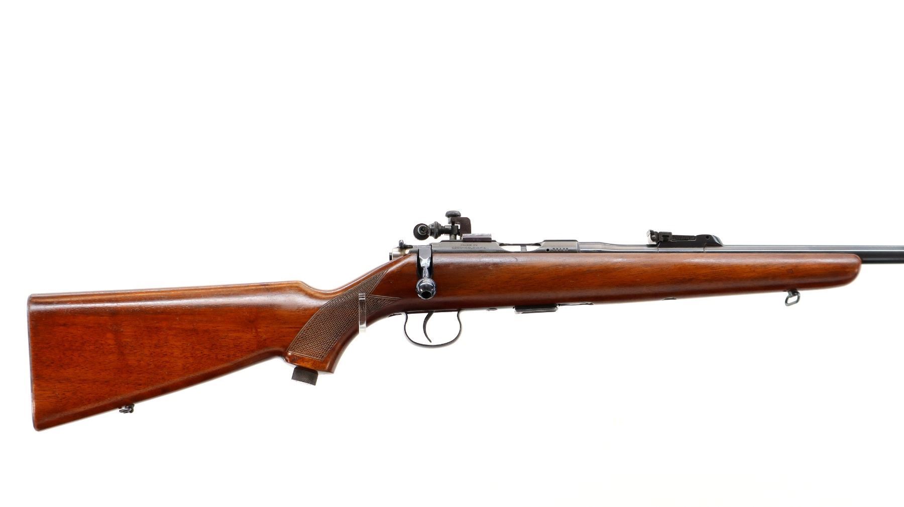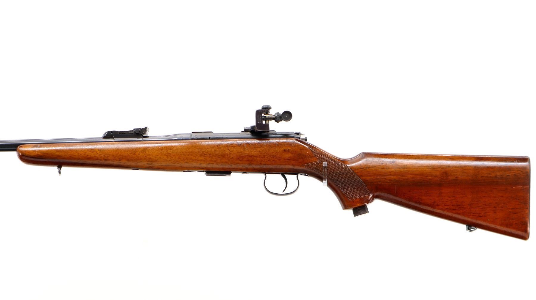 Main Description: Globe front sight with insert and ramp, adjustable u notched rear sight, blued finish, receiver has integral scope bases with custom Parker Hale PH16N adjustable peep sight installed. One piece wood stock, checkered pistol grip and steel butt plate, globe sight container on bottom of grip with 6 spare inserts, sling swivels.