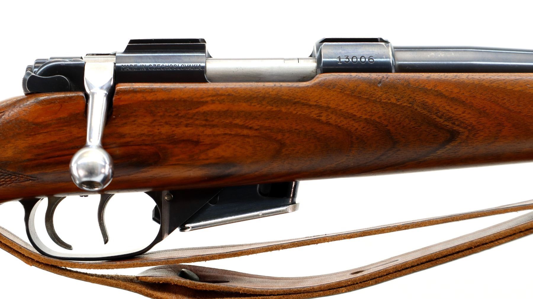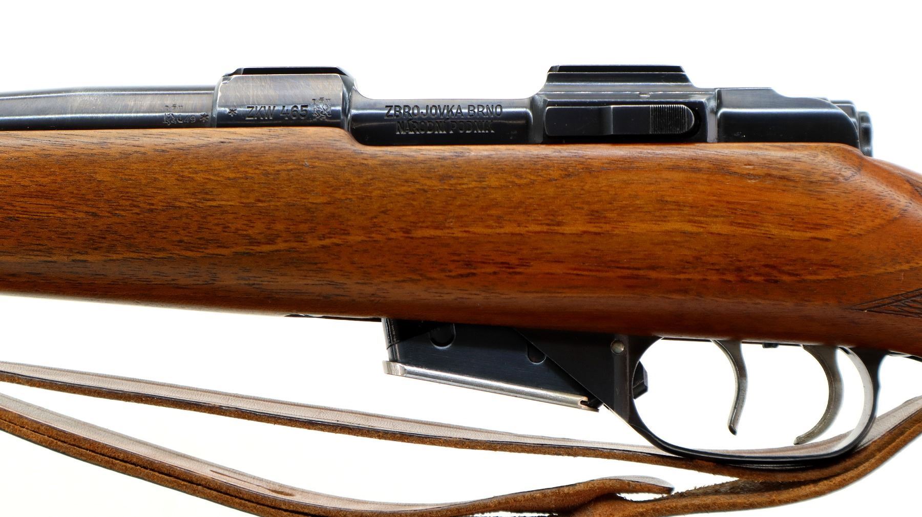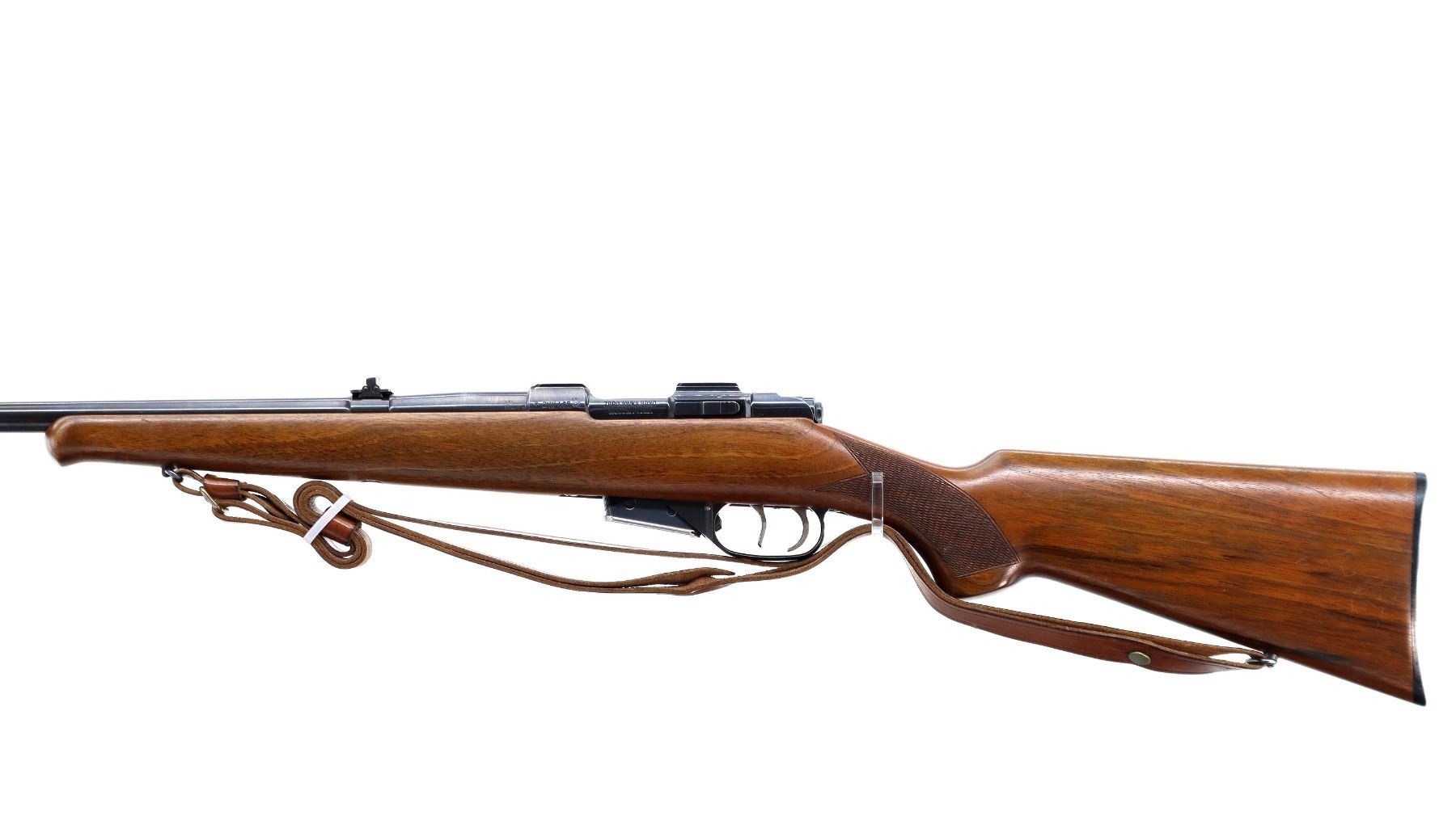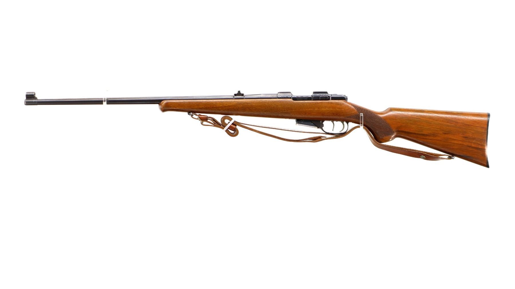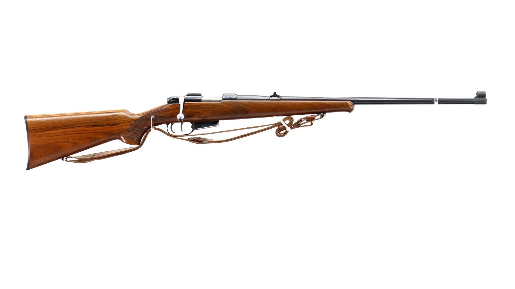 Main Description: Blade front sight with hood and ramp, adjustable u notched rear sight with one fixed and two folding leafs, blued finish, receiver has integral scope bases, double set triggers. One piece wood stock, Schnabel forend tip, checkered pistol grip, grooved black polymer butt plate, sling swivels with brown leather sling.
