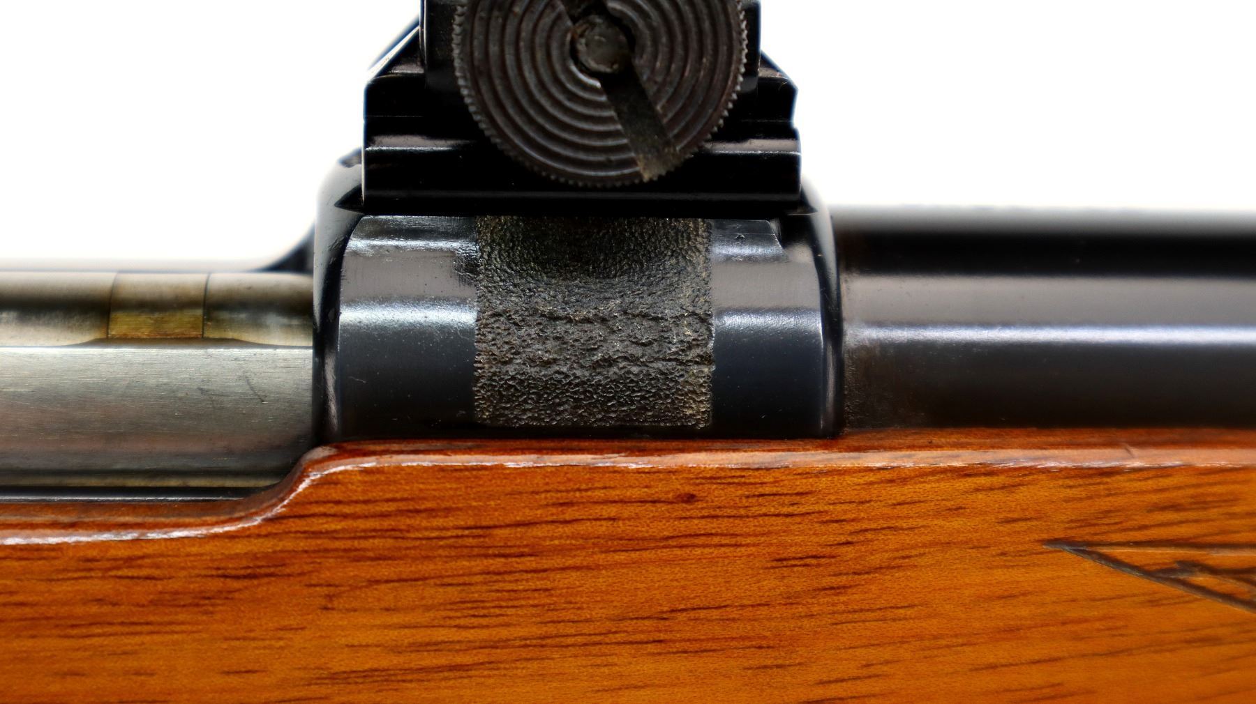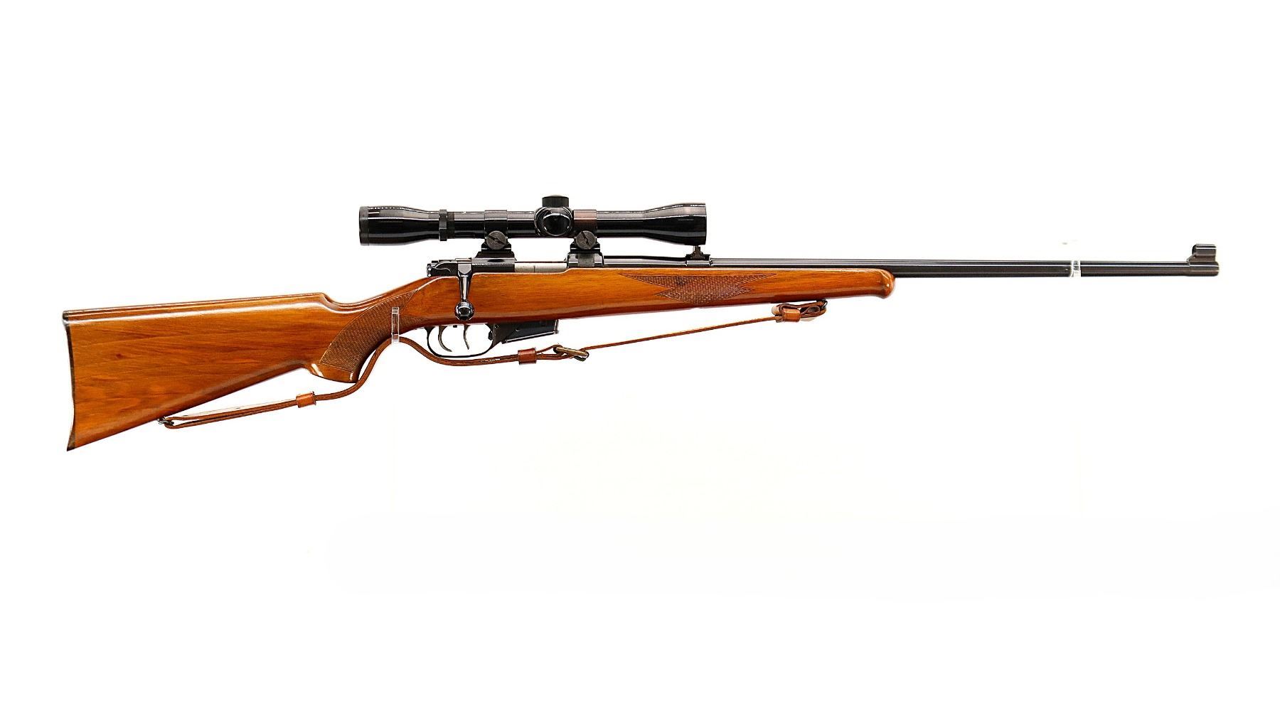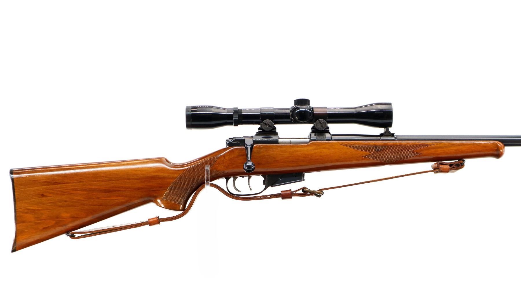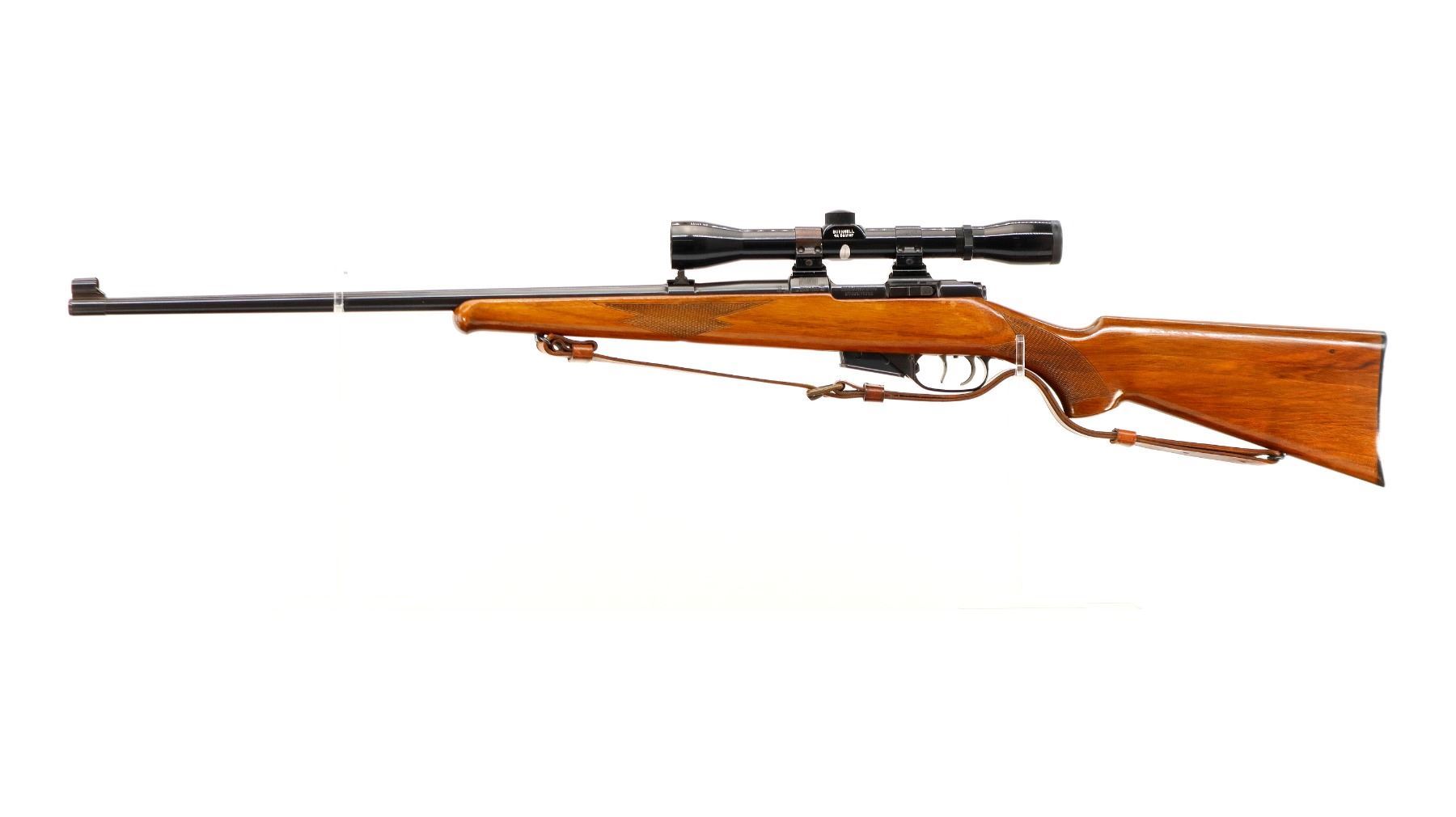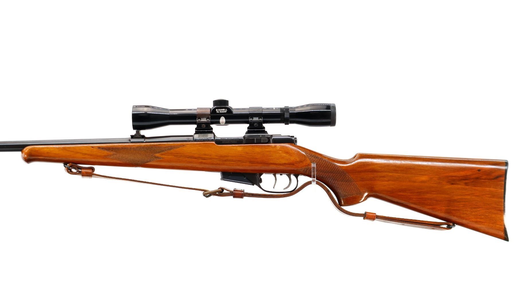 Main Description: Blade front sight with hood and ramp, adjustable u notched rear sight with one fixed and two folding leafs, blued finish, receiver has integral scope bases with Bushnell 4x Banner scope installed, clear optics with duplex crosshair. Double set triggers. One piece wood stock, Schnabel forend tip, checkered forearm and pistol grip, grooved black polymer butt plate, sling swivels with brown leather sling.