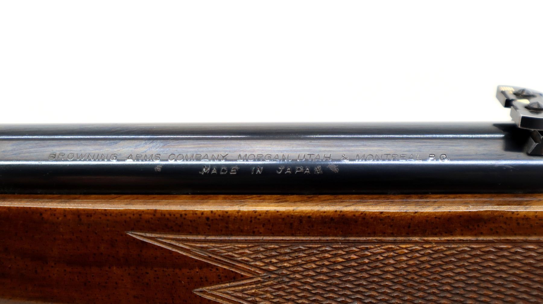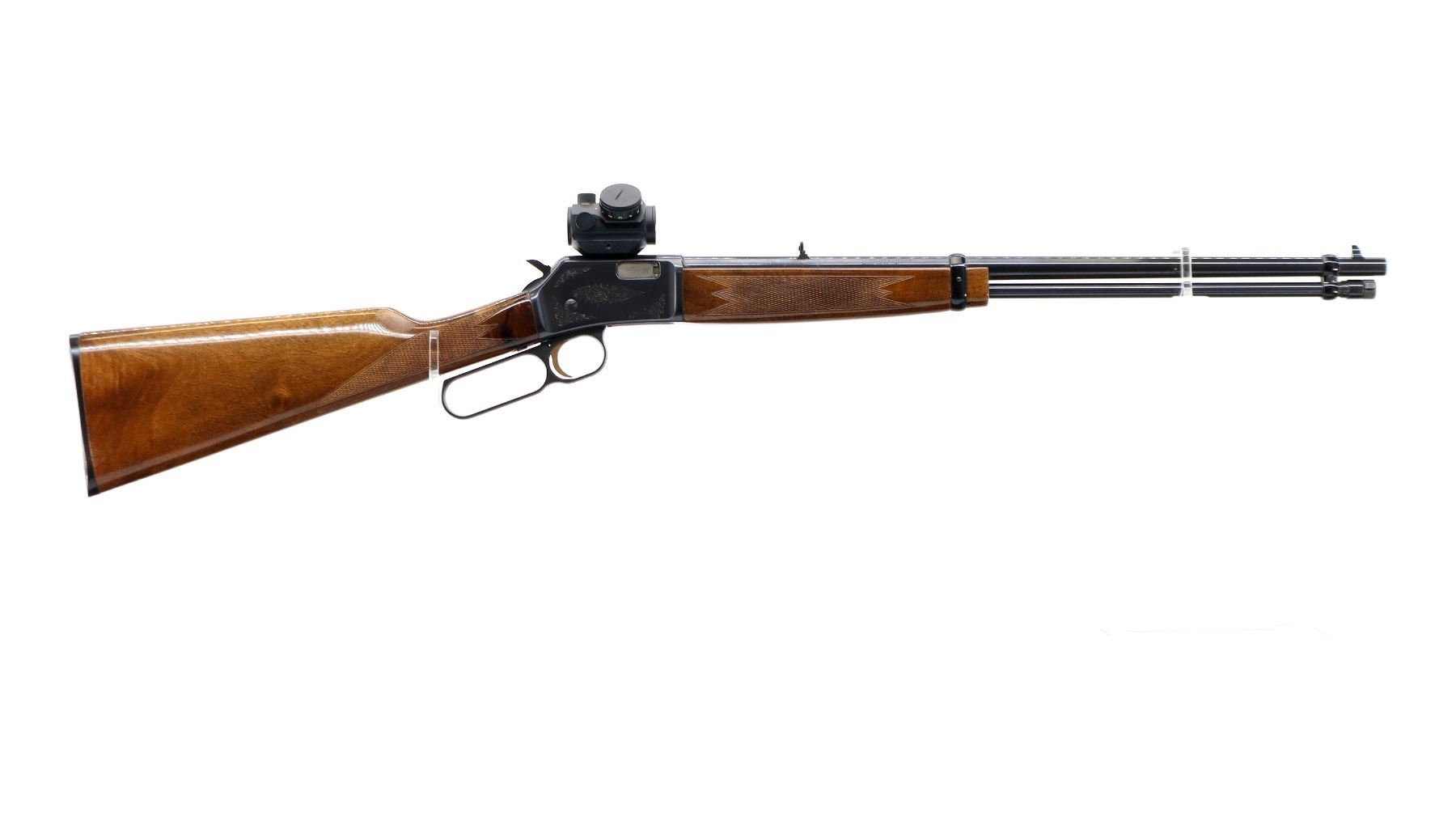 Main Description: Blade front sight, adjustable folding (spring broken) u notched rear sight, Polish blued finish, engraved grooved receiver with Bushnell Red dot installed, clear optics (functions). Two piece wood stocks, checkered forearm and straight grip, Browning logo black polymer butt plate, gold trigger, full length magtube.