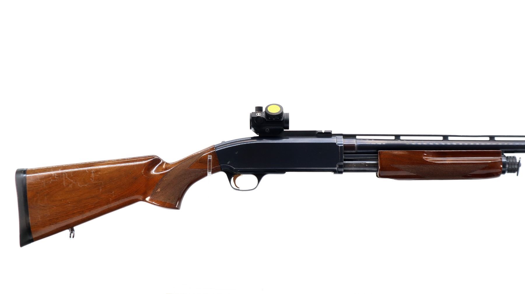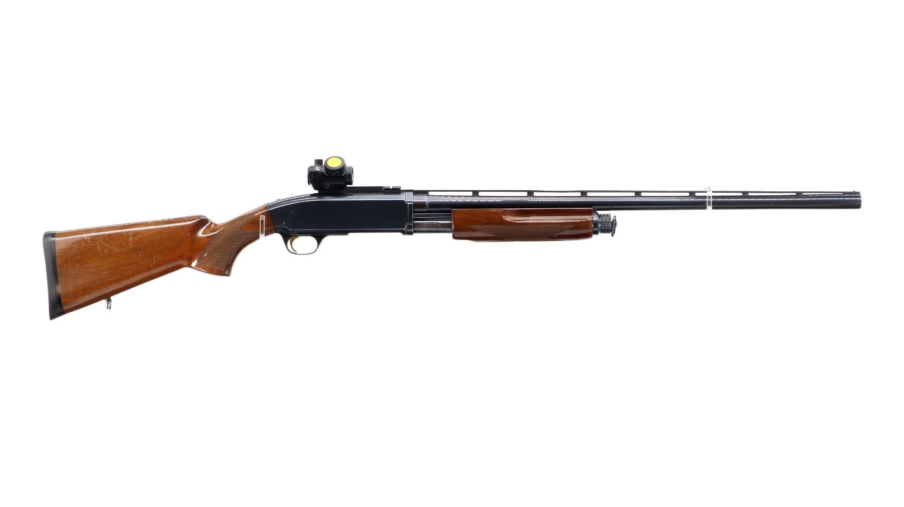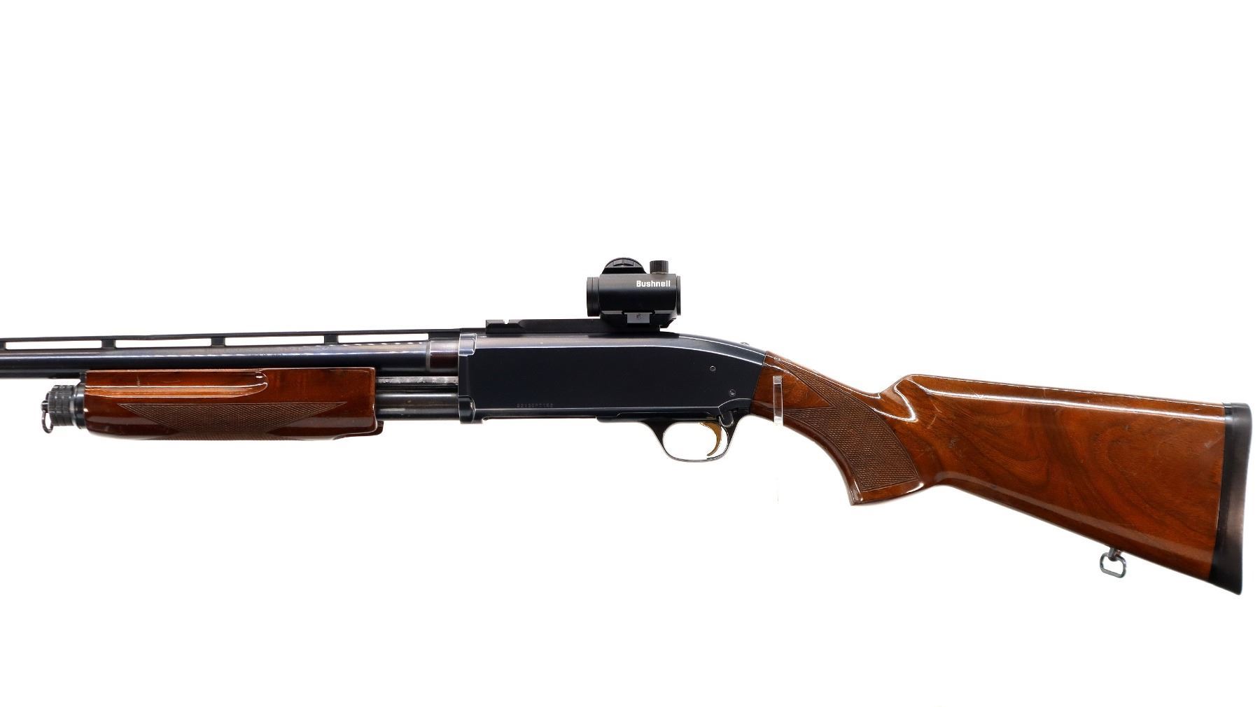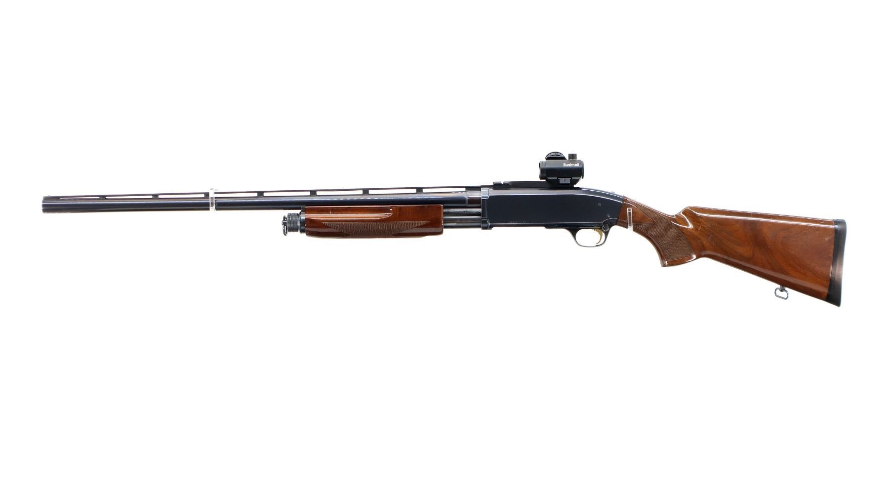 Main Description: Silver bead, blued finish, vent rib dented in the middle with two threaded holes at the front, receiver drilled and tapped with Bushnell Red dot installed, clear optics (functions). Two piece wood stocks, finger grooved checkered forearm and pistol grip, black rubber recoil pad, gold trigger, sling swivels.