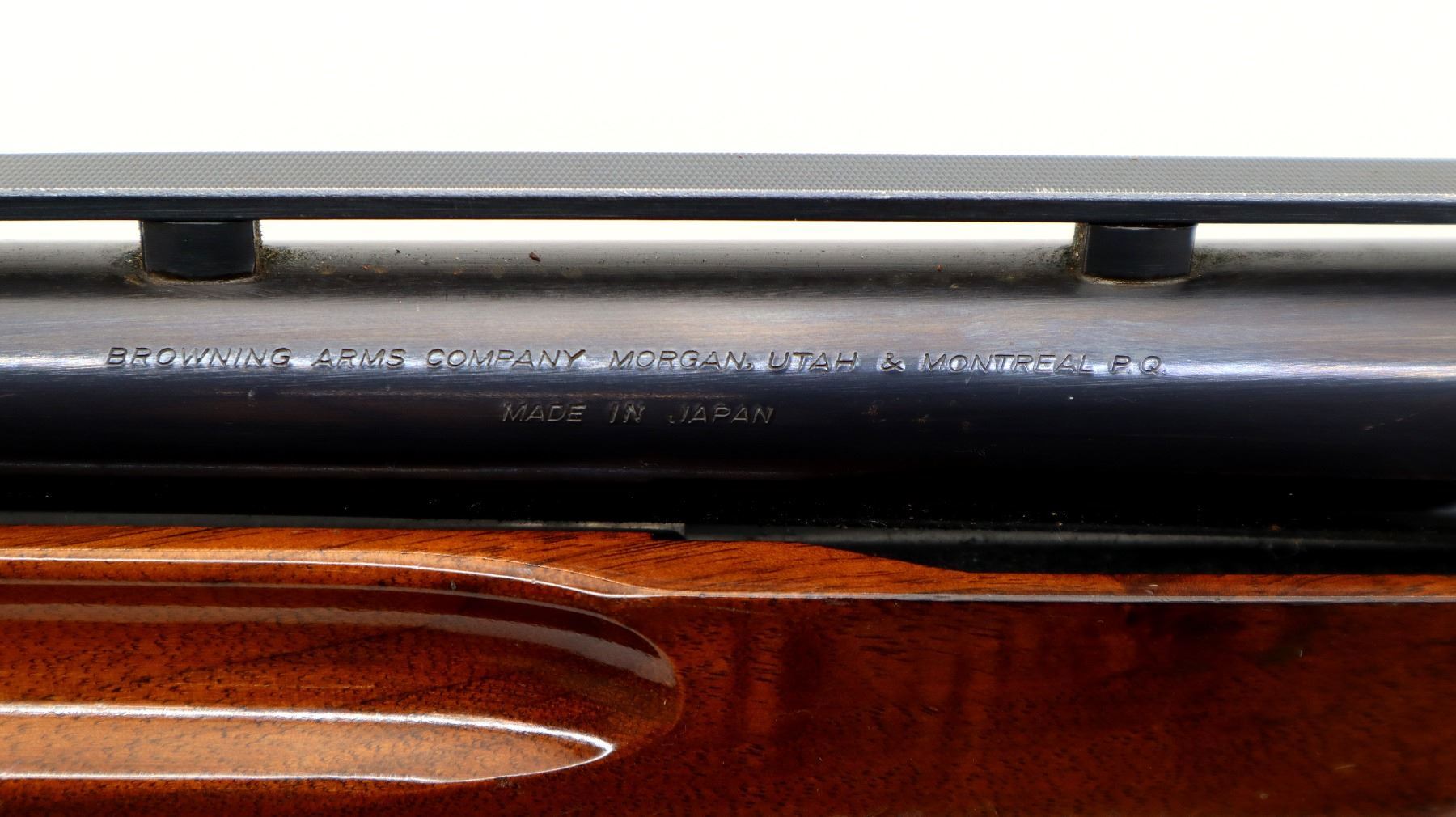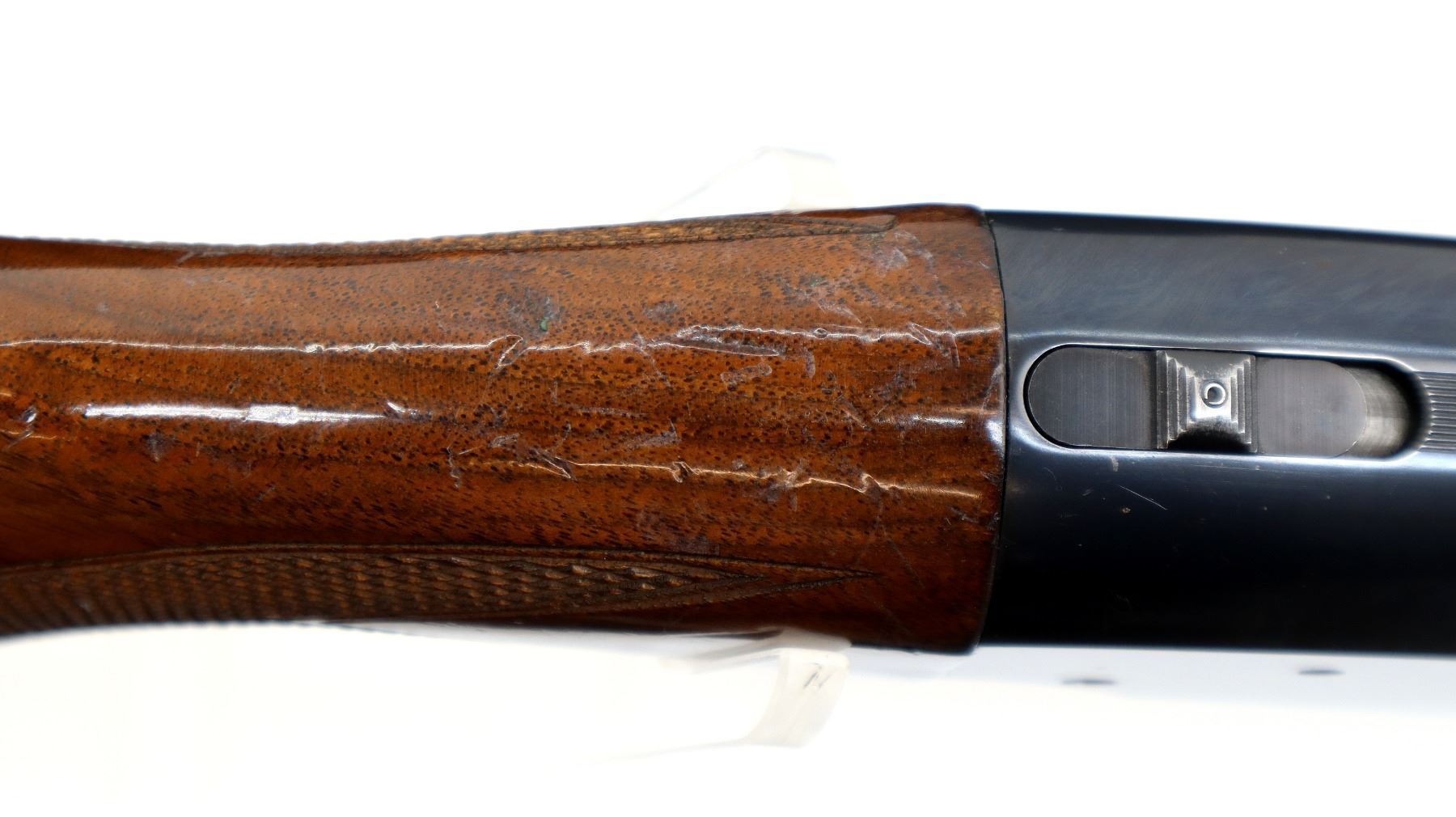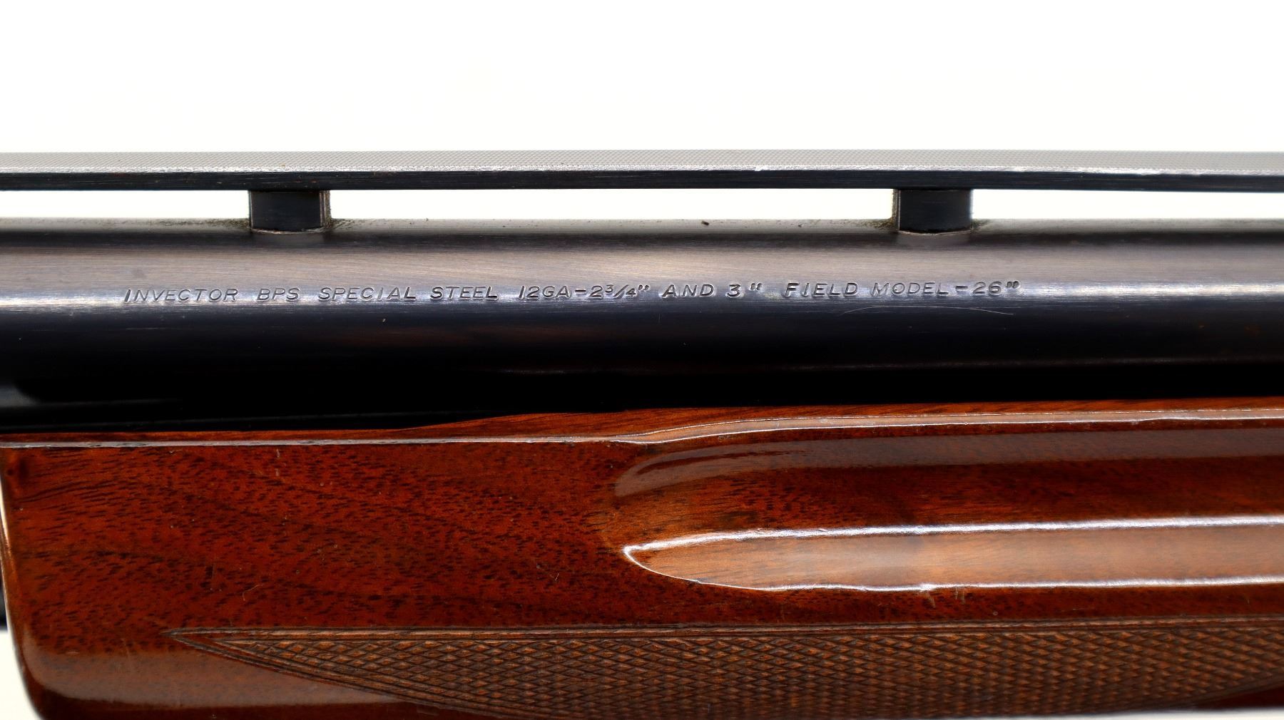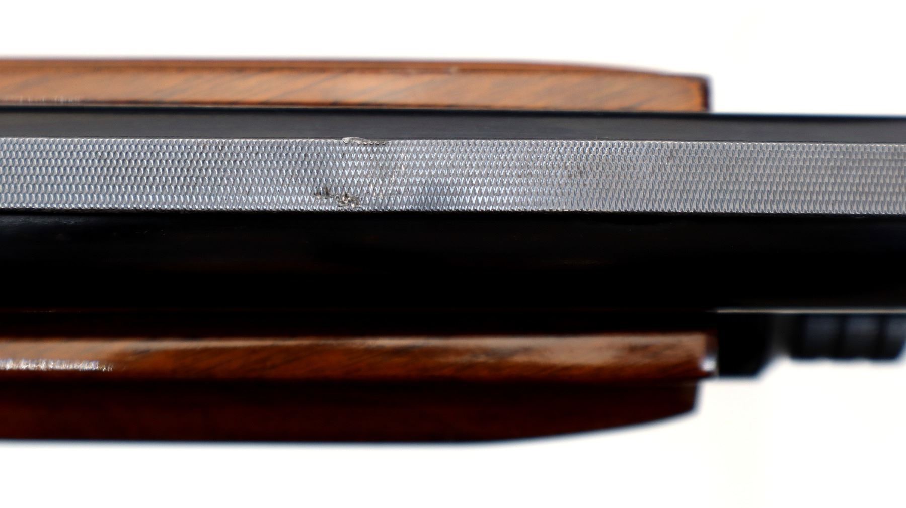 Main Description: Silver bead, blued finish, vent rib dented in the middle with two threaded holes at the front, receiver drilled and tapped with Bushnell Red dot installed, clear optics (functions). Two piece wood stocks, finger grooved checkered forearm and pistol grip, black rubber recoil pad, gold trigger, sling swivels.