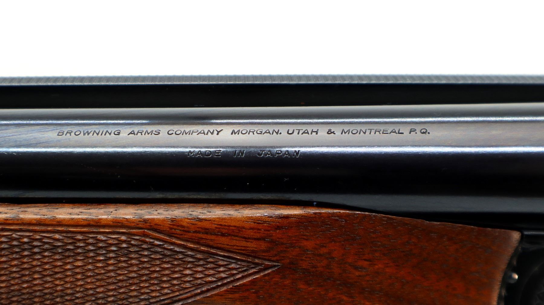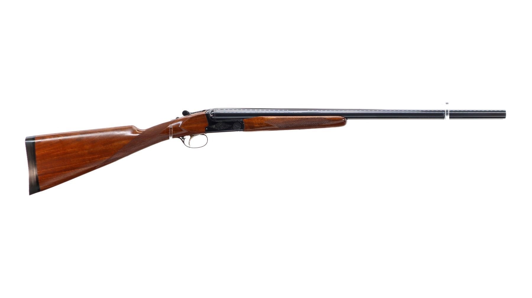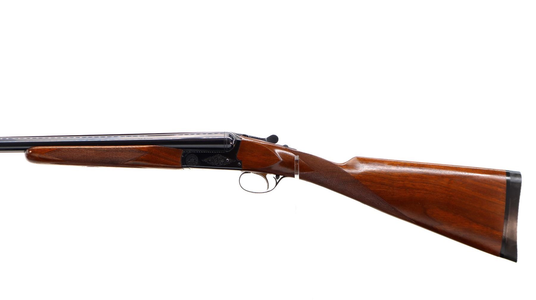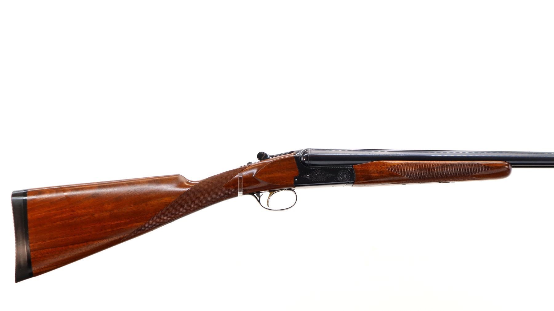 Main Description: Silver front and mid rib beads, polish blued finish, raised rib, engraved receiver, manual safety, ejectors, single silver mechanical trigger with barrel selector at back of trigger guard. Two piece wood stocks, checkered Beavertail forearm and straight grip, black rubber recoil pad.