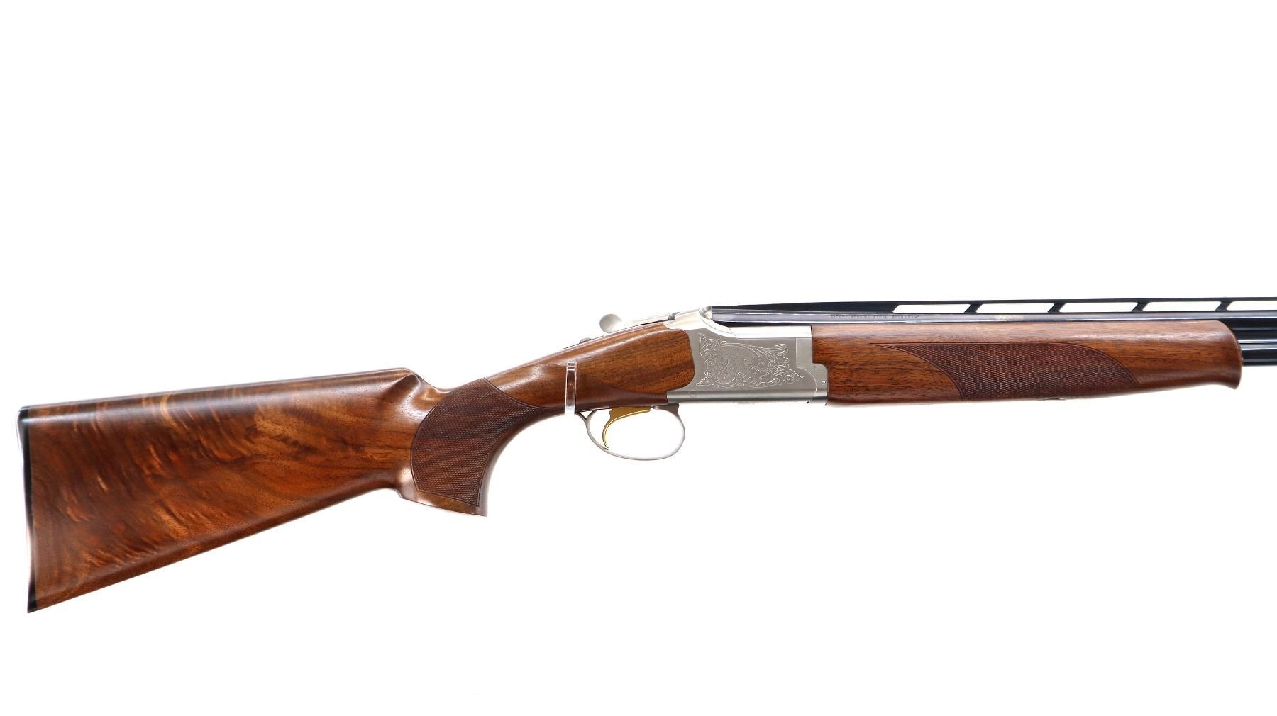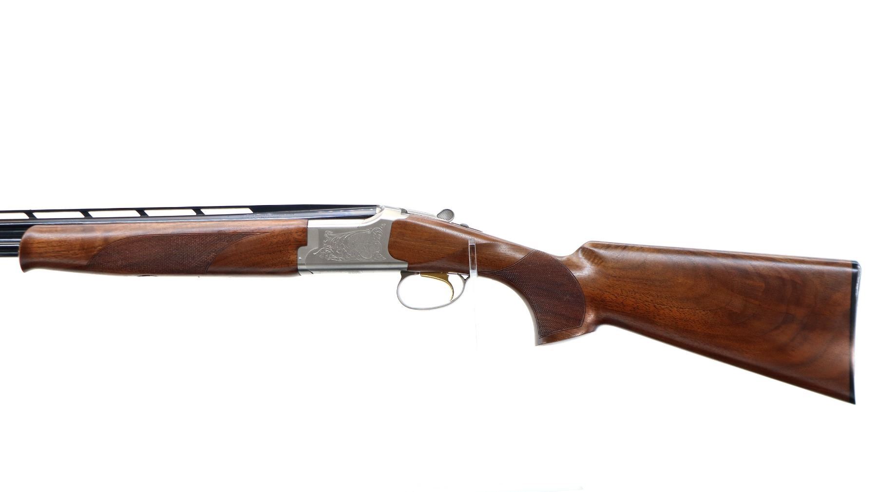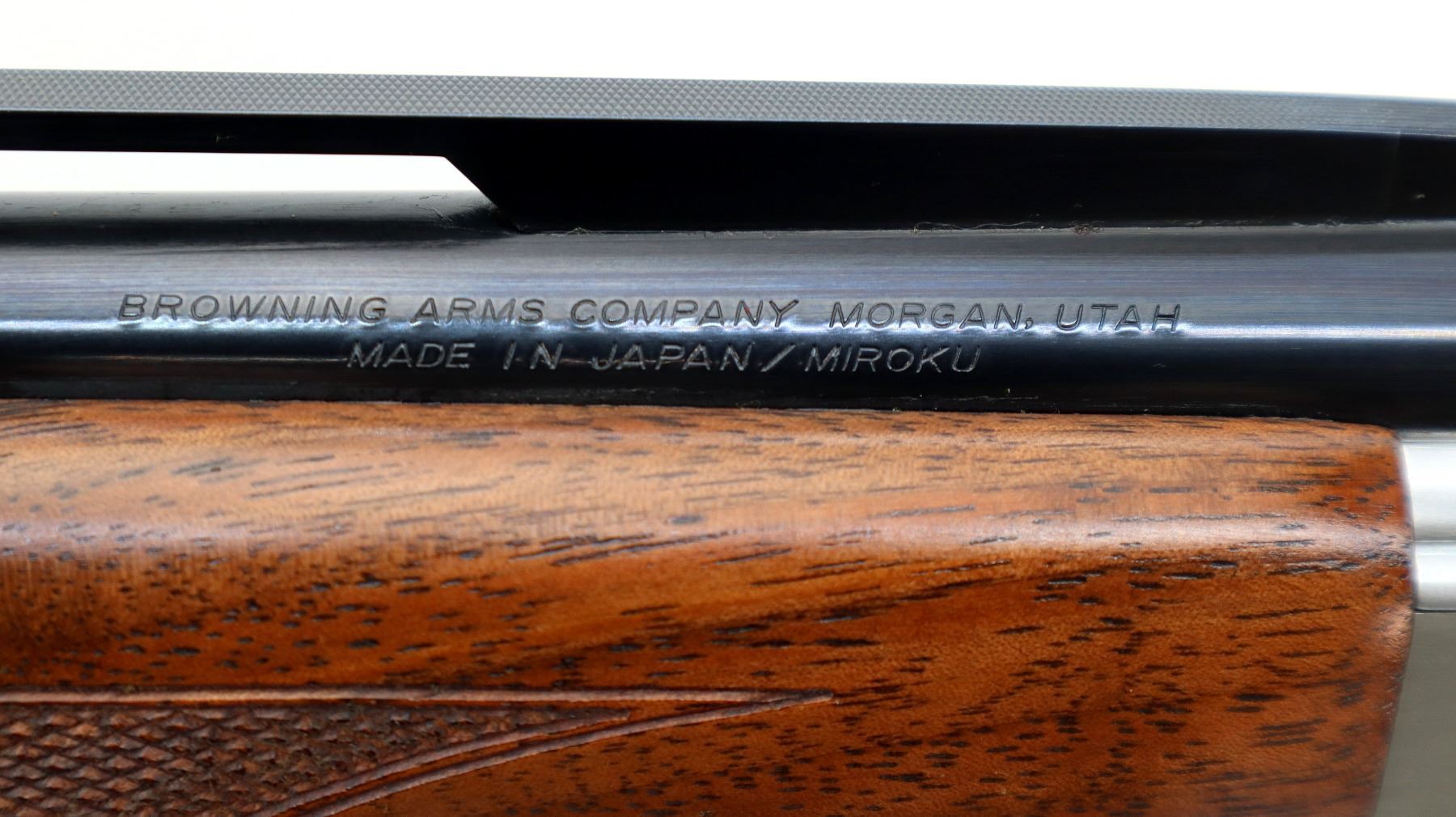 Main Description: May have been test fired in factory. White front and Mid rib beads, polish blued barrels with raised vent rib, engraved silver receiver, manual selective safety, ejectors, single gold inertia trigger. Two piece Satin finish wood stocks, checkered forearm and pistol grip, black polymer Browning logo butt plate.