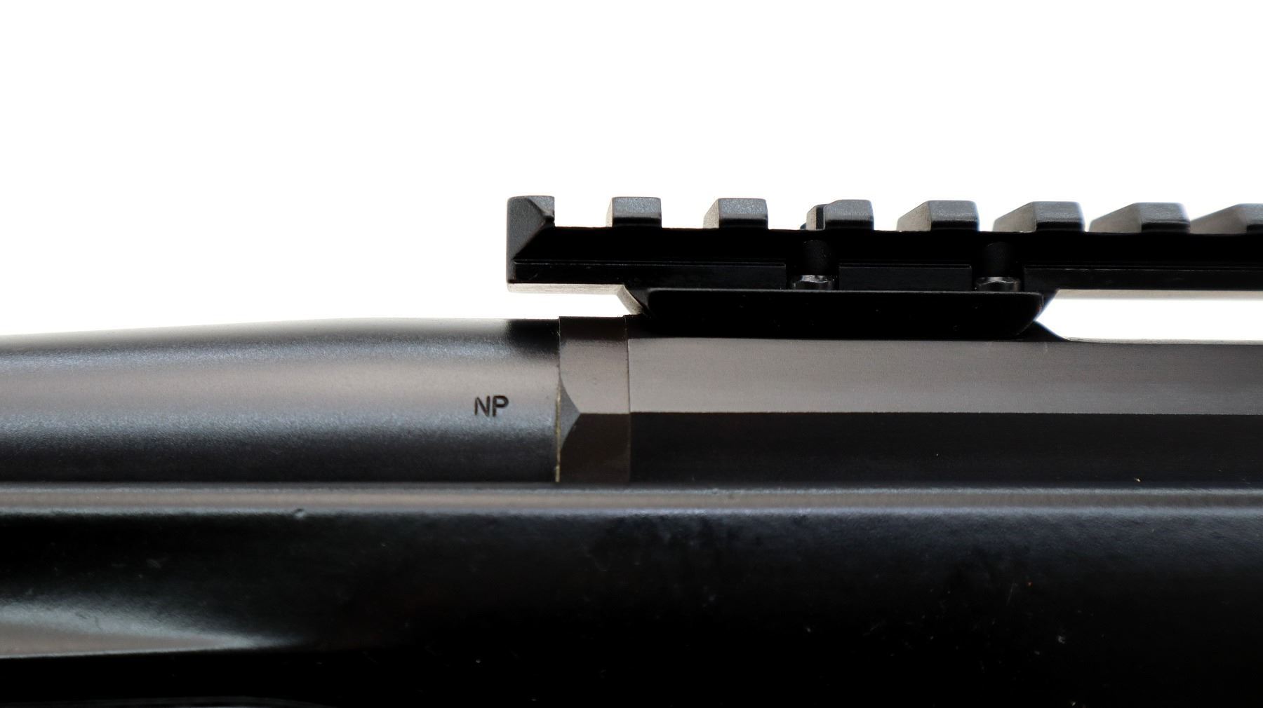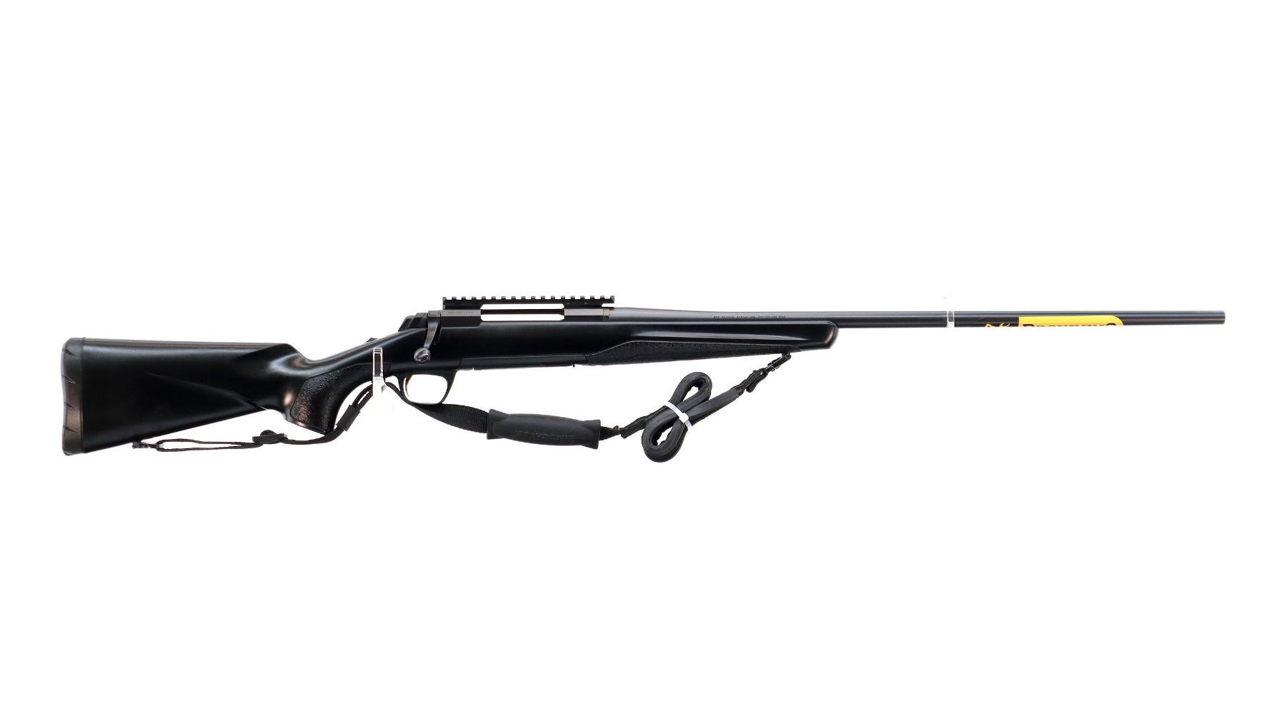 Main Description: No sights, Parkerized metal finish, tapered barrel, receiver drilled and tapped with one piece scope rail installed, fluted bolt with flat sided knob, tang safety. One piece black synthetic stock, textured forearm and pistol grip panels with right hand palm swell, black rubber recoil pad, grip cap, gold trigger, sling swivels with black nylon sling. Barrel has factory sticker on it.