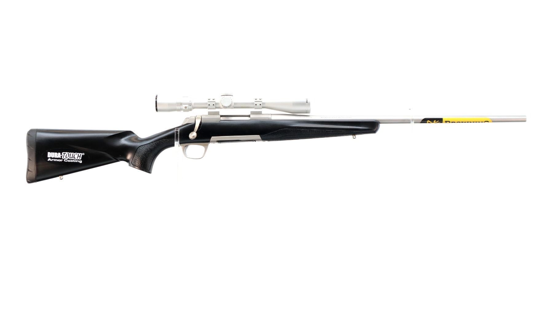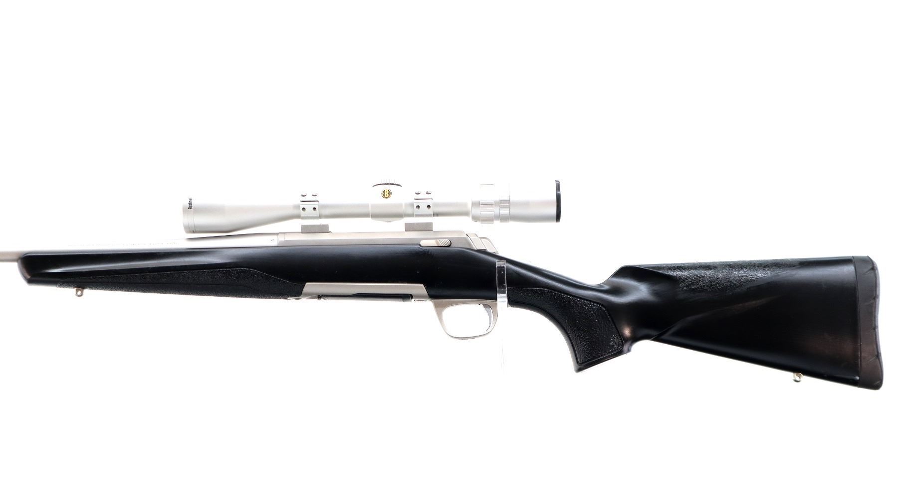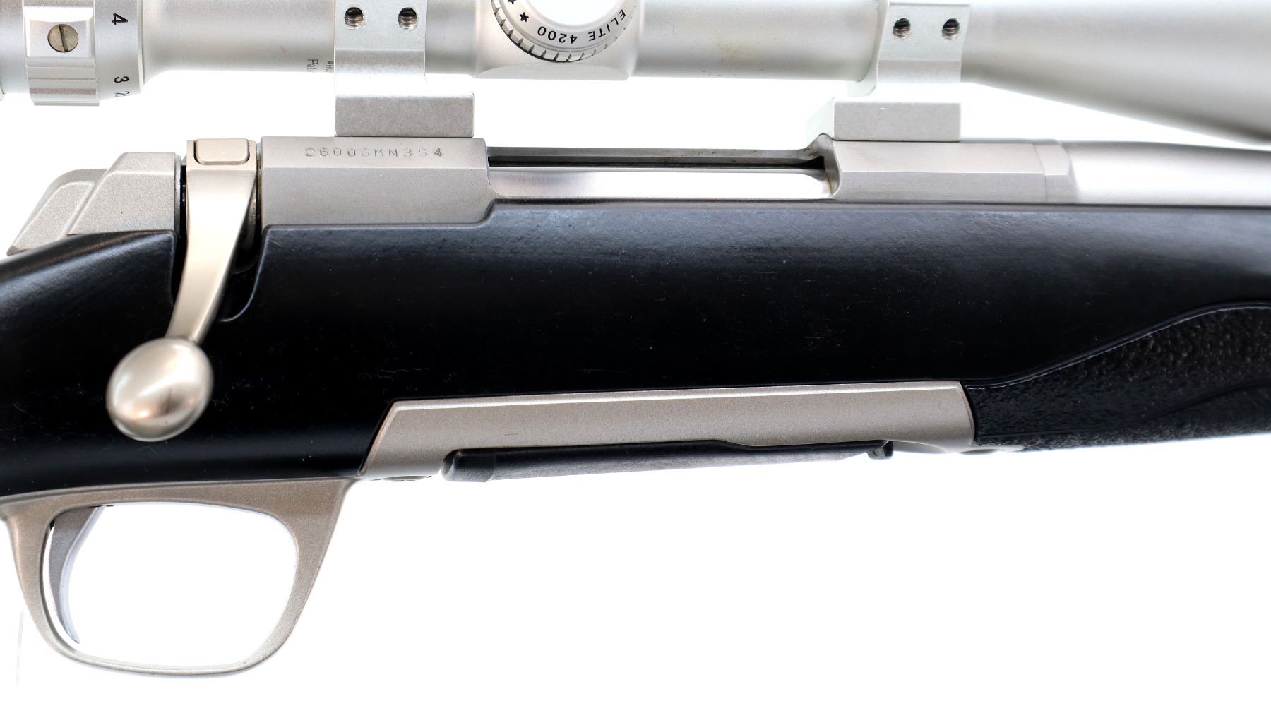 Main Description: No sights, stainless finish, receiver drilled and tapped with silver Bushnell Elite 4200 2.5-10x40 scope installed, clear optics with duplex crosshair. Fluted bolt with flat knob, tang safety. One piece Duratouch black synthetic stock, textured forearm and pistol grip panels with right hand palm swell, black rubber recoil pad, grip cap, swivel studs, retains factory stickers.