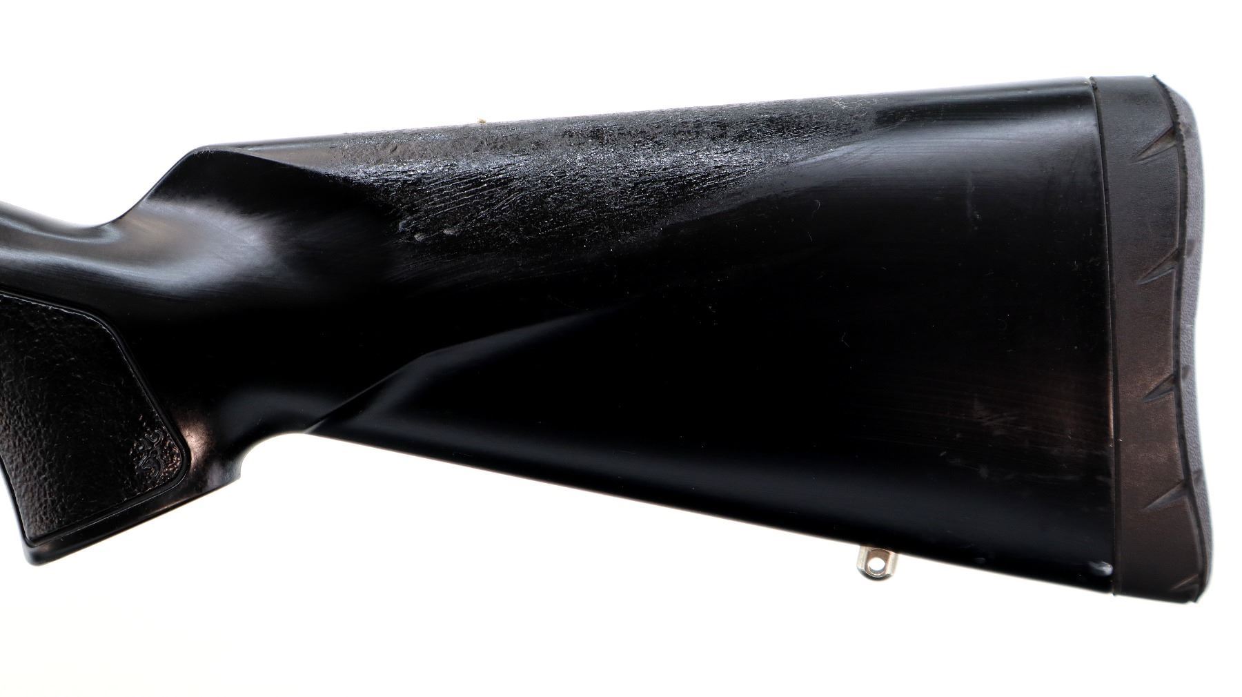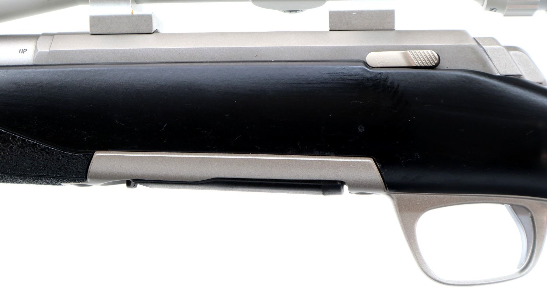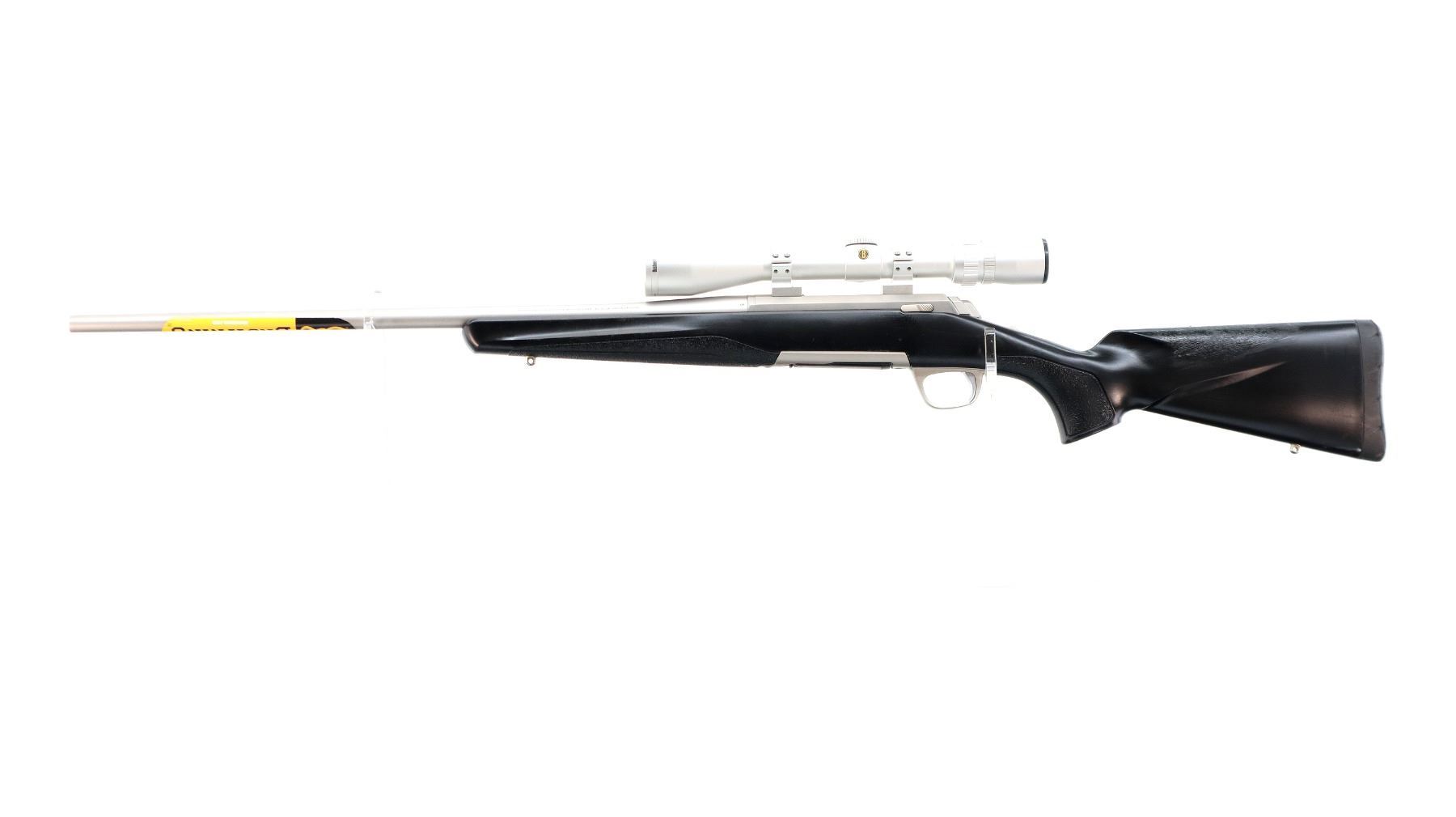 Main Description: No sights, stainless finish, receiver drilled and tapped with silver Bushnell Elite 4200 2.5-10x40 scope installed, clear optics with duplex crosshair. Fluted bolt with flat knob, tang safety. One piece Duratouch black synthetic stock, textured forearm and pistol grip panels with right hand palm swell, black rubber recoil pad, grip cap, swivel studs, retains factory stickers.