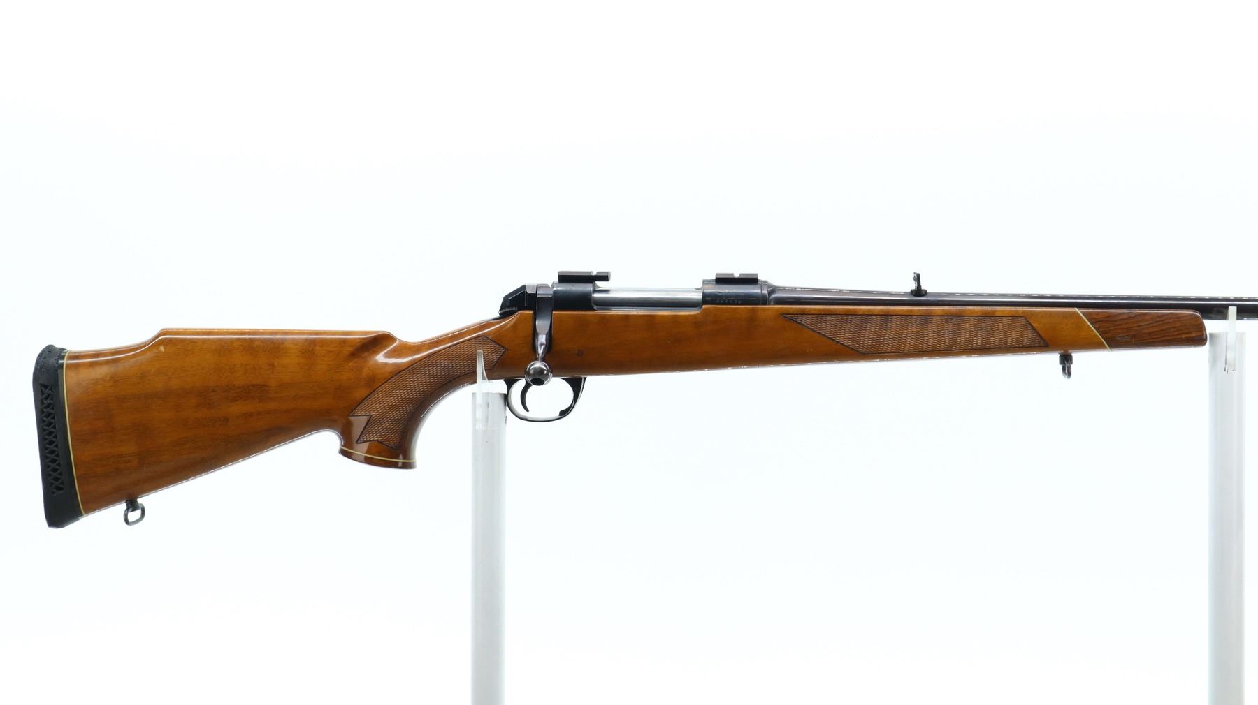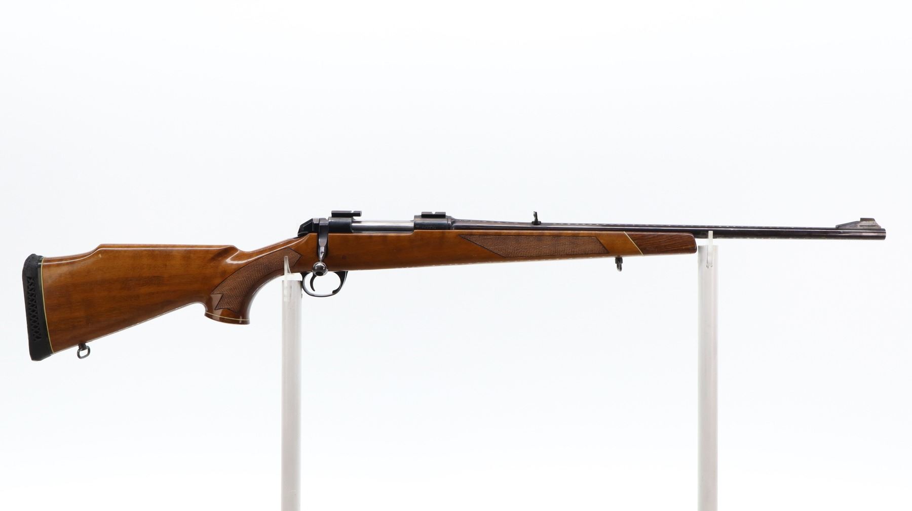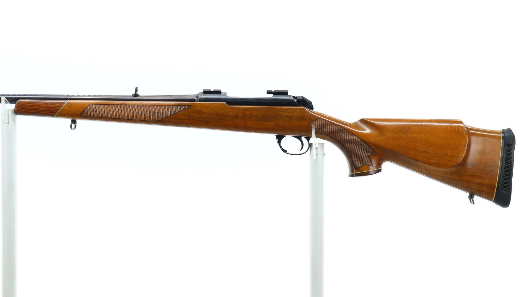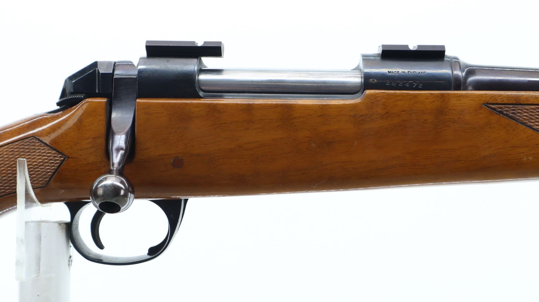 7/10 , BSA , MODEL: MONARCH , CALIBER: 222 REM , BORE IS GOOD, SHINY. BLADE FRONT SIGHT WITH RAMP, ADJUSTABLE FOLDING U NOTCHED REAR SIGHT, RECEIVER DRILLED AND TAPPED WITH TWO PIECE BASES. MAGAZINE FOLLOWER IS A REPLACEMENT MAY REQUIRE ADJUSTMENT TO FUNCTION. ONE PIECE WOOD STOCK, ROSEWOOD FOREARM AND PISTOL GRIP CAP, CHECKERED FOREARM AND PISTOL GRIP, CHEEK REST, BLACK VENTED RUBBER RECOIL PAD, 14" LOP, HINGED FLOOR PLATE AND SLING SWIVELS. METAL FINISH SHOWS SOME SCRATCHES, HANDLING MARKS AND WEAR. STOCKS SHOW SOME DINGS, SCRATCHES AND WEAR. , ACTION: BOLT ACTION RIFLE , BARREL LENGTH: 22" , CONDITION: 7/10 , SERIAL # 2M2472 , CLASS: CANADIAN NON RESTRICTED