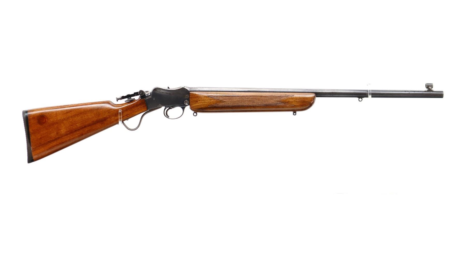 Main Description: Globe front sight with insert, adjustable folding rear peep sight, blued finish, heavy barrel drilled and tapped with plug screws installed, cocking indicator, short lever. Two piece wood stocks, checkered forearm, straight grip, textured black rubber recoil pad, swivel studs.