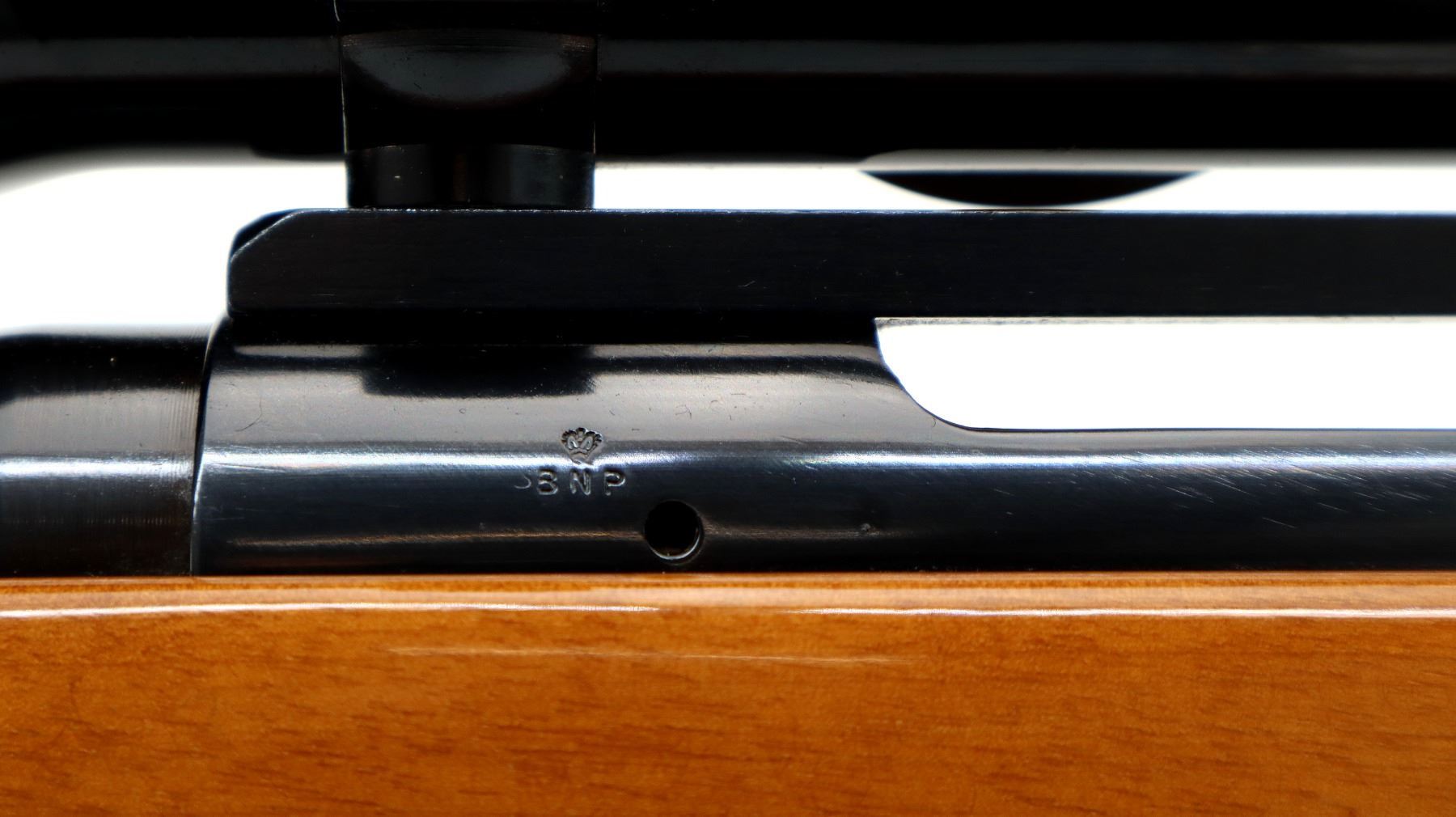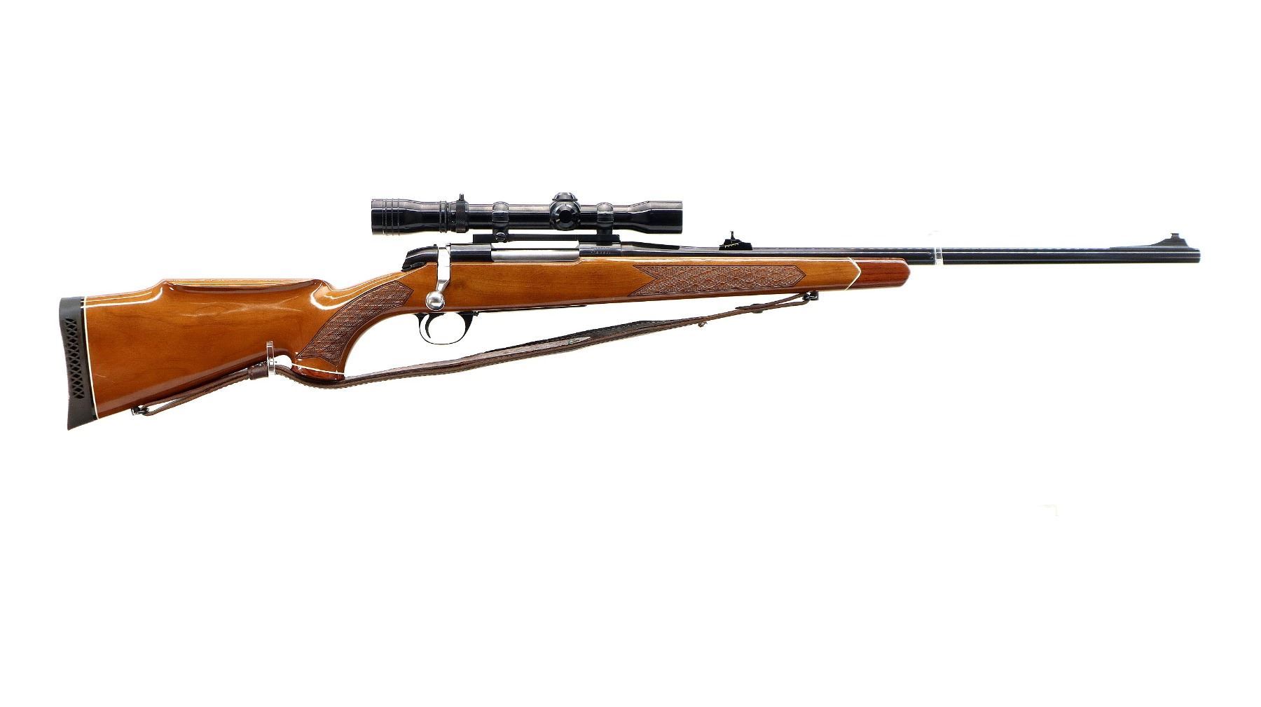 Main Description: Blade front sight with ramp, adjustable u notched rear sight, polish blued finish, receiver drilled and tapped with Redfield 2-7 WA scope installed, clear optics with duplex crosshair. Smooth bolt knob. One piece wood stock, Rosewood forend and pistol grip caps, checkered forearm and pistol grip with right hand palm swell, roll over cheek rest, black vented rubber recoil pad, hinged floor plate, sling swivels with brown leather sling.