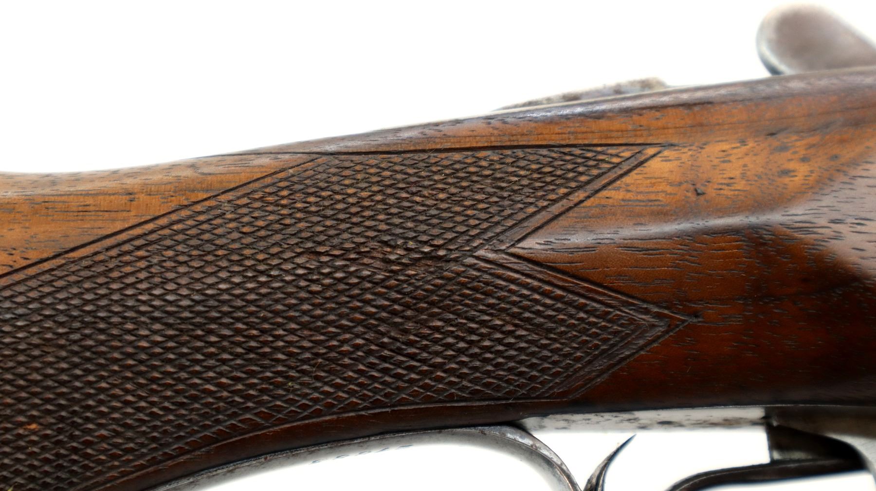 Main Description: Brass bead, blued barrels with smooth rib, silver receiver, automatic safety, extractor, right side functions, left side does not. Two piece wood stocks, checkered forearm and pistol grip, grooved black polymer butt plate