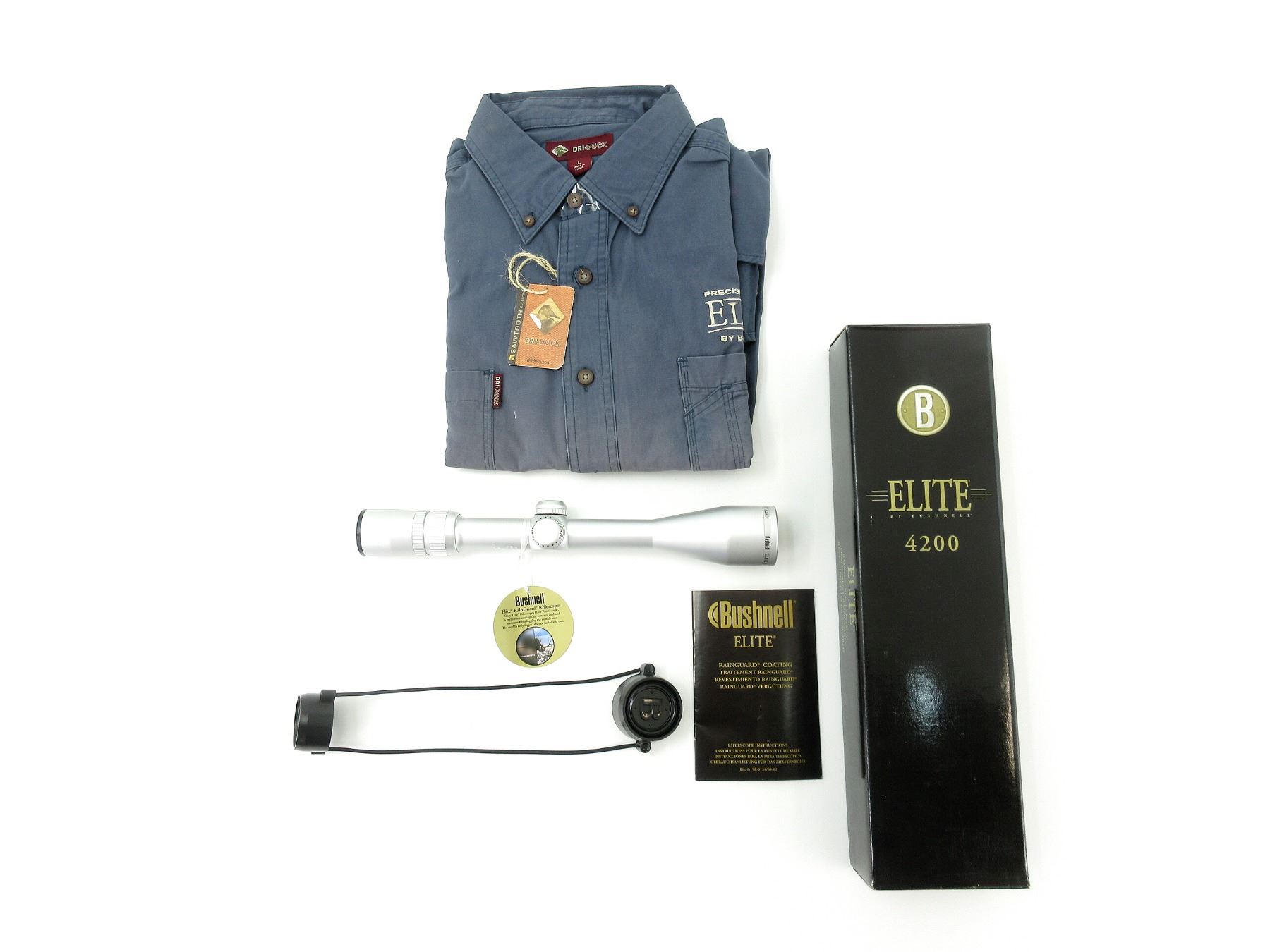 LOT INCLUDES; (1) BUSHNELL ELITE 4200 2.5-10X40 RIFLE SCOPE, CLEAR OPTICS, MULTI-X RETICLE, 1" TUBE DIAMETER, WORKING MAGNIFICATION RING, WINDAGE & ELEVATION KNOBS TURN, SERIAL NO. A009368, NOS, INSTRUCTIONS & ORIGINAL BOX & (1) DRI-DUCK LONG SLEEVE BUTTON SHIRT, BLUE, SIZE LARGE. SEE PHOTOS.
