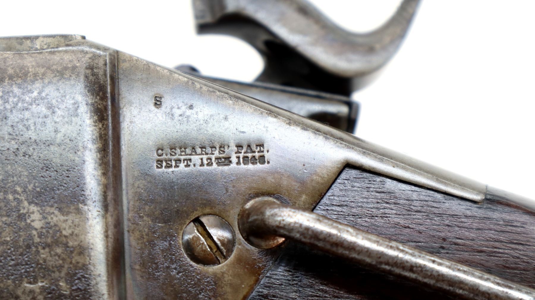 Main Description: Blade front sight with ramp, adjustable u notched ladder rear sight, receiver has traces of colour case hardening. Colour case hardened back action lock with checkered spur hammer that functions, retains some parts of the Maynard tape primer system, saddle ring and bar on left side. Two piece full military wood stocks, forearm cracked in front of receiver, straight grip, smooth curved steel butt plate, holes are filled in on toe of stock and forearm.