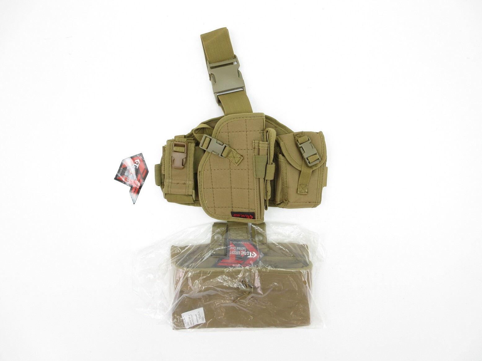 LOT INCLUDES; (1) C-TAC DROP LEG PLATFORM, COYOTE BROWN, NYLON CONSTRUCTION, MOLLE PLATFORM, UNIVERSAL PISTOL HOLSTER, TWO MAG POUCHES, WITH VELCRO & SNAP CLOSURES, ADJUSTABLE LEG STRAPS, APPEARS NOS, WITH TAG, (1) C-TAC DUMP POUCH, COYOTE BROWN, NYLON CONSTRUCTION, MOLLE COMPATIBLE, WITH BUNGEE CLOSURE, NOS, UNOPENED. SEE PHOTOS.