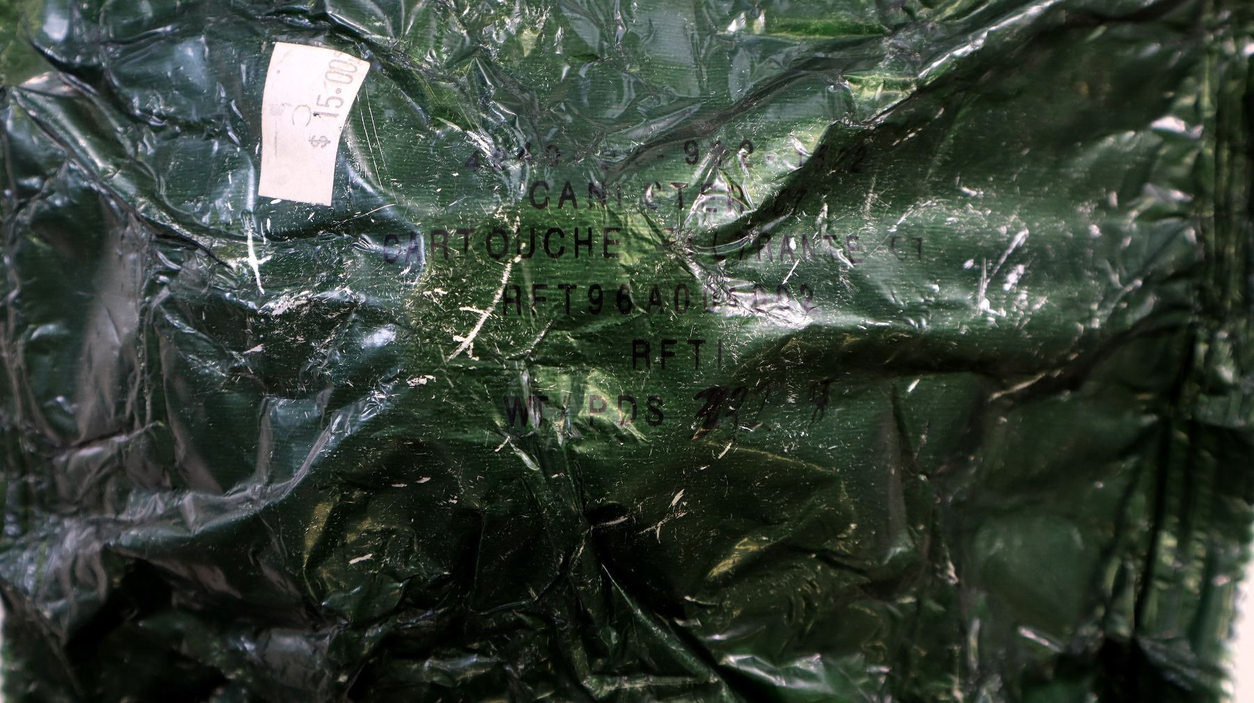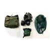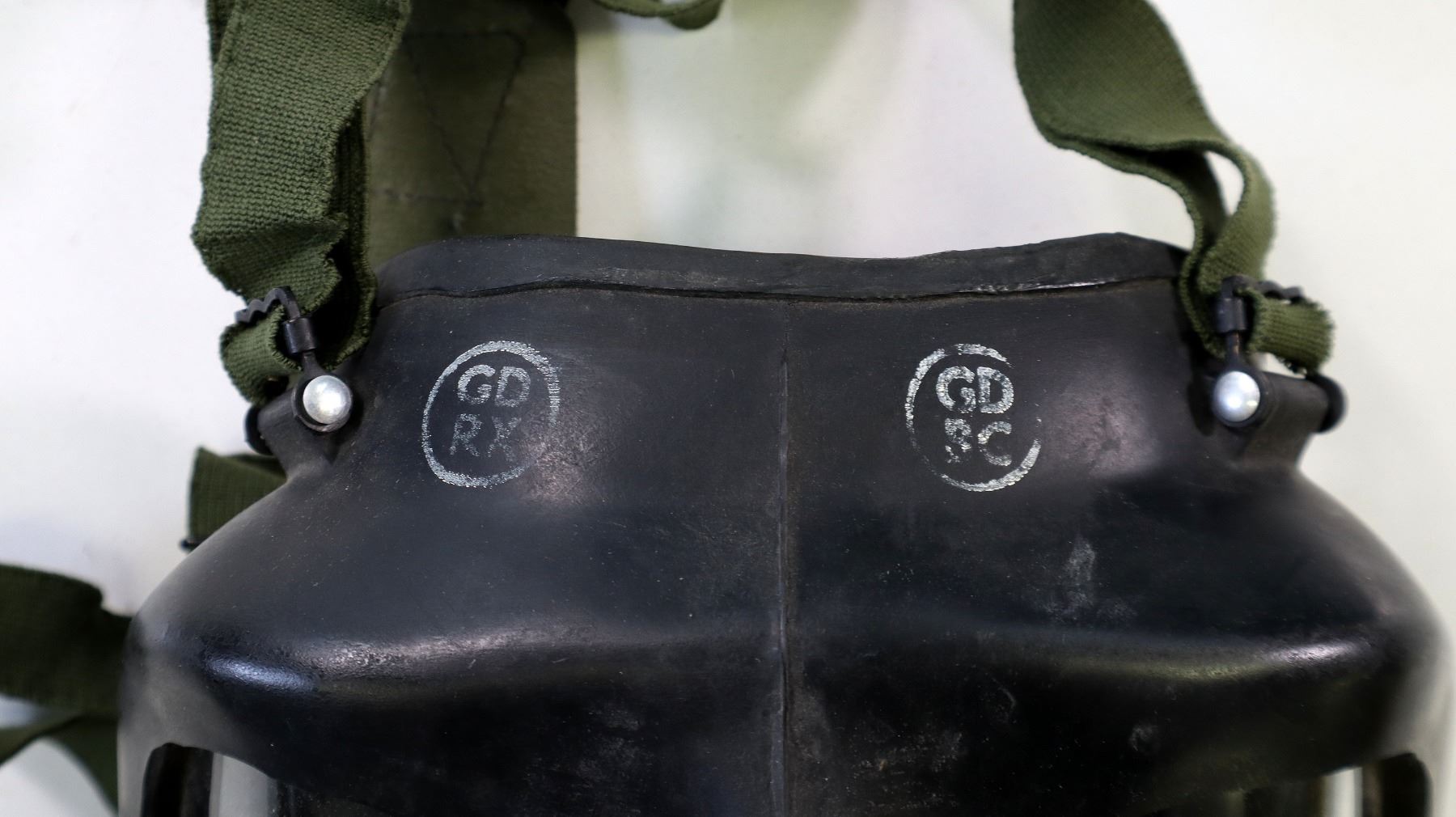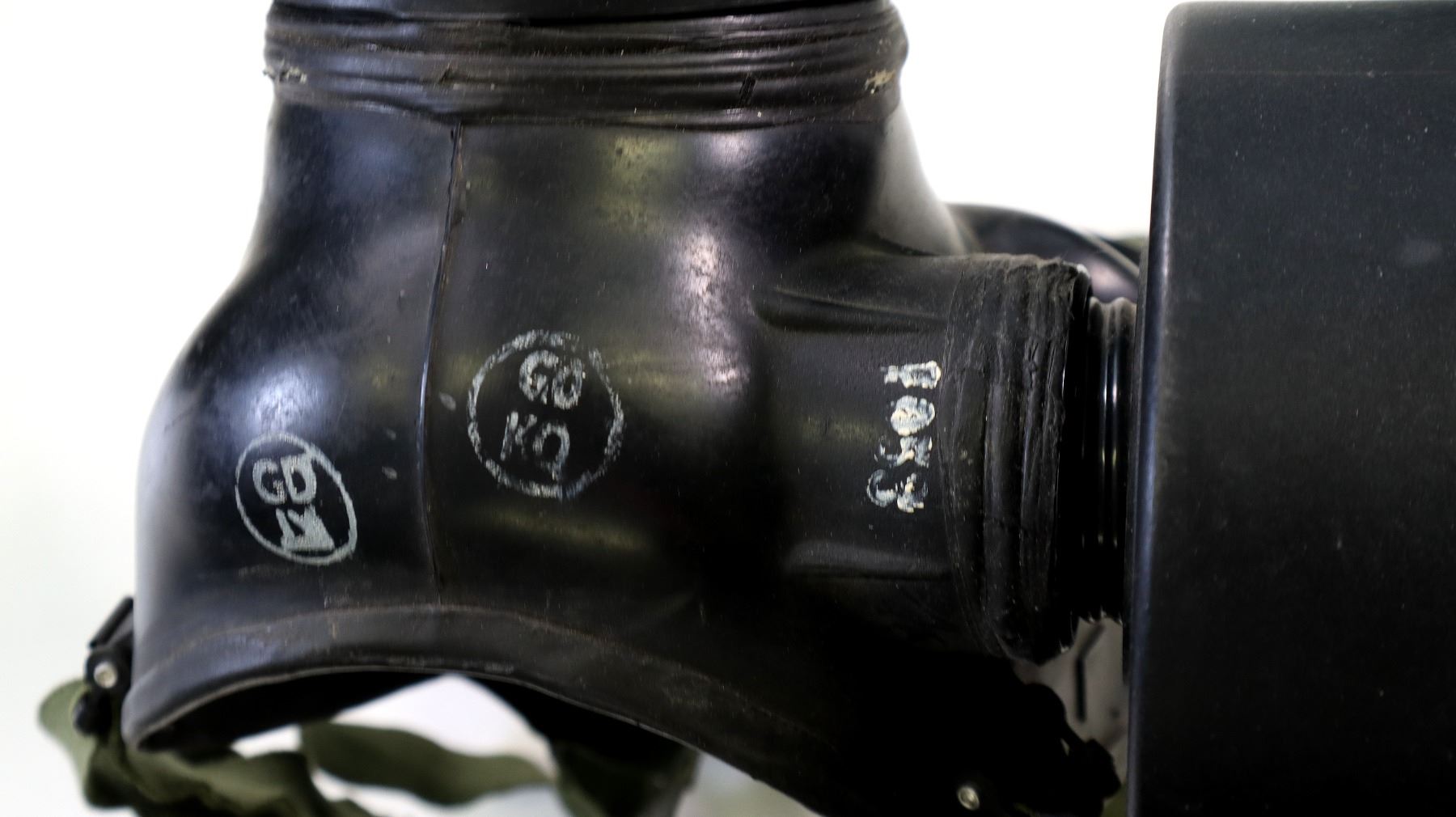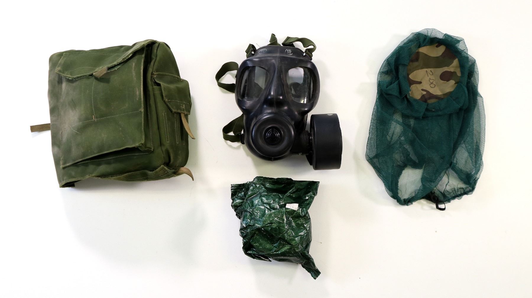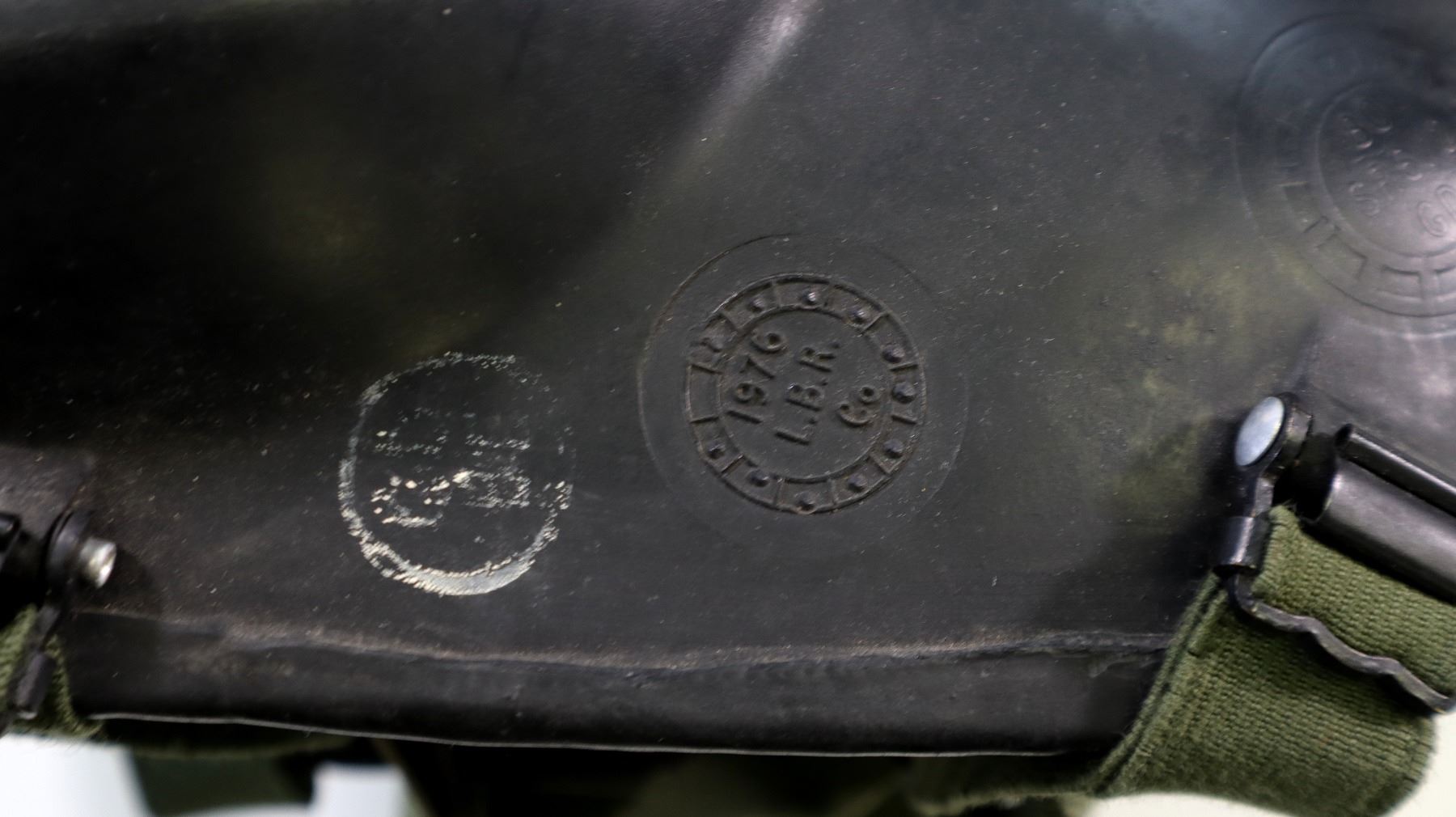 LOT INCLUDES; (1) BRITISH MILITARY BLACK RUBBER SR6 GAS MASK WITH GREEN ELASTIC HEAD STRAPS, MASK MARKED: "1976, L.B.R. CO.", "80, SR6/2, GD", "L (POSSIBLE SIZING)" & VARIOUS INK STAMP MARKINGS, HEAD STRAP MARKED: "GD 4 / 80, PR 565, S6", LENSES INTACT, FILTER ATTACHED, (1) GREEN NYLON GASK MASK CARRIER, NO VISIBLE MARKINGS, (1) GREEN / CAMO MESH HELMET / MASK COVER, DRAWSTRING, VARIOUS MARKINGS & (1) CANADIAN MILITARY FILTER STILL SEALED IN PACKAGING, MARKED: "4240-21-9?2-1522" ETC. SEE PHOTOS.