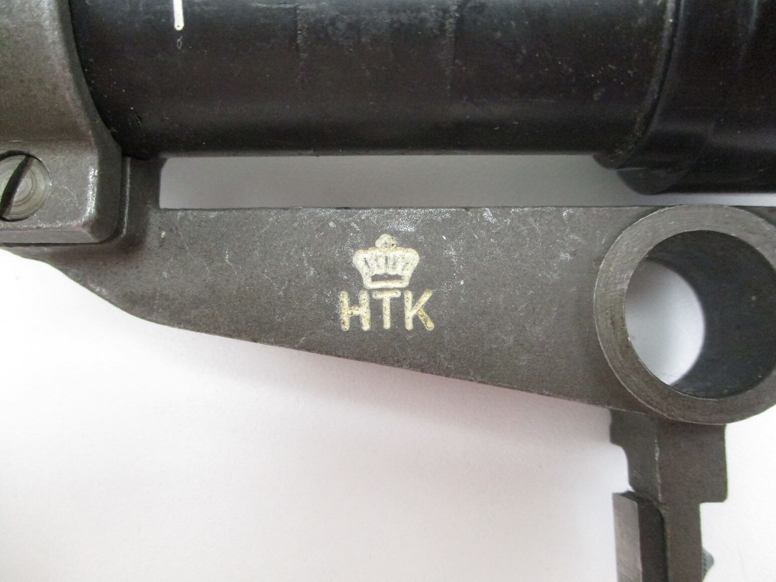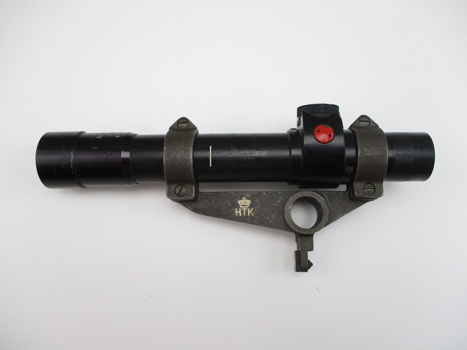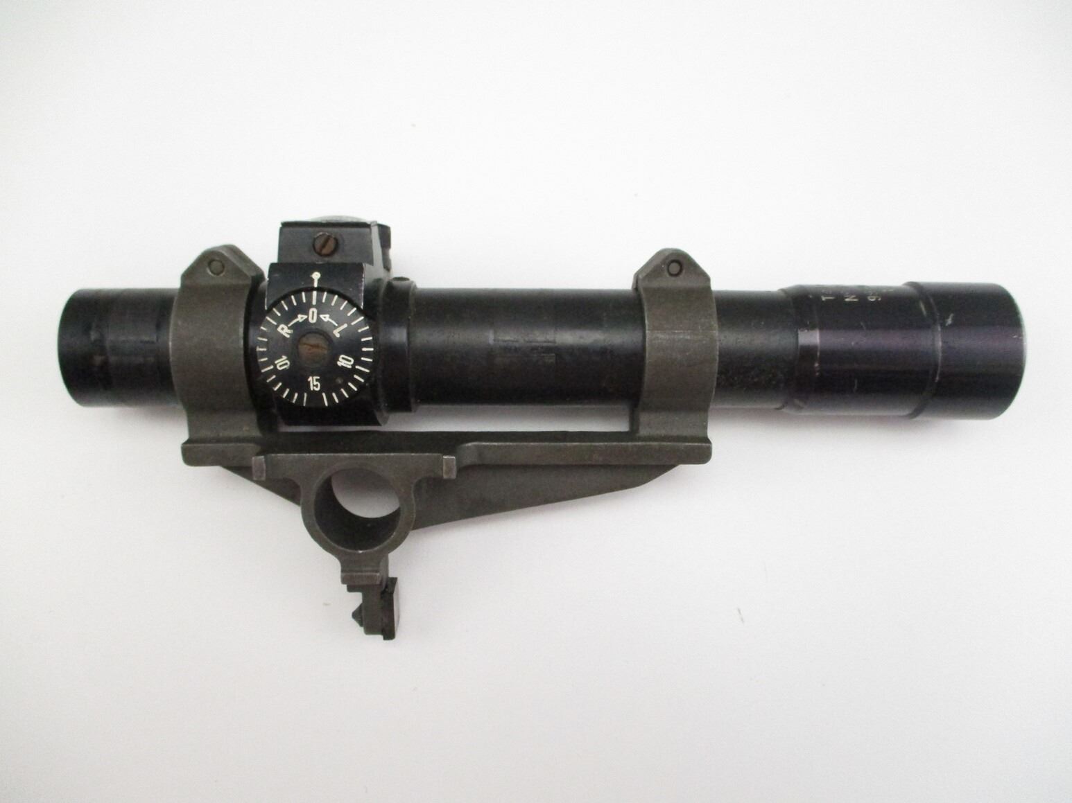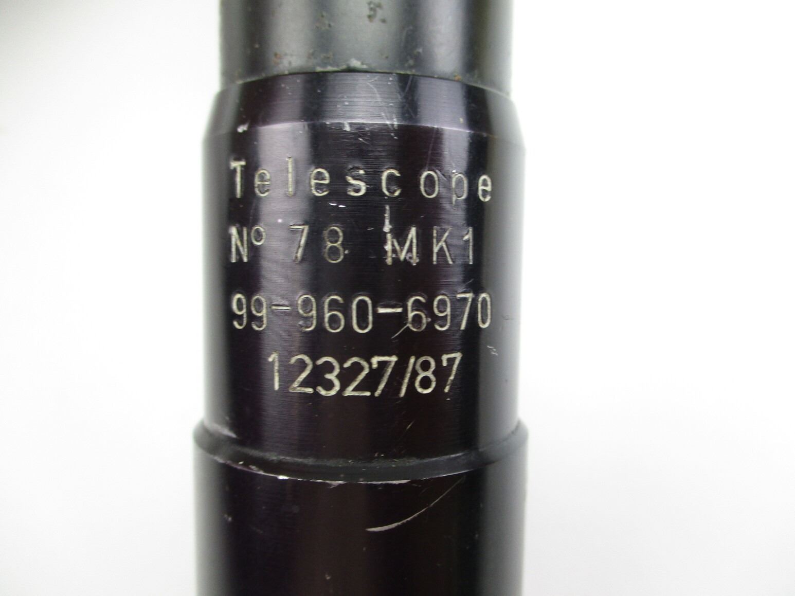 CANADIAN CARL GUSTAF 84MM SCOPE, (1) FITS 84MM RECOILLESS RIFLES, CLEAR OPTICS, GRADUATED RETICLE, HAS PARTIAL RINGS & BASE, SCOPE MARKED: "TELESCOPE, NO 78 MK 1, 99-960-6970, 12327/87" & "2X17", BASE MARKED: CROWN OVER "HTK". SEE PHOTOS.