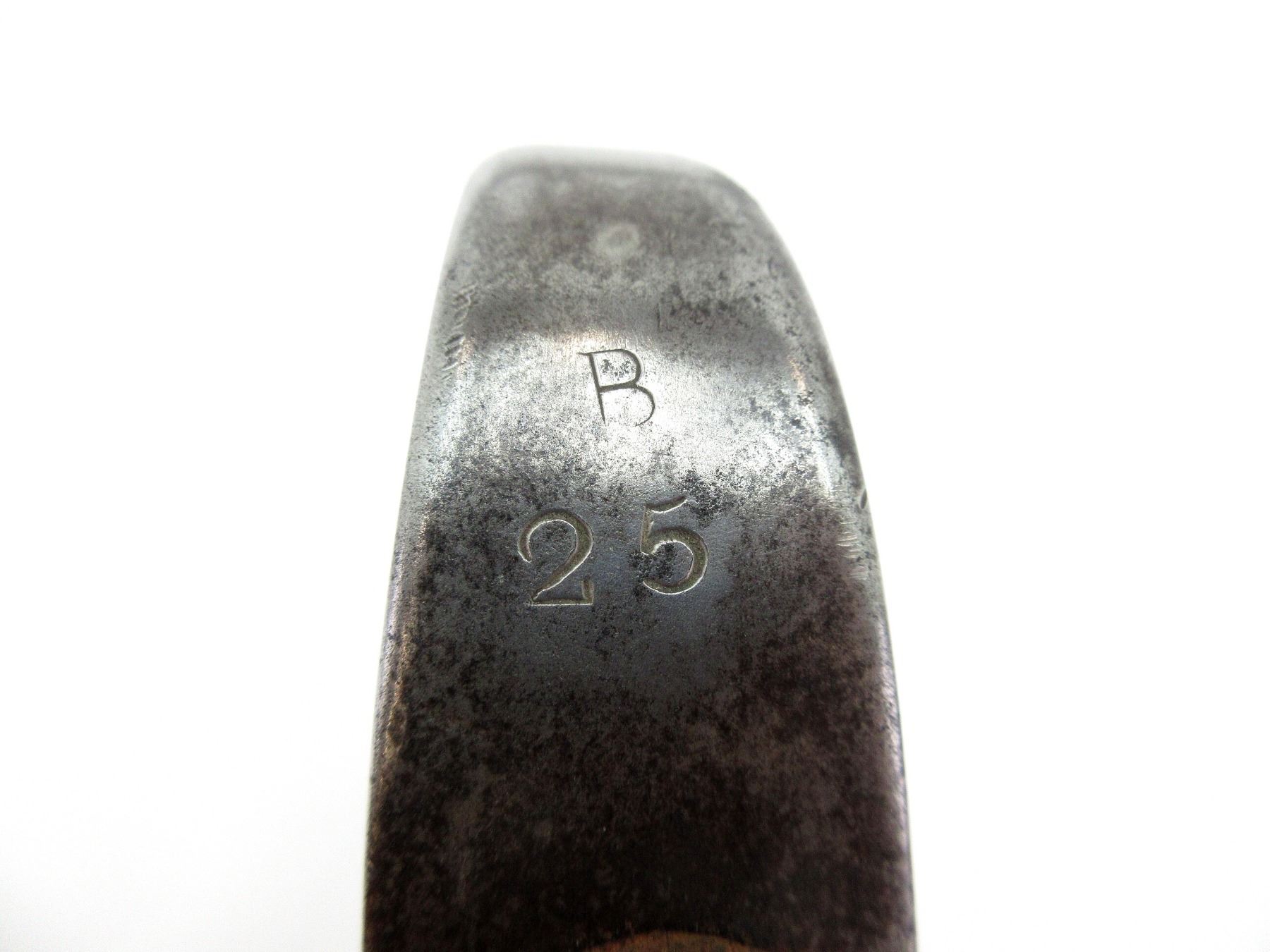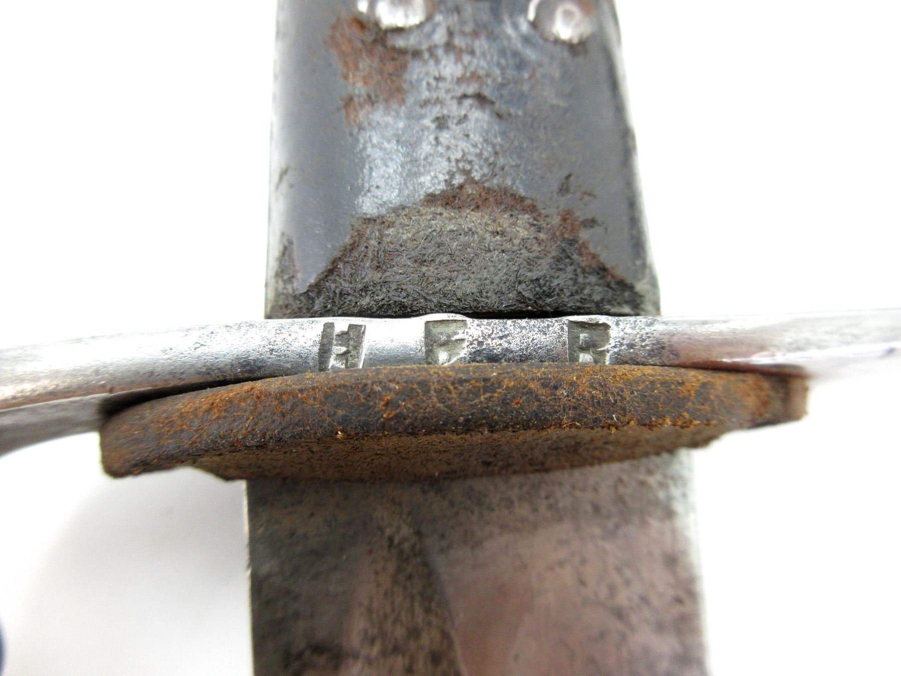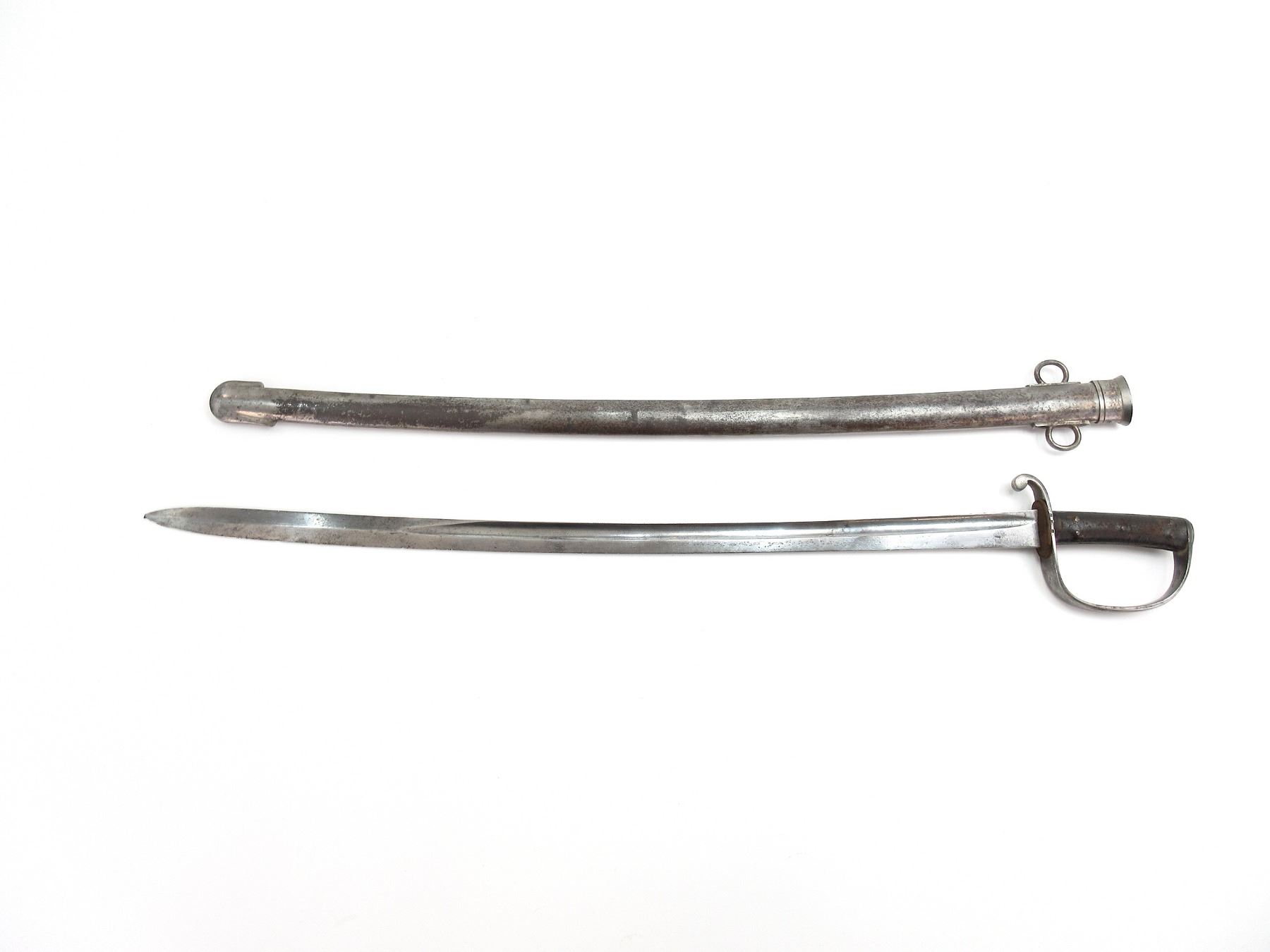 (1) SLIGHTLY CURVED SINGLE-FULLERED BLADE, RICASSO MARKED: CROWN OVER "B" OVER "13" OVER PARTIAL MARKING, FAINT / PARTIAL MARKING ON BLADE SPINE, EDGE OF BLADE MARKED: CROWN OVER "B" OVER "13" OVER PARTIAL MARKING, LEATHER BUFFER PAD / WASHER, CROSS-GUARD MARKED: "HFB (HAMILTON FIELD BATTERY), GUARD MARKED: "B" OVER "25", 2-PIECE LEATHER COVER GRIP, D-SHAPED GUARD, METAL POMMEL, NO VISIBLE MARKINGS, STEEL SCABBARD, MARKED: "CFL", CROWN OVER "75" OVER "E", "P" OVER "99", BROAD ARROW, CROWN OVER "75" OVER "E" & "01", TWO METAL HANGERS, BLADE APPROX. 32.5" & OAL APPROX. 38 1/8". SEE PHOTOS.