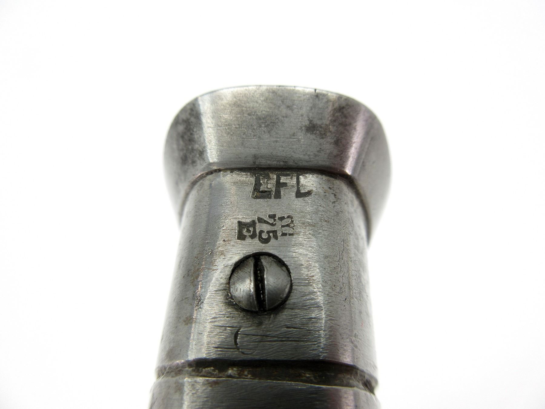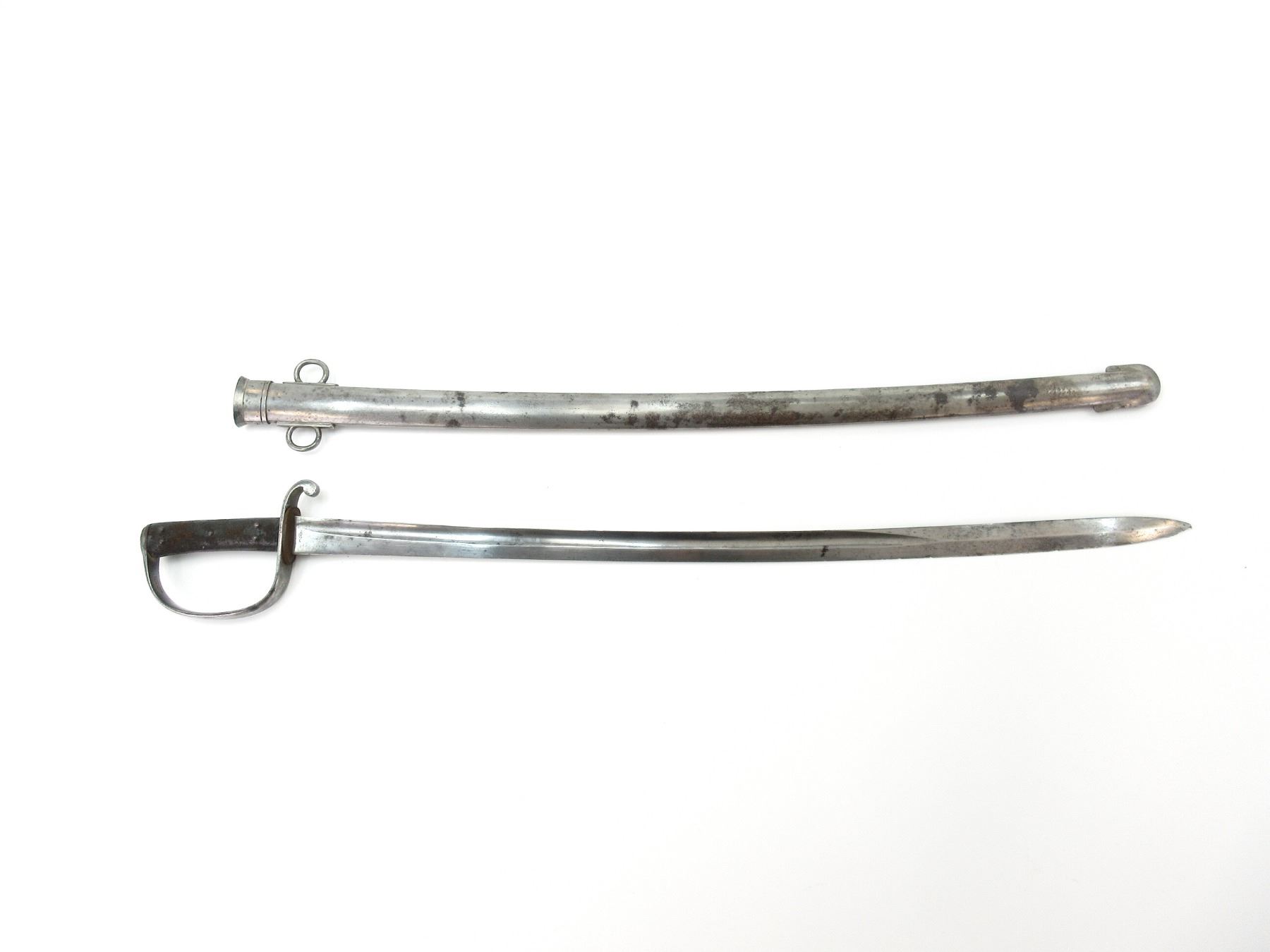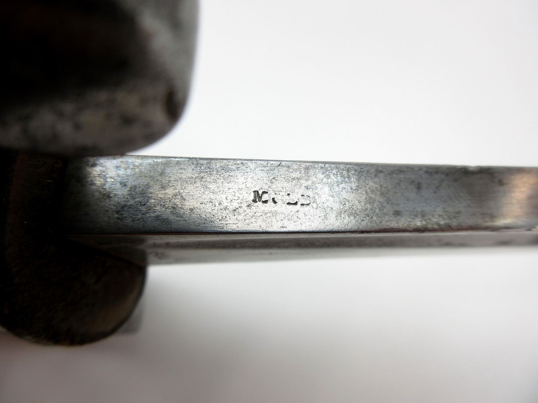 (1) SLIGHTLY CURVED SINGLE-FULLERED BLADE, RICASSO MARKED: CROWN OVER "B" OVER "13" OVER PARTIAL MARKING, FAINT / PARTIAL MARKING ON BLADE SPINE, EDGE OF BLADE MARKED: CROWN OVER "B" OVER "13" OVER PARTIAL MARKING, LEATHER BUFFER PAD / WASHER, CROSS-GUARD MARKED: "HFB (HAMILTON FIELD BATTERY), GUARD MARKED: "B" OVER "25", 2-PIECE LEATHER COVER GRIP, D-SHAPED GUARD, METAL POMMEL, NO VISIBLE MARKINGS, STEEL SCABBARD, MARKED: "CFL", CROWN OVER "75" OVER "E", "P" OVER "99", BROAD ARROW, CROWN OVER "75" OVER "E" & "01", TWO METAL HANGERS, BLADE APPROX. 32.5" & OAL APPROX. 38 1/8". SEE PHOTOS.