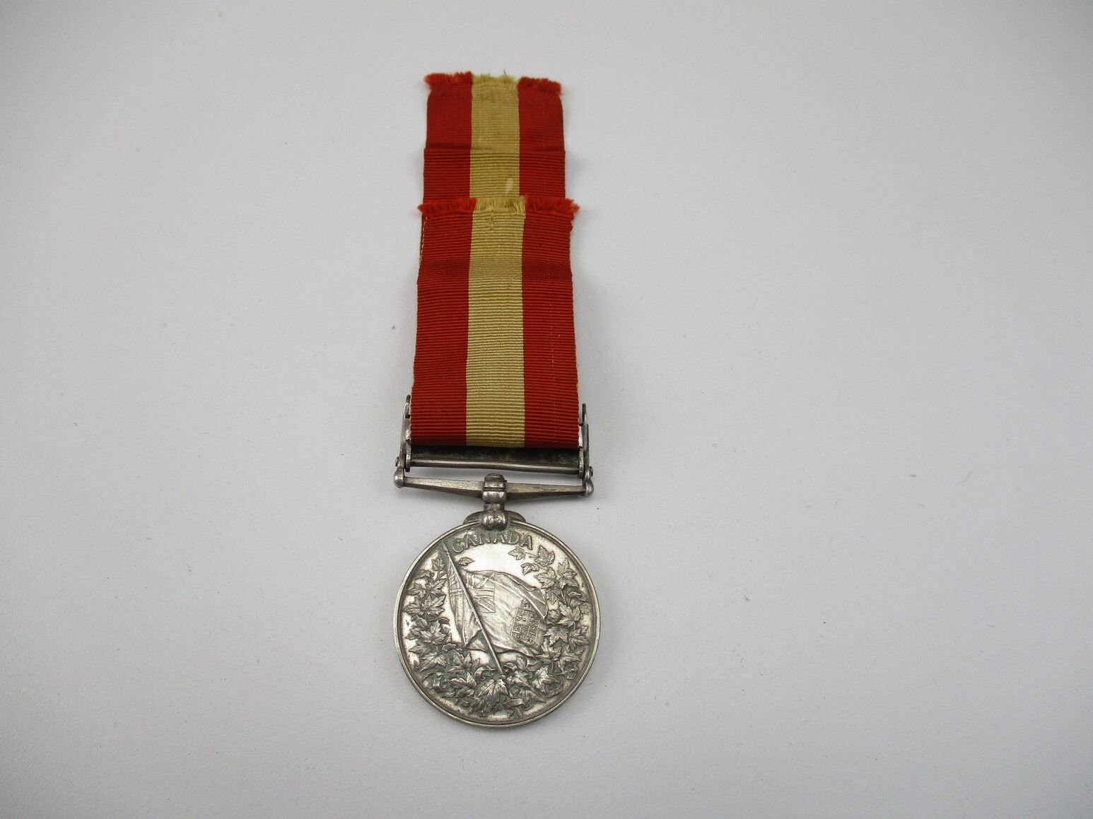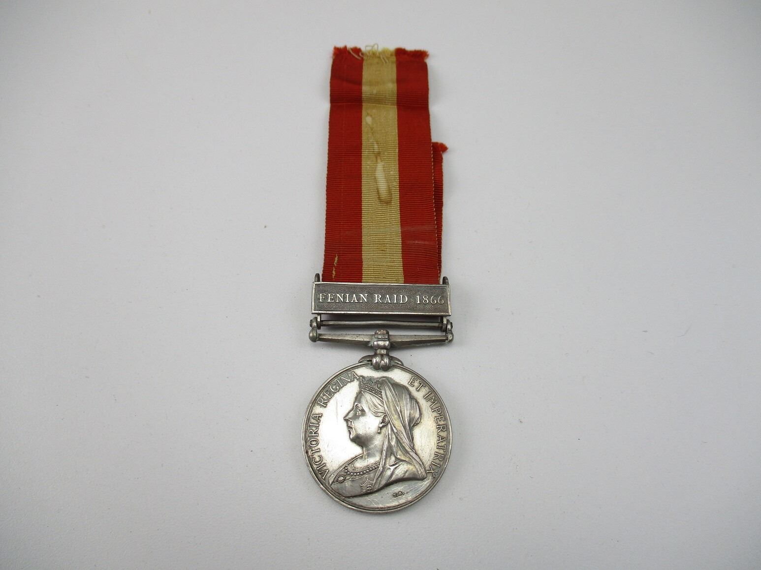 CANADIAN FENIAN RAID 1866 NAMED MEDAL , CANADA GENERAL SERVICE MEDAL 1866 - 1870 CLASP FENIAN RAID 1866, NAMED TO TR. L. FORGUE, ST-JOHN'S CAV. WITH RIBBON AND 1866 BAR. MEDAL IS 36.3MM DIAMETER. CONSULTATION WITH TWO CANADIAN MEDAL EXPERTS INDICATE THAT THIS IS AN ORIGINAL. FURTHER RESEARCH IS REQUIRED, DUE TO SPELLING OR STAMPINGS THAT CAN BE INACCURATE. IT WAS NOT UNCOMMON FOR THE NAME TO BE EITHER MISSPELT ON THE ROLE OR ON THE MEDAL. CONSIGNOR STATES HE IS FROM ST. JEAN QUEBEC, APPEARS IN 2 CENSUSES OF THE TIME. AWARDED TO HIM WHILE WITH ST. JOHN'S CAVALRY. ALSO A MEMBER OF THE 8TH STRATHCONA RIFLES.
