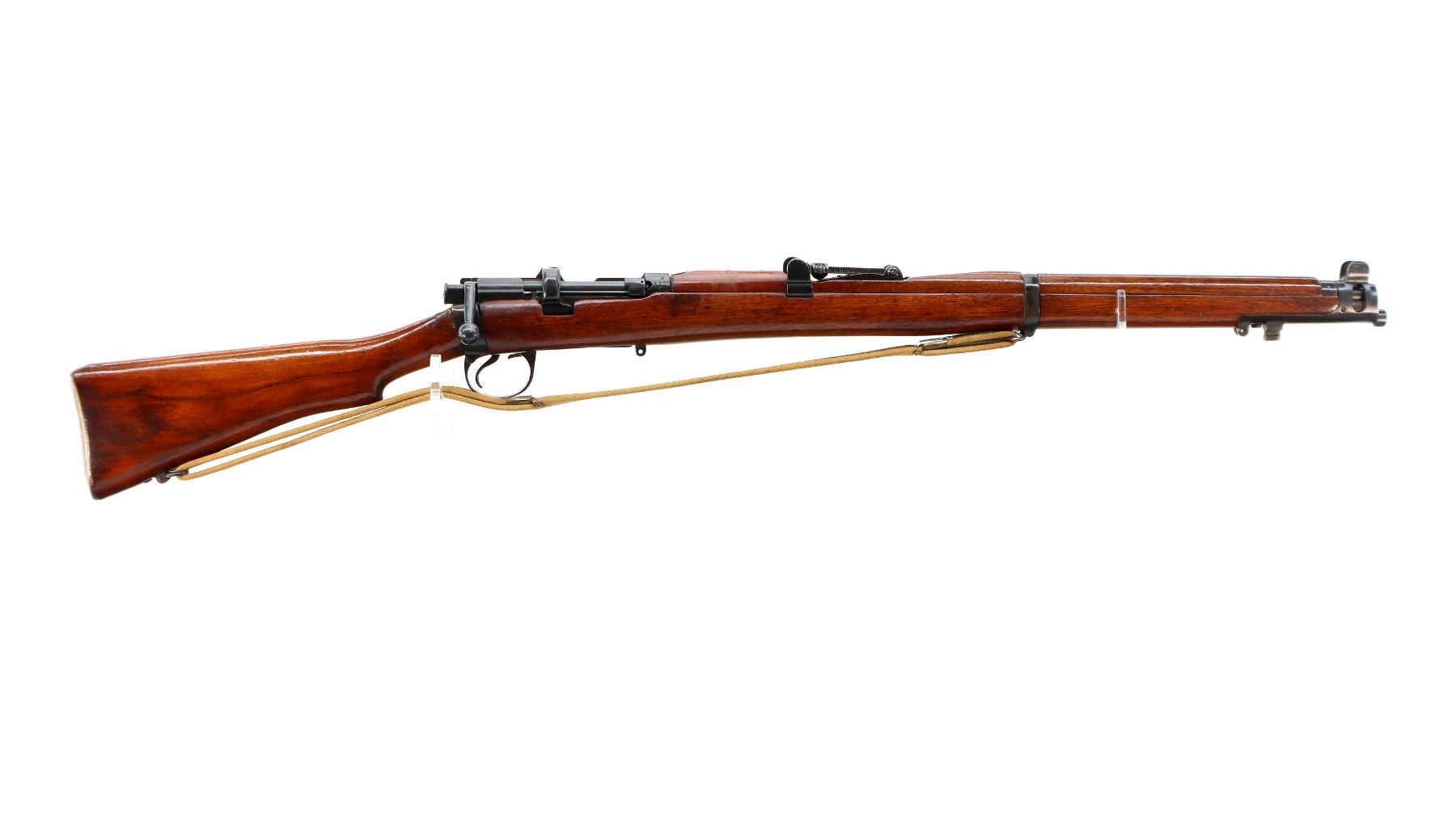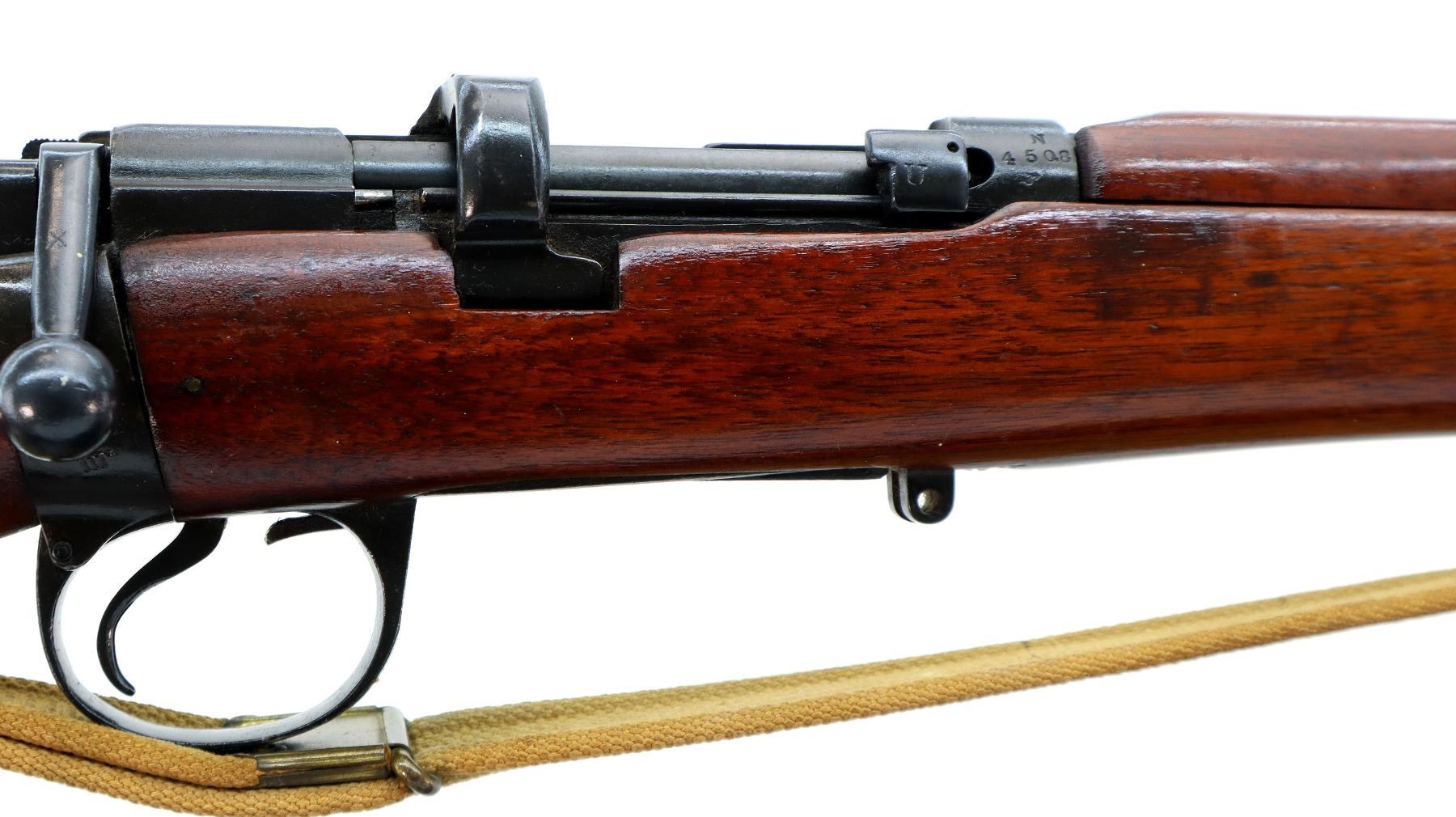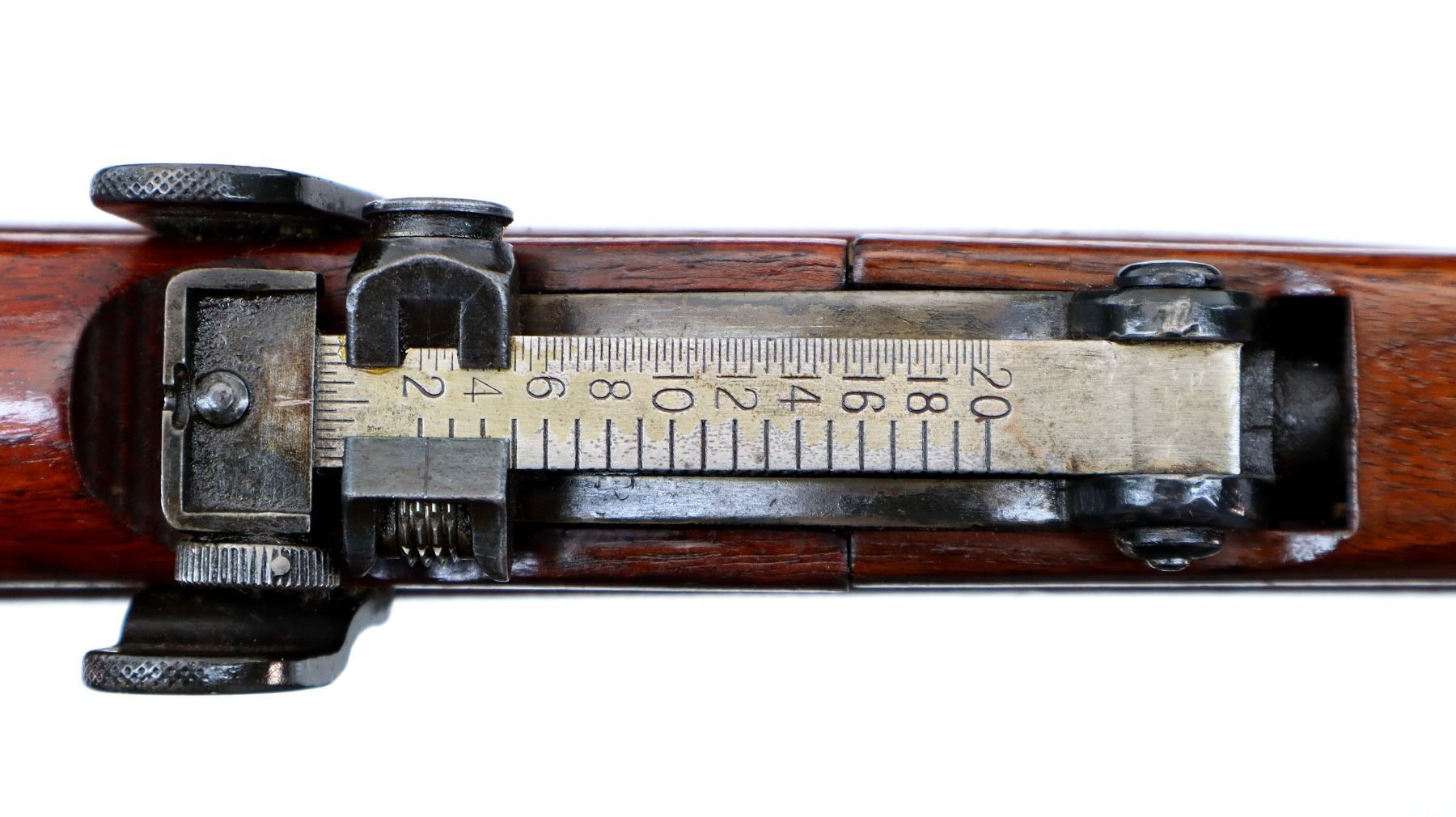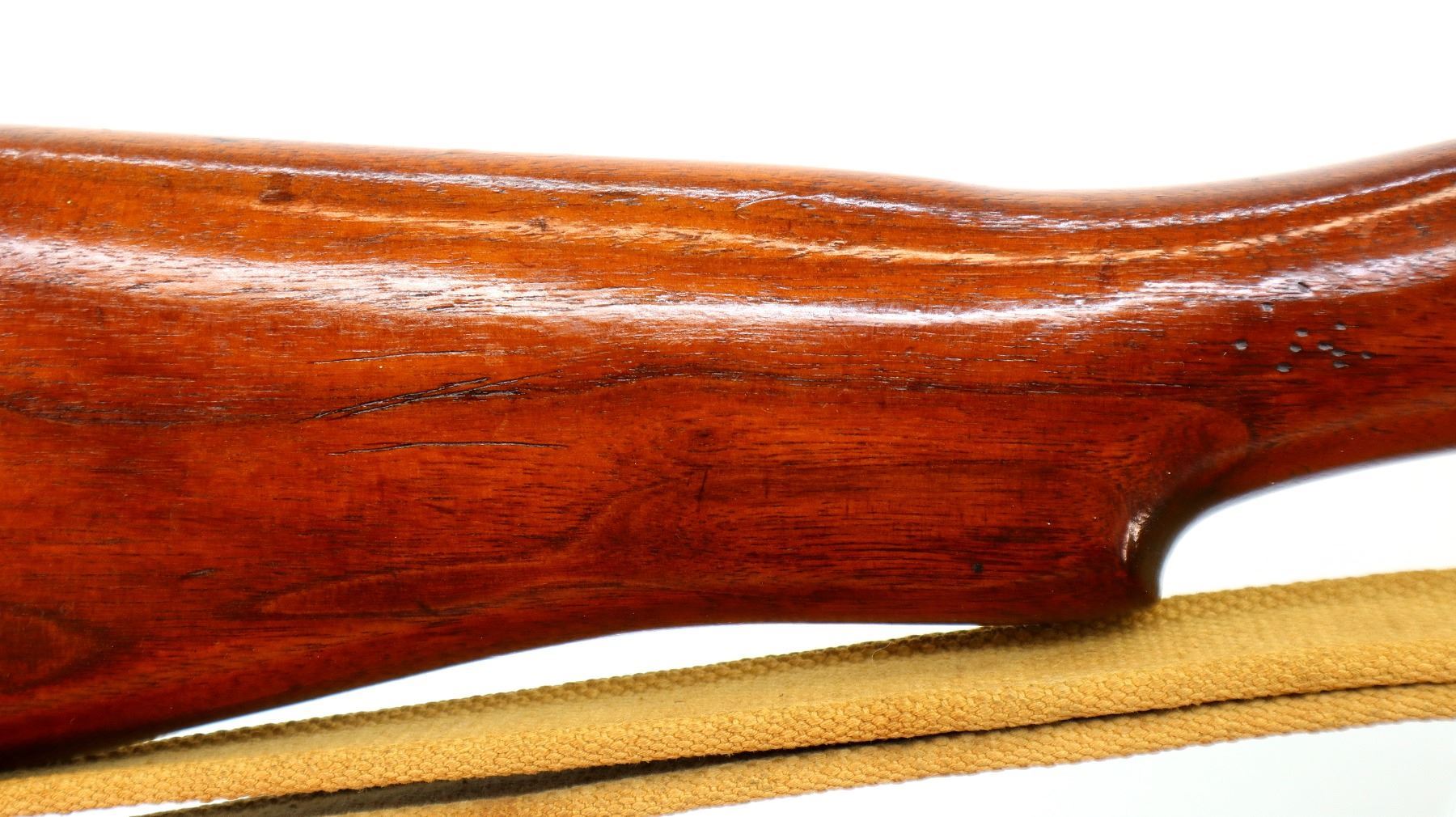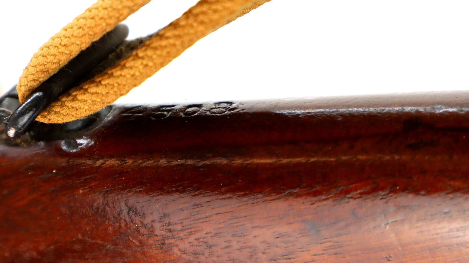 Main Description: Manufactured by Enfield 1916, rebuilt numbered to match. Blade front sight with ears and ramp, adjustable u notched rear sight with ears, blued finish, missing ejector screw. Four piece full military wood stocks, pistol grip cracked behind receiver, smooth brass butt plate with trap, sling swivels with P37 canvas web sling, wood block installed in magwell, has a bayonet lug.