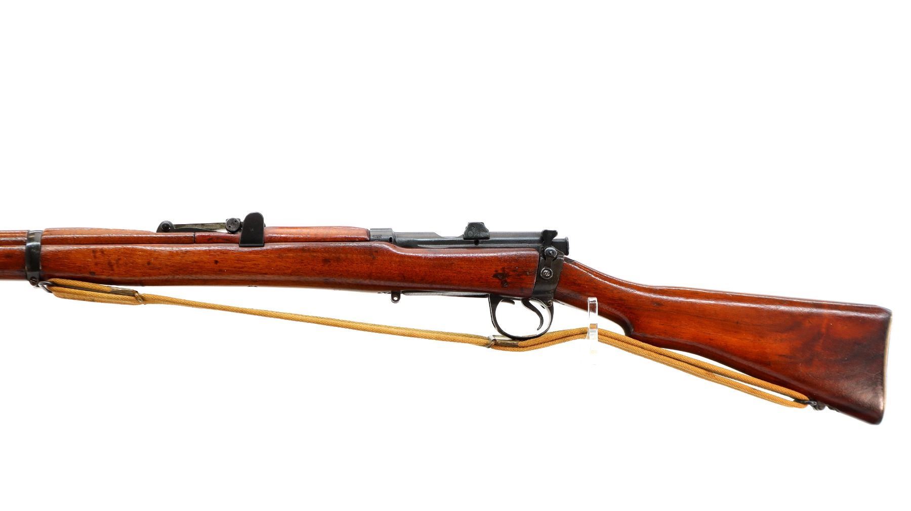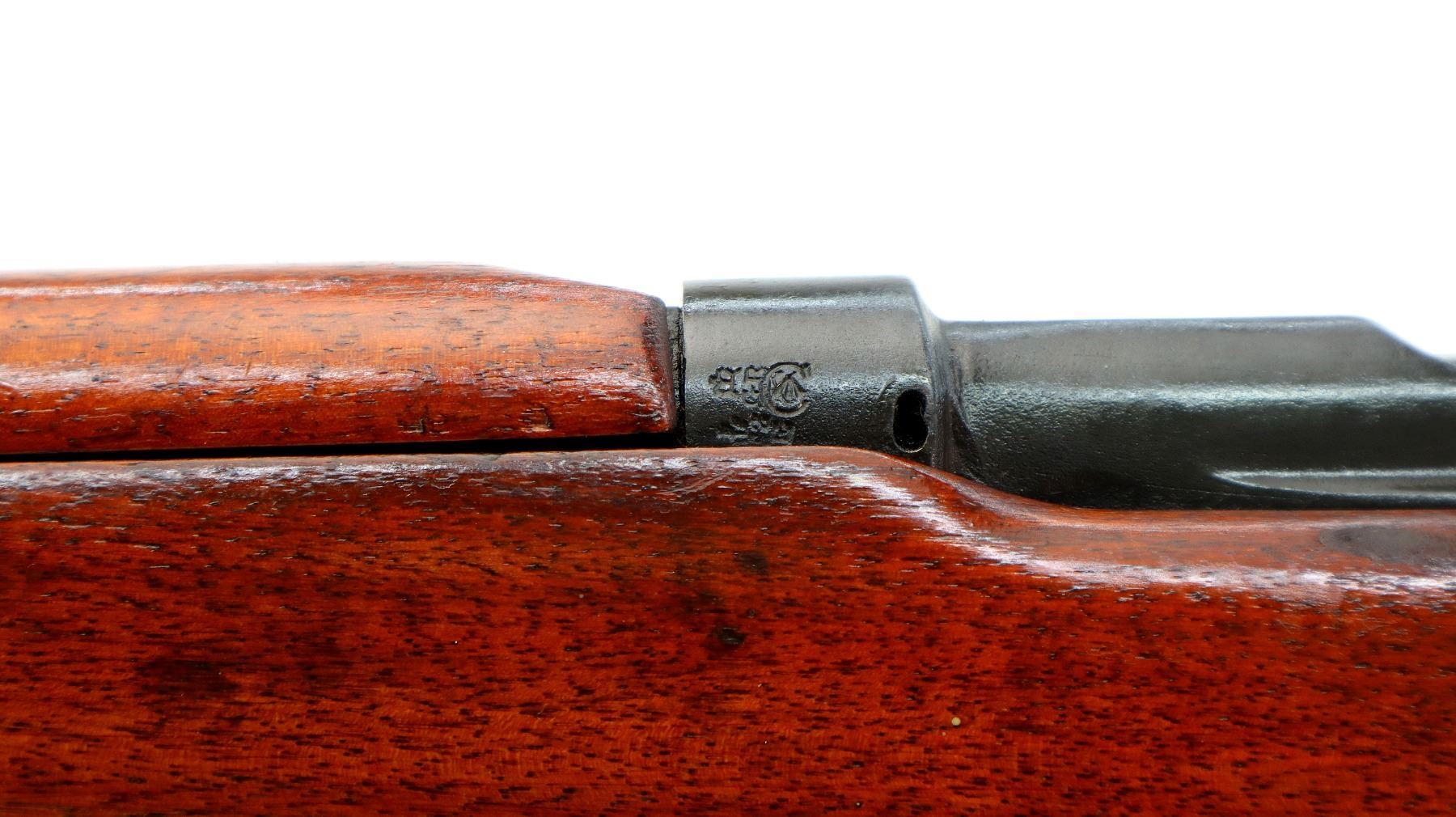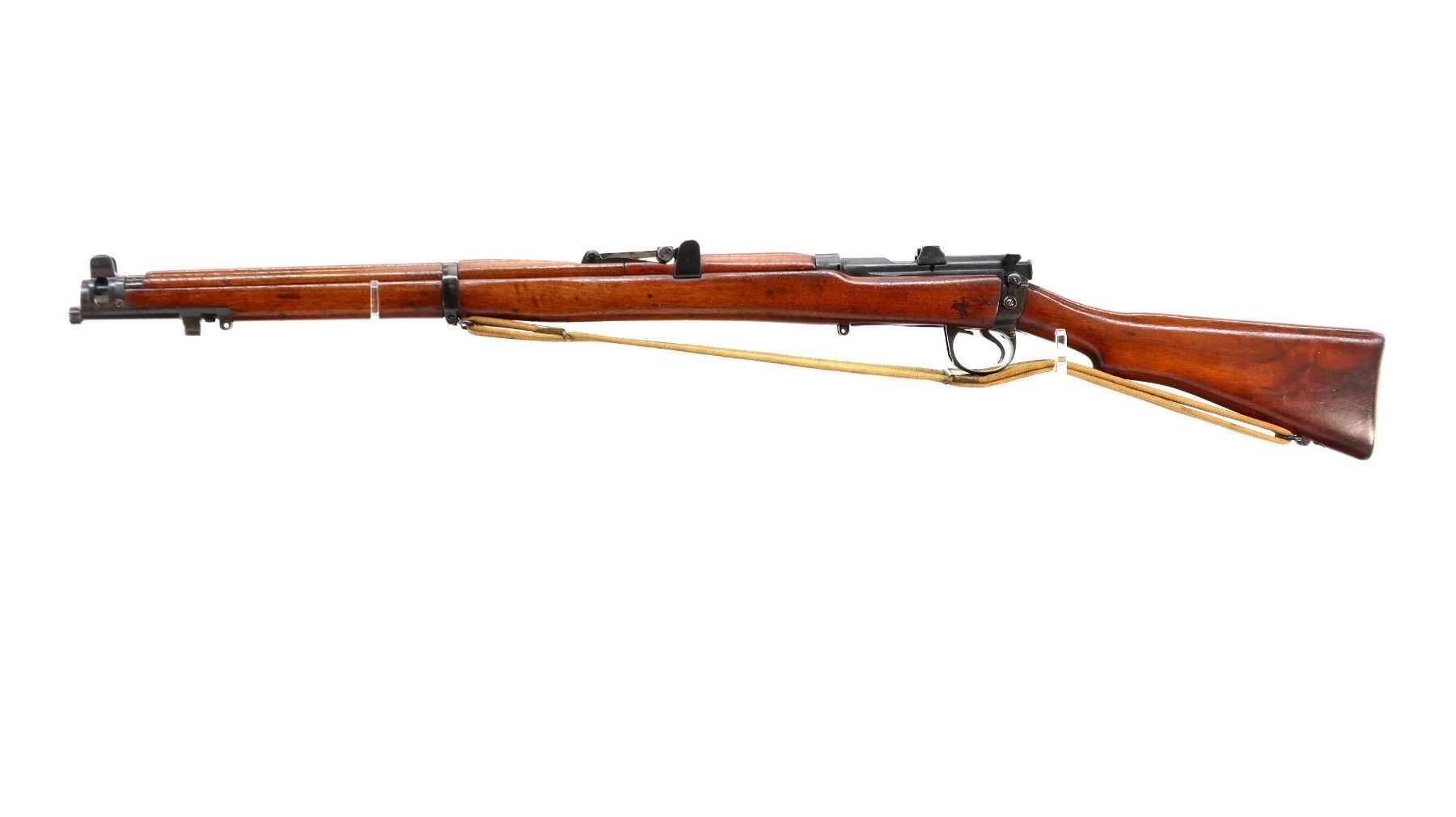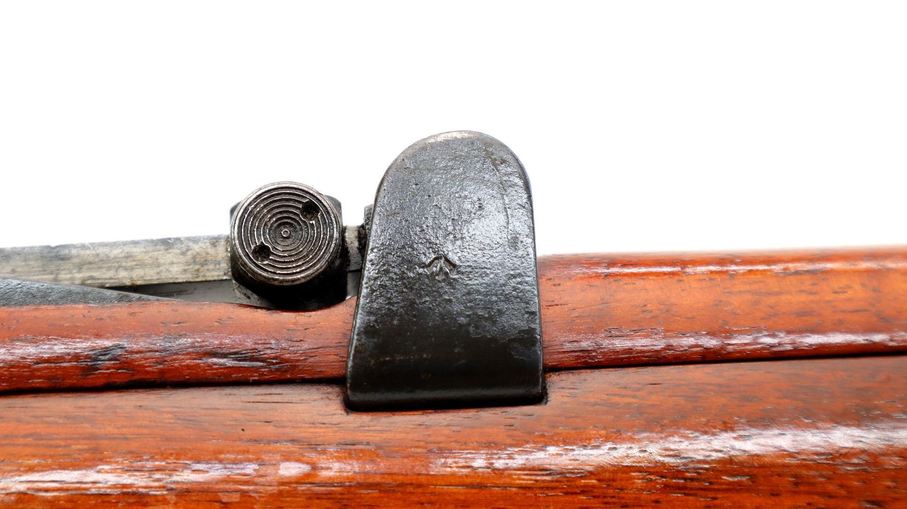 Main Description: Manufactured by Enfield 1916, rebuilt numbered to match. Blade front sight with ears and ramp, adjustable u notched rear sight with ears, blued finish, missing ejector screw. Four piece full military wood stocks, pistol grip cracked behind receiver, smooth brass butt plate with trap, sling swivels with P37 canvas web sling, wood block installed in magwell, has a bayonet lug.