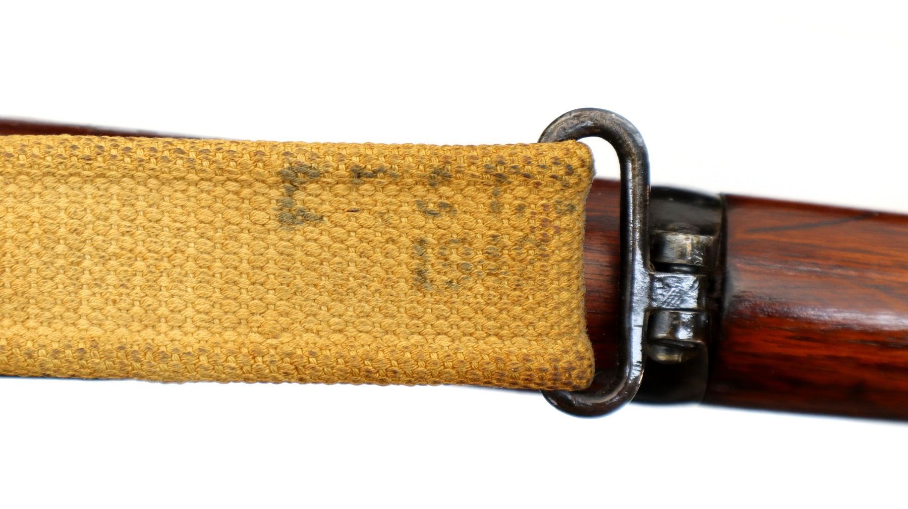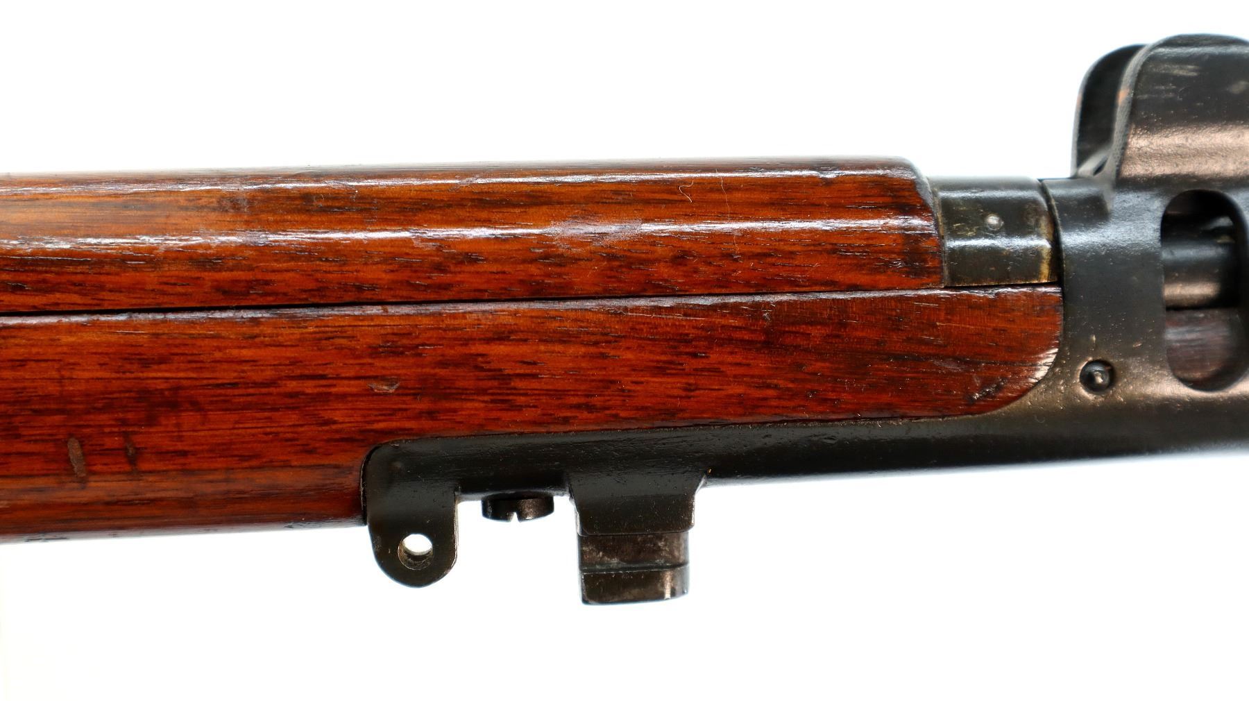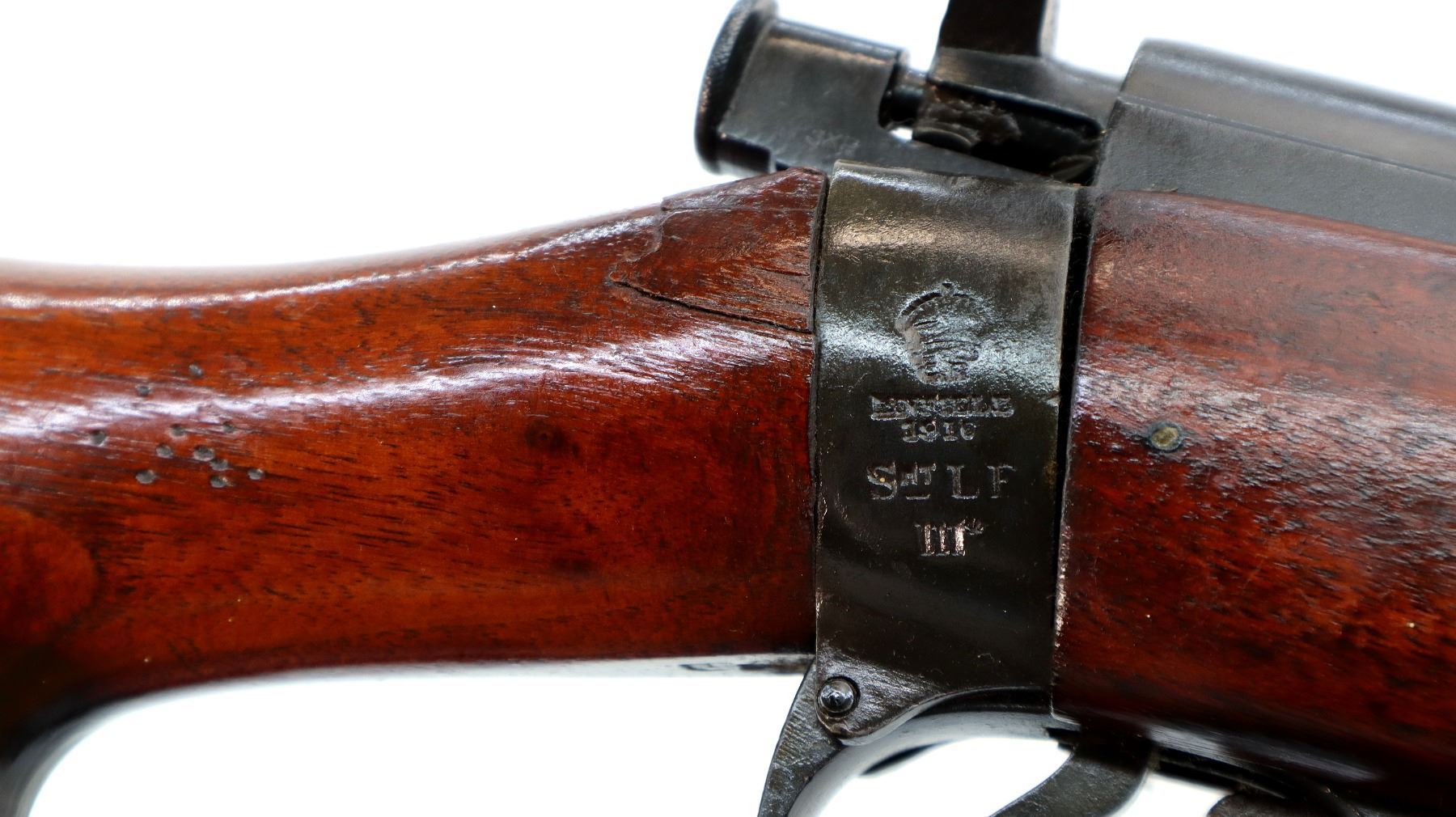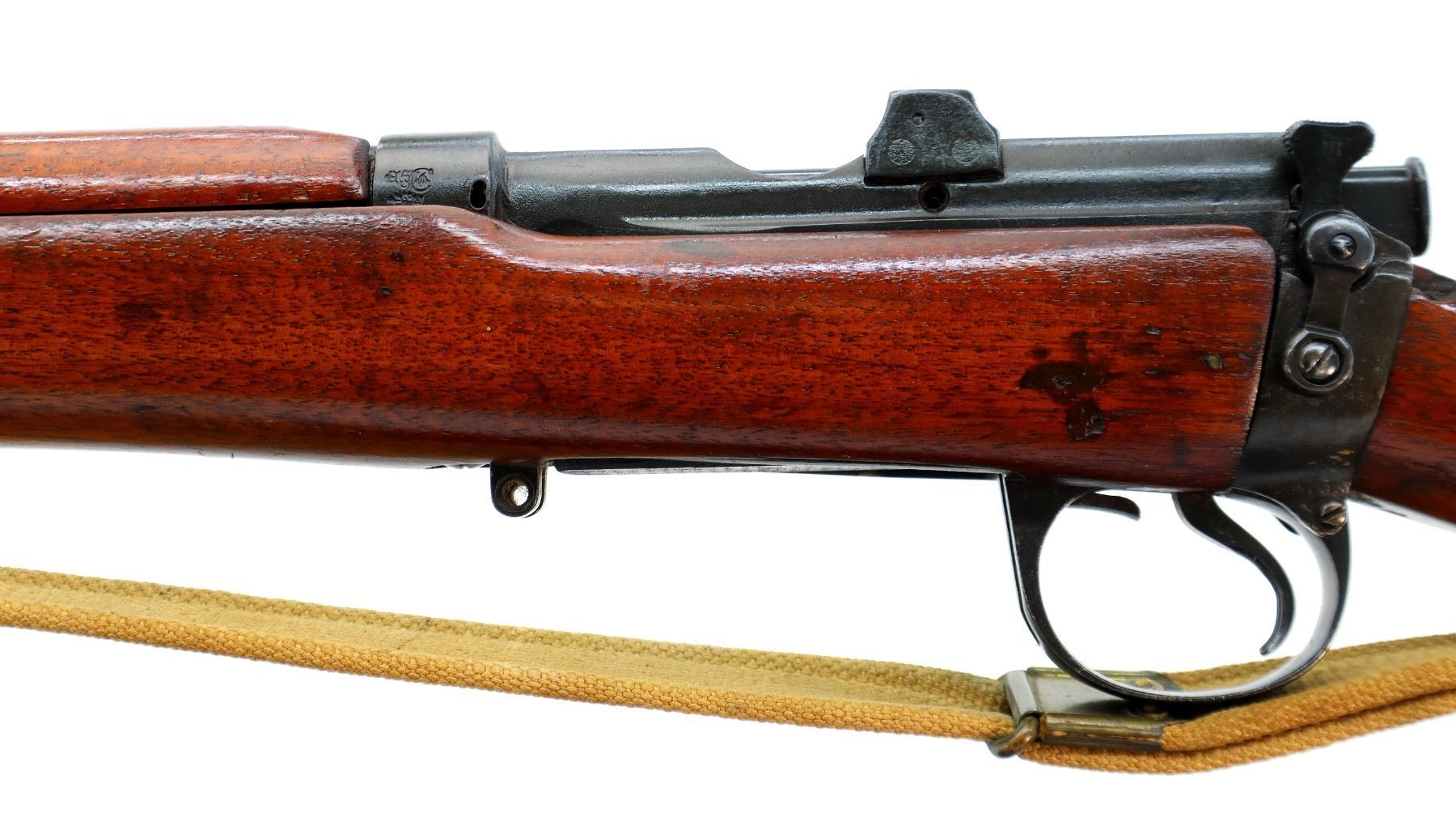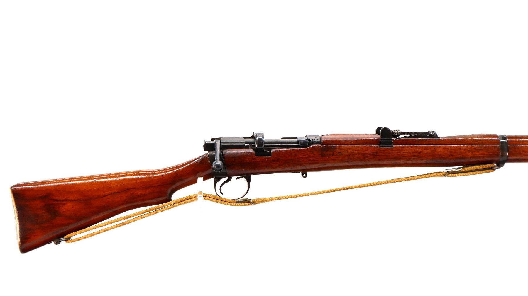 Main Description: Manufactured by Enfield 1916, rebuilt numbered to match. Blade front sight with ears and ramp, adjustable u notched rear sight with ears, blued finish, missing ejector screw. Four piece full military wood stocks, pistol grip cracked behind receiver, smooth brass butt plate with trap, sling swivels with P37 canvas web sling, wood block installed in magwell, has a bayonet lug.