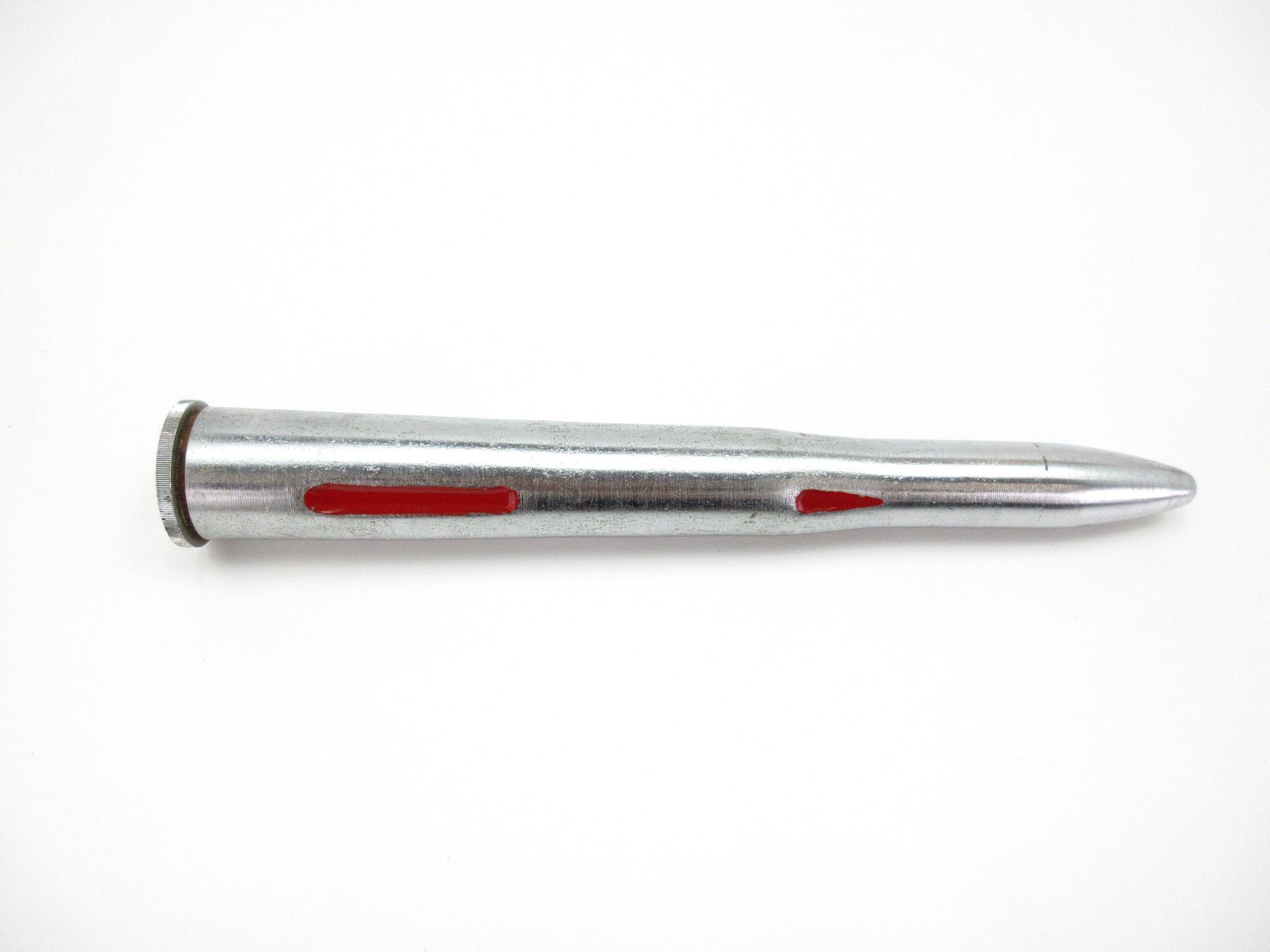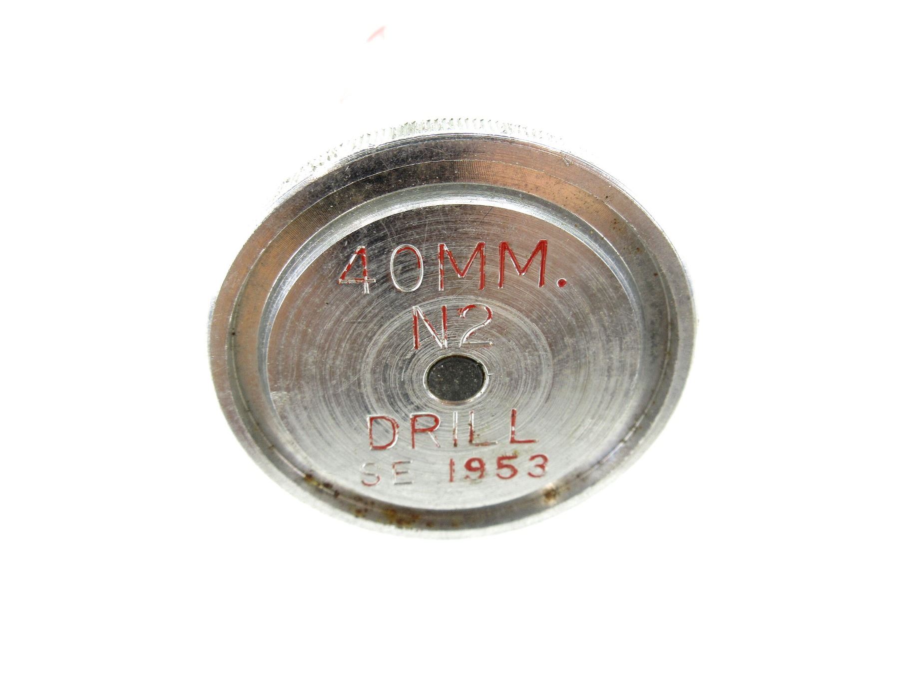 (1) SILVER STEEL WITH RED PAINTED GROOVES, BASE MARKED: "40MM., N2, DRILL, SE 1953", APPROX. 2.5" DIA. & OAL APPROX. 17 5/8". SEE PHOTOS.