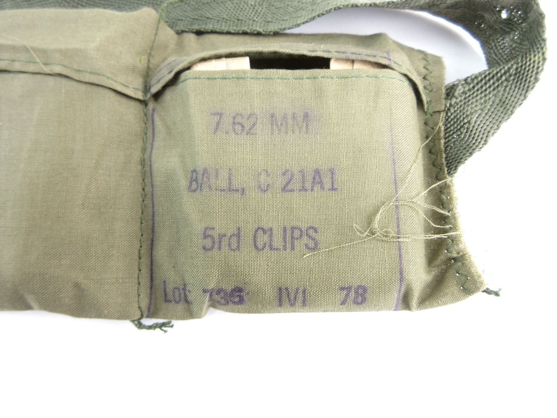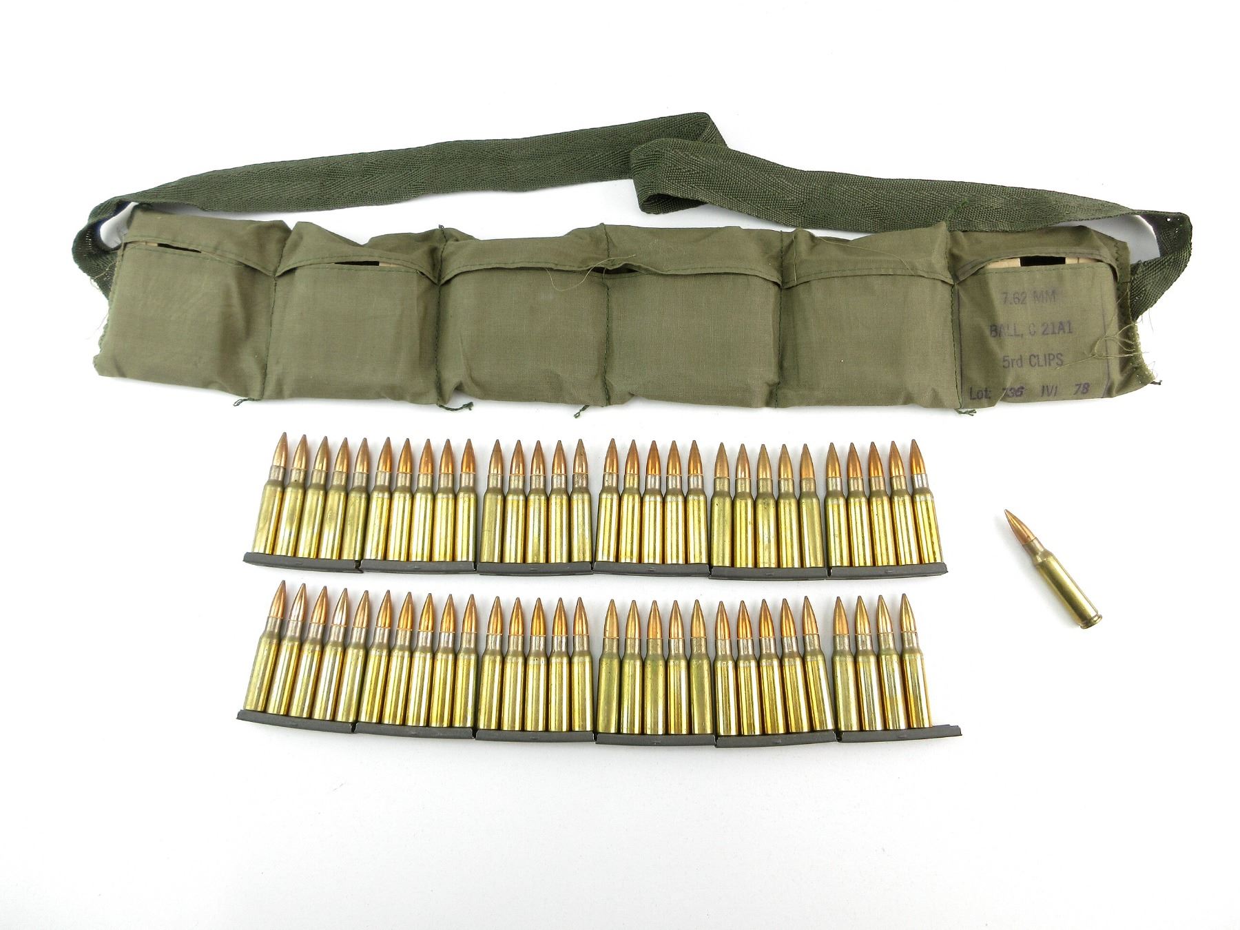 LOT INCLUDES; APPROX. (60) RNDS, FMJ, STRIPPER CLIPS, WITH GREEN BANDOLIER, MARKED C 21A1 LOT 735 IVI 78.