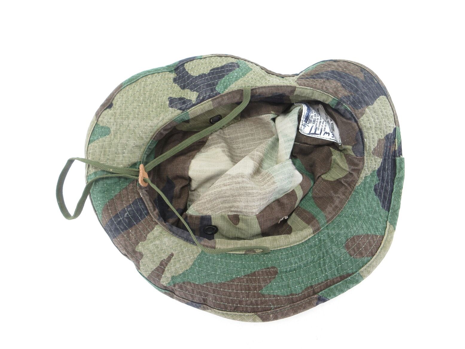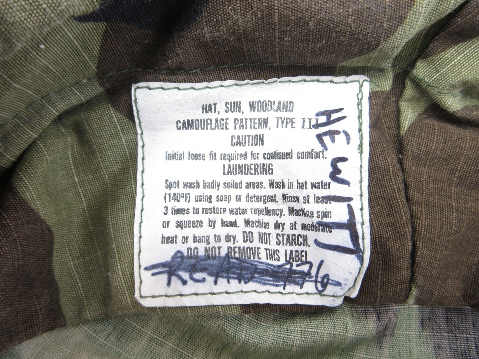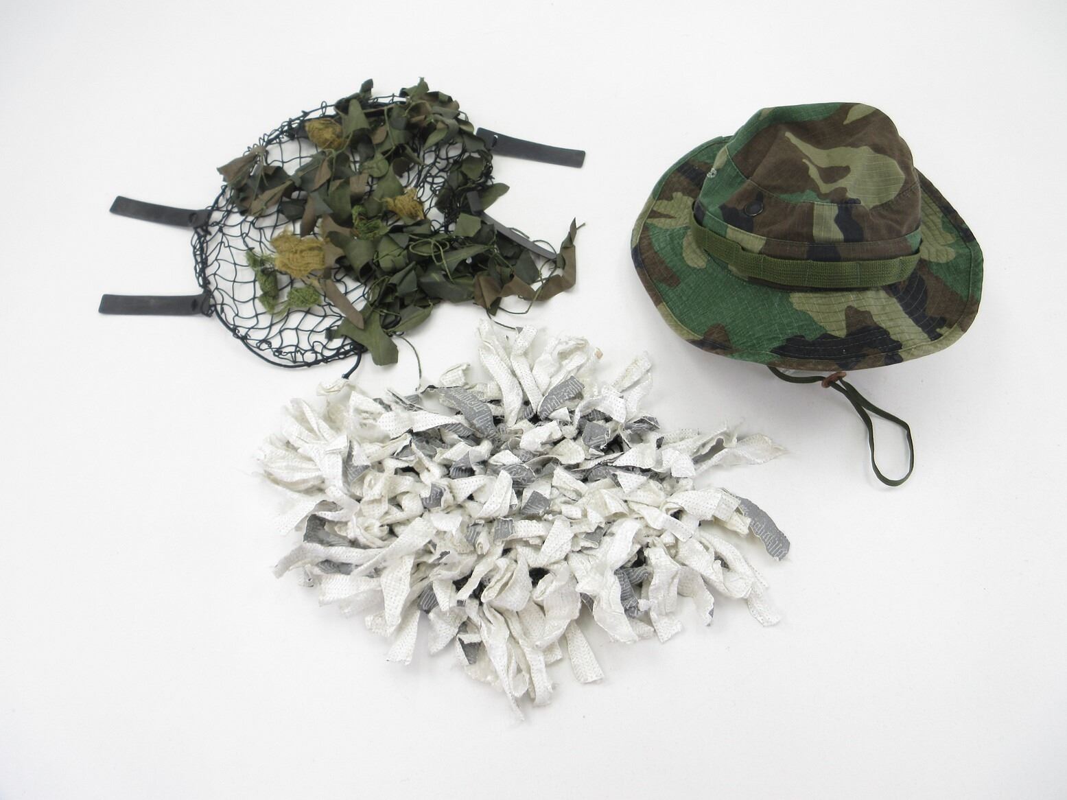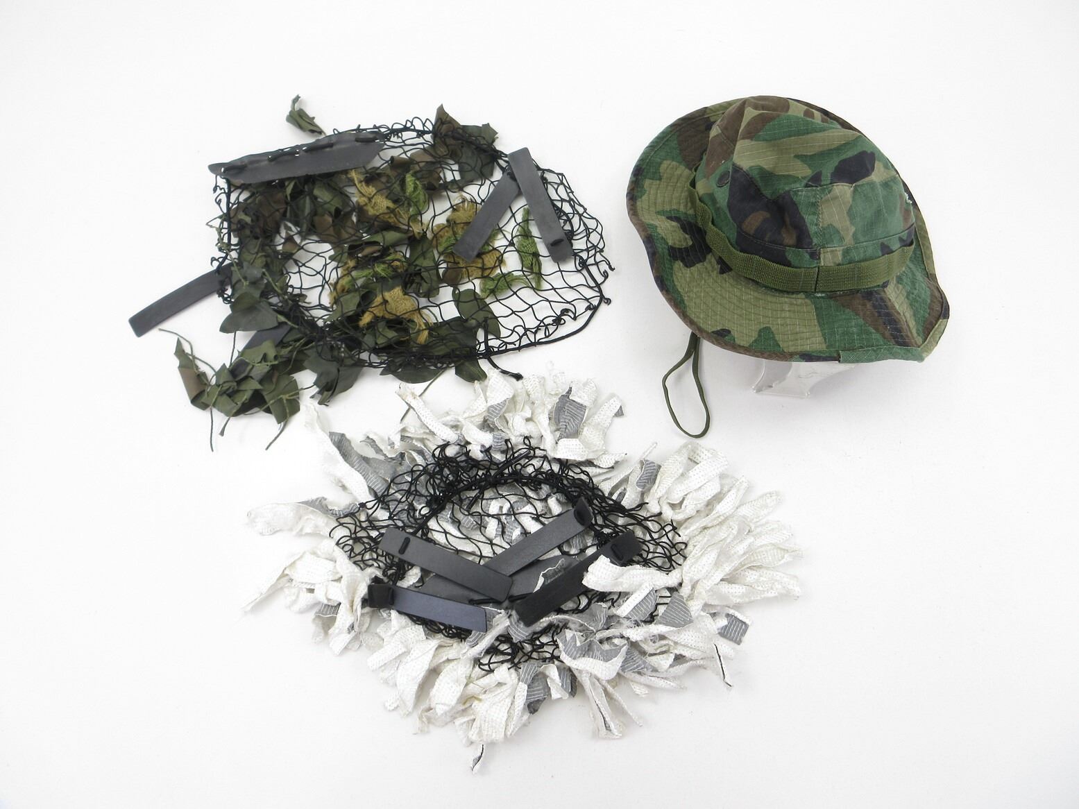 CANADIAN MILITARY ASSORTED HELMET SCRIMS AND HAT LOT. LOT INCLUDES; (2) SCRIMS FOR HELMETS, 1 X WHITE / GREY (WINTER), 1 X GREEN CAMOUFLAGE & (1) GREEN CAMOUFLAGE HAT MARKED: "HAT, SUN, WOODLAND CAMOUFLAGE PATTERN, TYPE III" ETC., WITH CHIN STRAP & SMALL HOLE IN SIDE OF HAT. SEE PHOTOS.