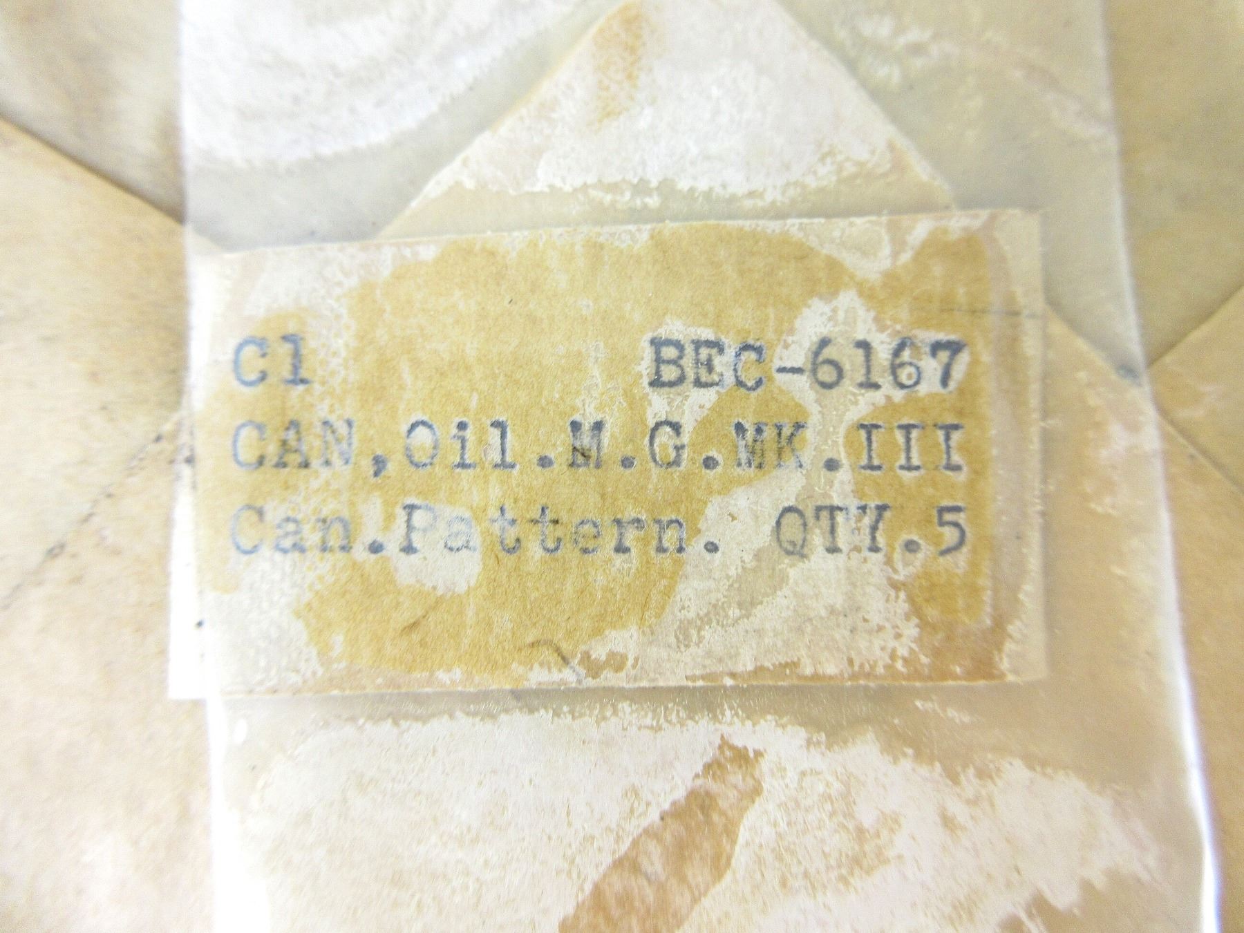 LOT INCLUDES; (3) BOXES OF FIVE OILERS, MARKED: "C1, BEC-6167, CAN, OIL.M.G.MK.III, CAN.PATTERN. QTY.5", TWO ARE NOS, UNOPENED, ONE IS OPENED, CONTAINS FIVE GREY PLASTIC OILERS, MARKED WITH C-BROAD ARROW & PROOF MARK. SEE PHOTOS.