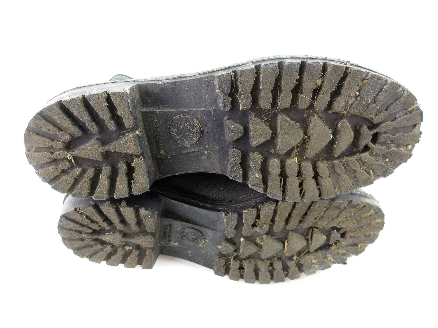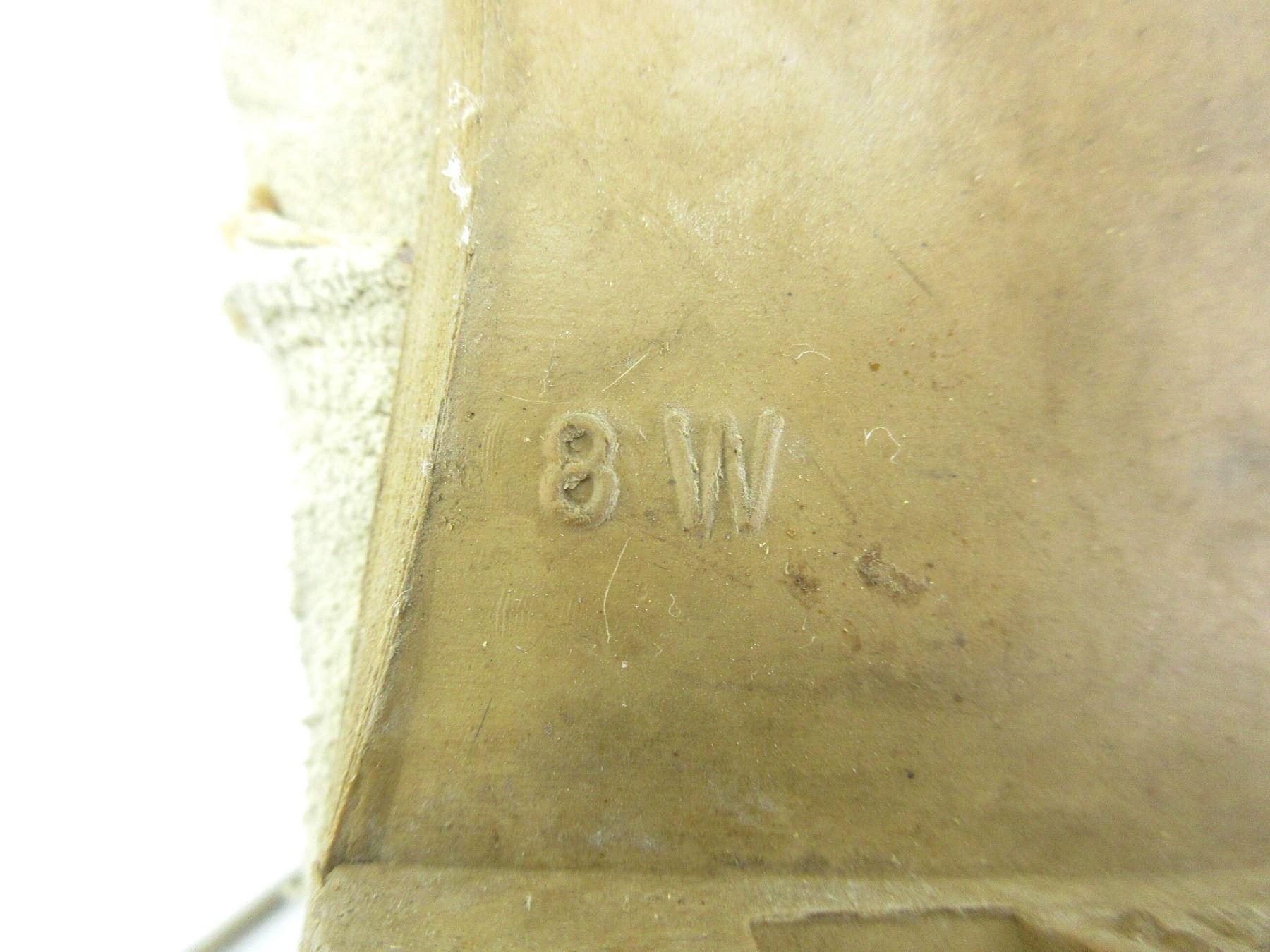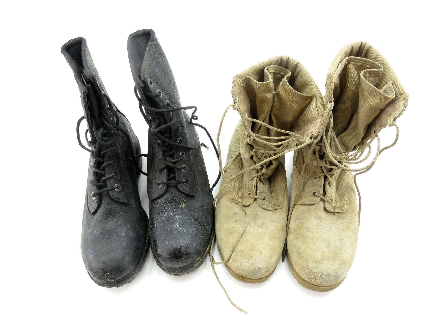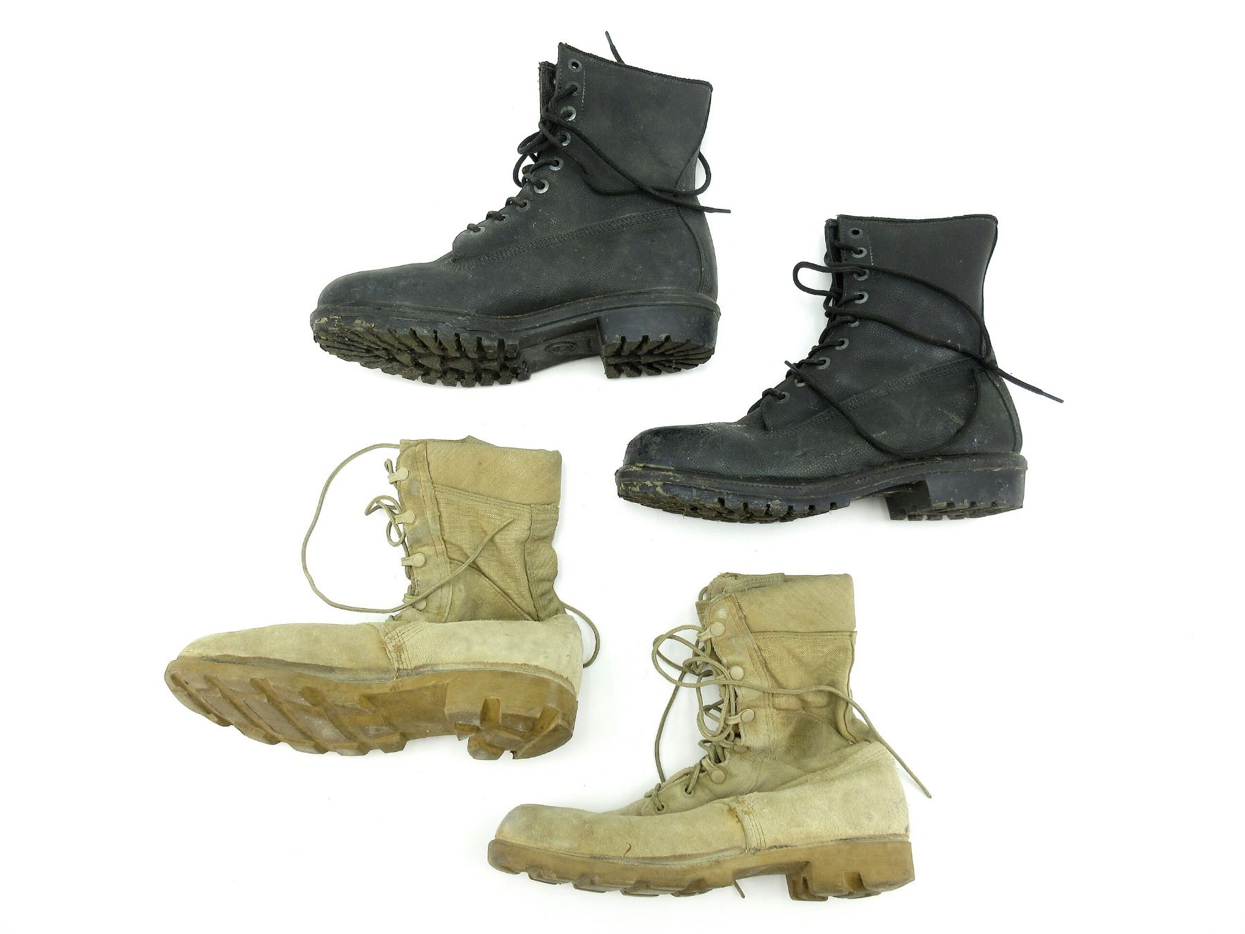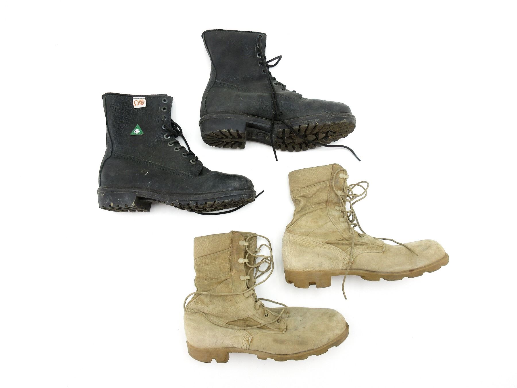 LOT INCLUDES; (1) PAIR OF TAN DESERT BOOTS, SIZE 8W, MARKED: "NS, 10-92, 8W, 21105" & "8W, RO, SEARCH", WITH LACES, SHOWS WEAR & (1) BLACK LEATHER COMBAT BOOTS, SIZE 8.5 3E, MARKED: "MADE IN CANADA, P/N: 1815 101 000 888. S/N: 8430 21 905 7556, SIZE: 8.5 3E, 1894, CSA, LM 39258, GRADE 1, 12/03/02", VARIOUS CSA MARKINGS, VARIOUS MARKINGS ON THE BOTTOM, WITH LACES, SHOWS WEAR. SEE PHOTOS.