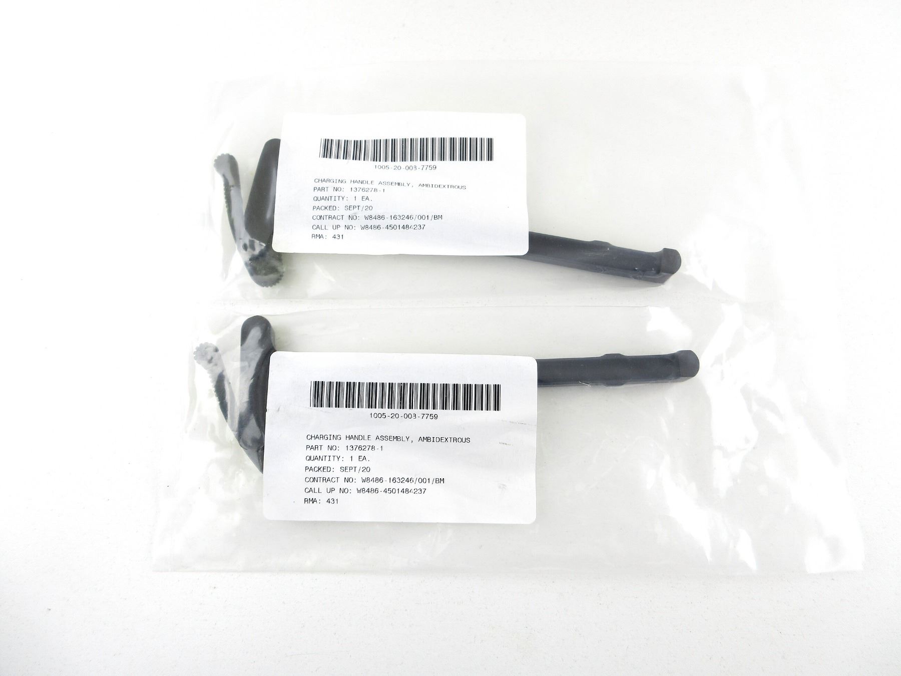 LOT INCLUDES; (2) FOR USE WITH: C7 / C8 / AR-15 & VARIOUS OTHER RIFLES, MARKED: "1005-20-008-7759", "CHARGING HANDLE ASSEMBLY, AMBIDEXTROUS, PART NO: 1376278-1, QUANTITY: 1 EA., PACKED: SEPT/20", ETC., NOS IN UNOPENED PACKAGING. SEE PHOTOS.
