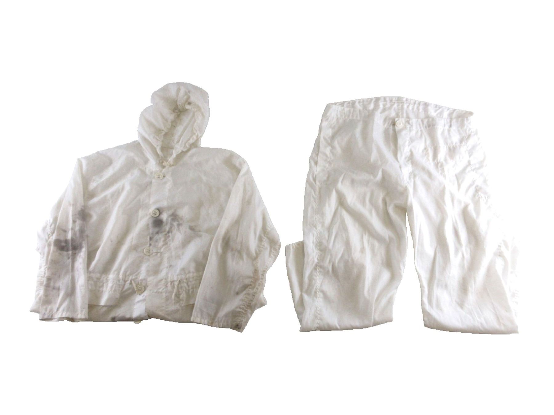 LOT INCLUDES; (1) WHITE CAMO PARKA, NO VISIBLE LABELS, HAND-WRITTEN MARKINGS, SHOWS WEAR, FLY-FRONT, HOODED, VARIOUS DRAWSTRINGS, SHOULDER WIDTH APPROX. 24" & (1) PAIR OF WHITE CAMO PANTS, VARIOUS MARKINGS / LABELS, SHOWS WEAR, FLY-FRONT, VARIOUS DRAWSTRINGS, WAIST ADJUSTABLE & WAIST APPROX. 48". SEE PHOTOS.