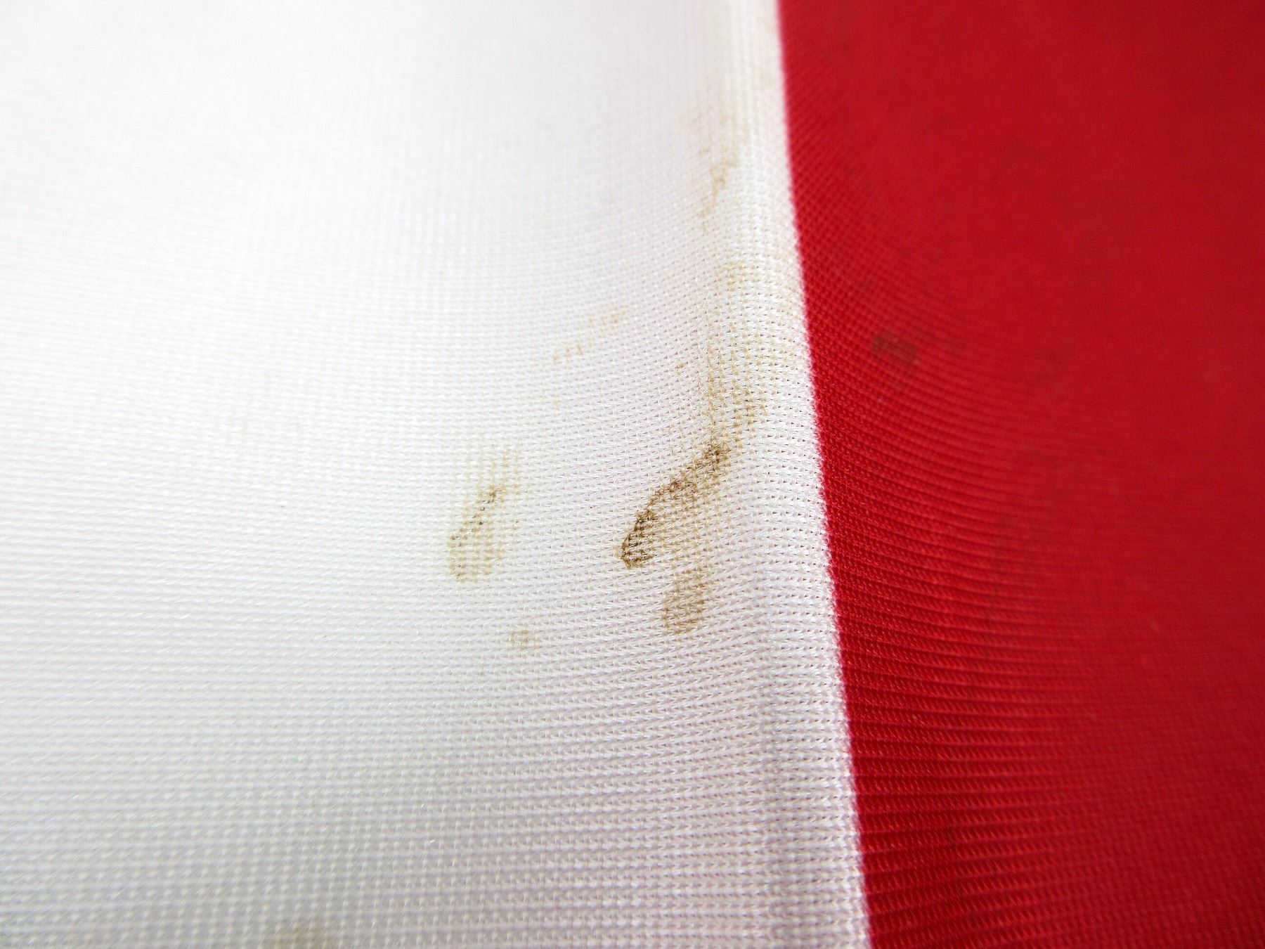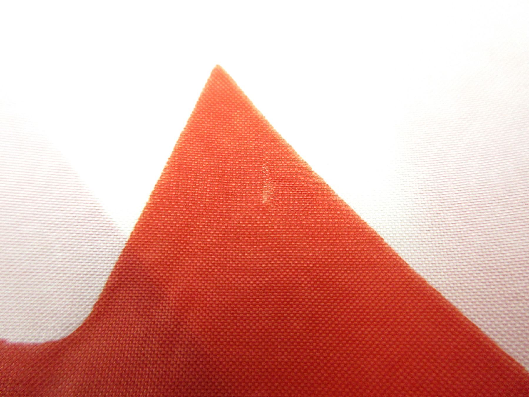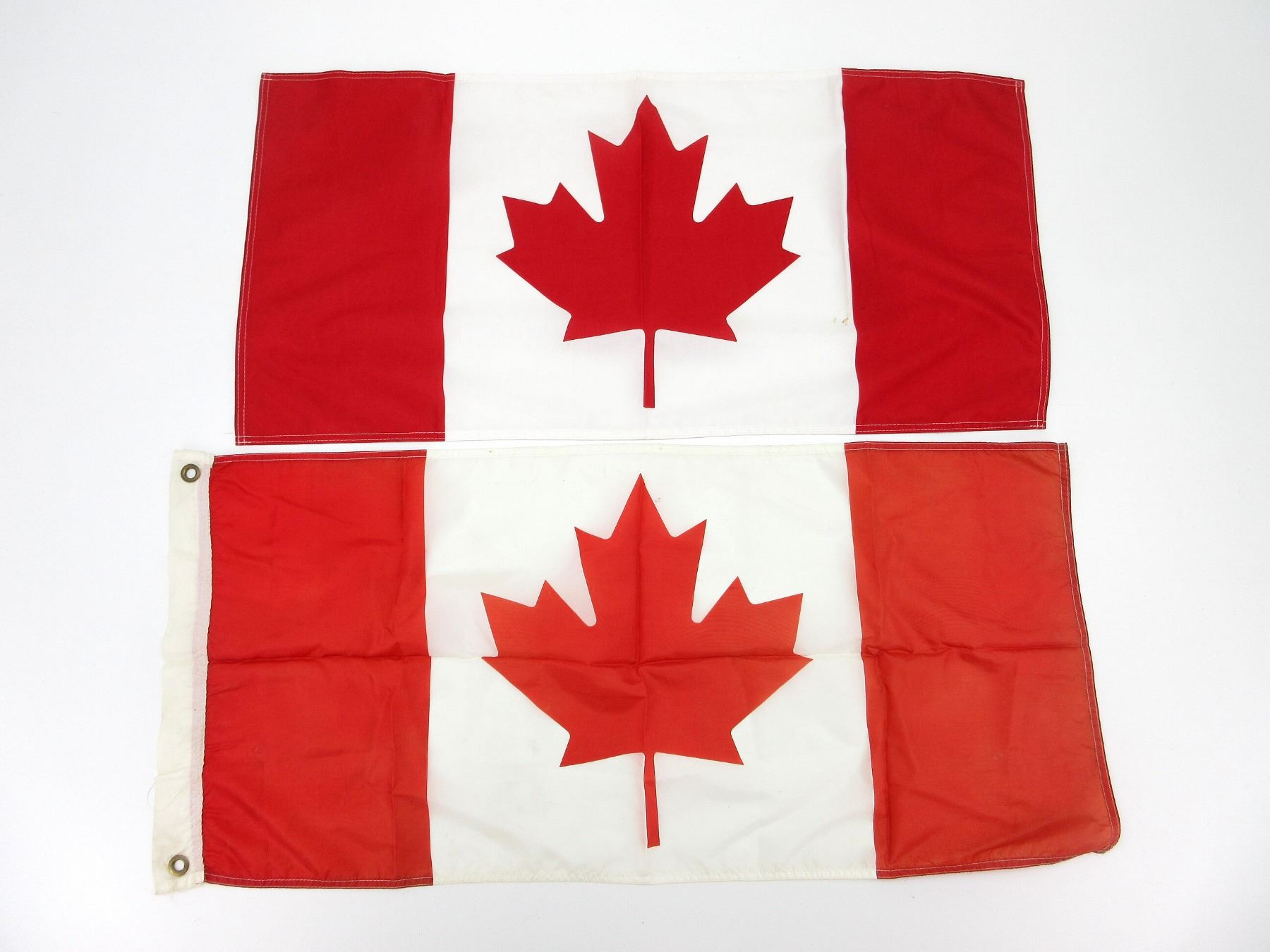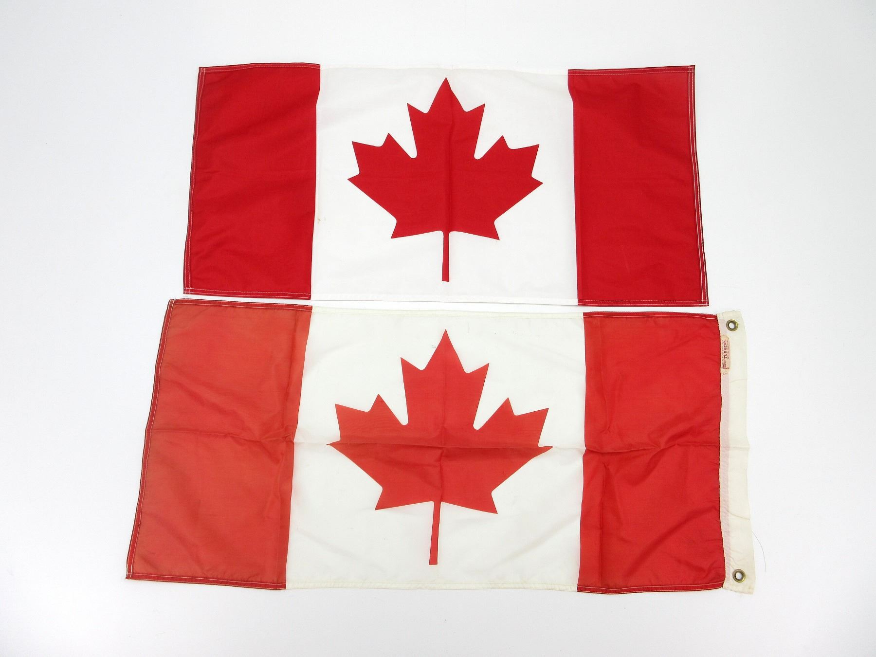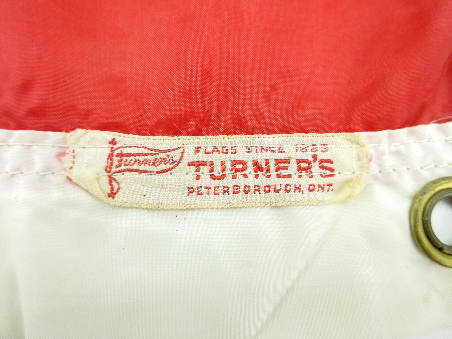LOT INCLUDES; (2) RED / WHITE NYLON FLAGS, ONE HAS TWO BRASS GROMMETS, ONE MARKED: "TURNER'S FLAGS" ETC., SHOWS WEAR, APPROX. 39" X 18" & APPROX. 35" X 17". SEE PHOTOS.