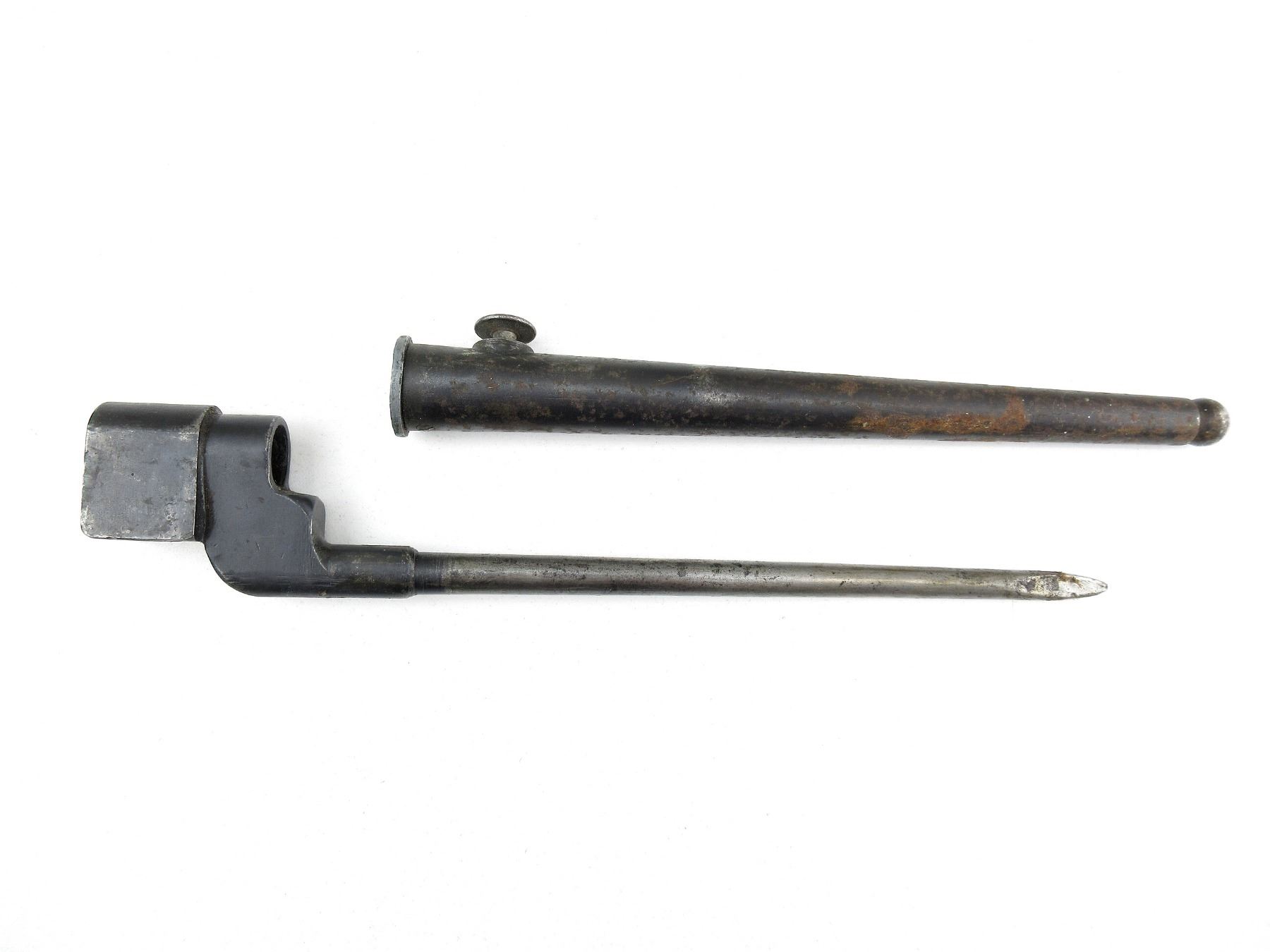 (1) FITS LEE ENFIELD NO.4 MKI & MKII SERIES RIFLES, SOCKET MARKED: "NO 4 MK II", PARTIAL "LB (LONG BRANCH)", METAL MK. I SCABBARD, STUD MARKED WITH C-BROAD ARROW, BLADE APPROX. 7 7/8" & OAL APPROX. 9.75". SEE PHOTOS.