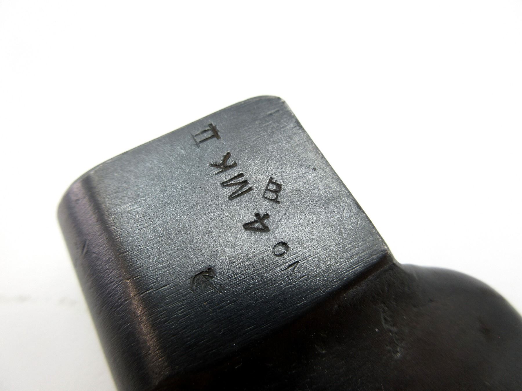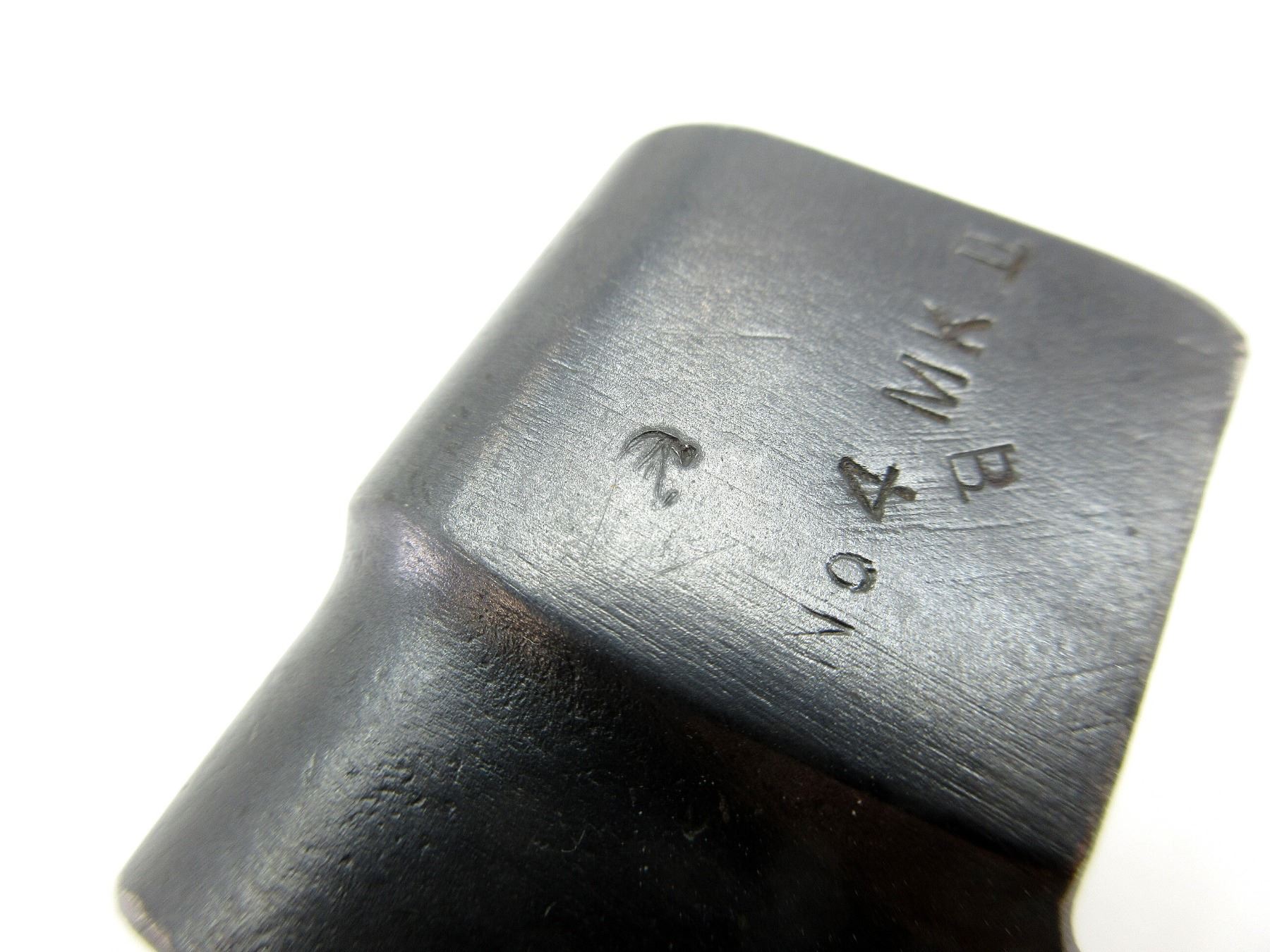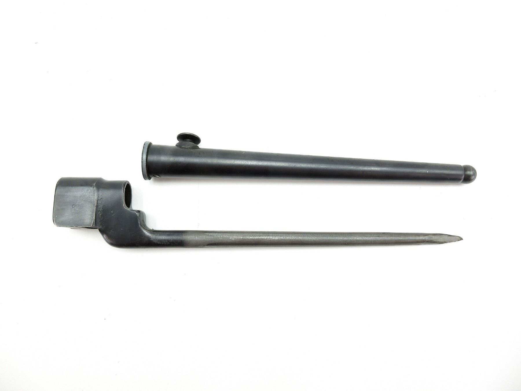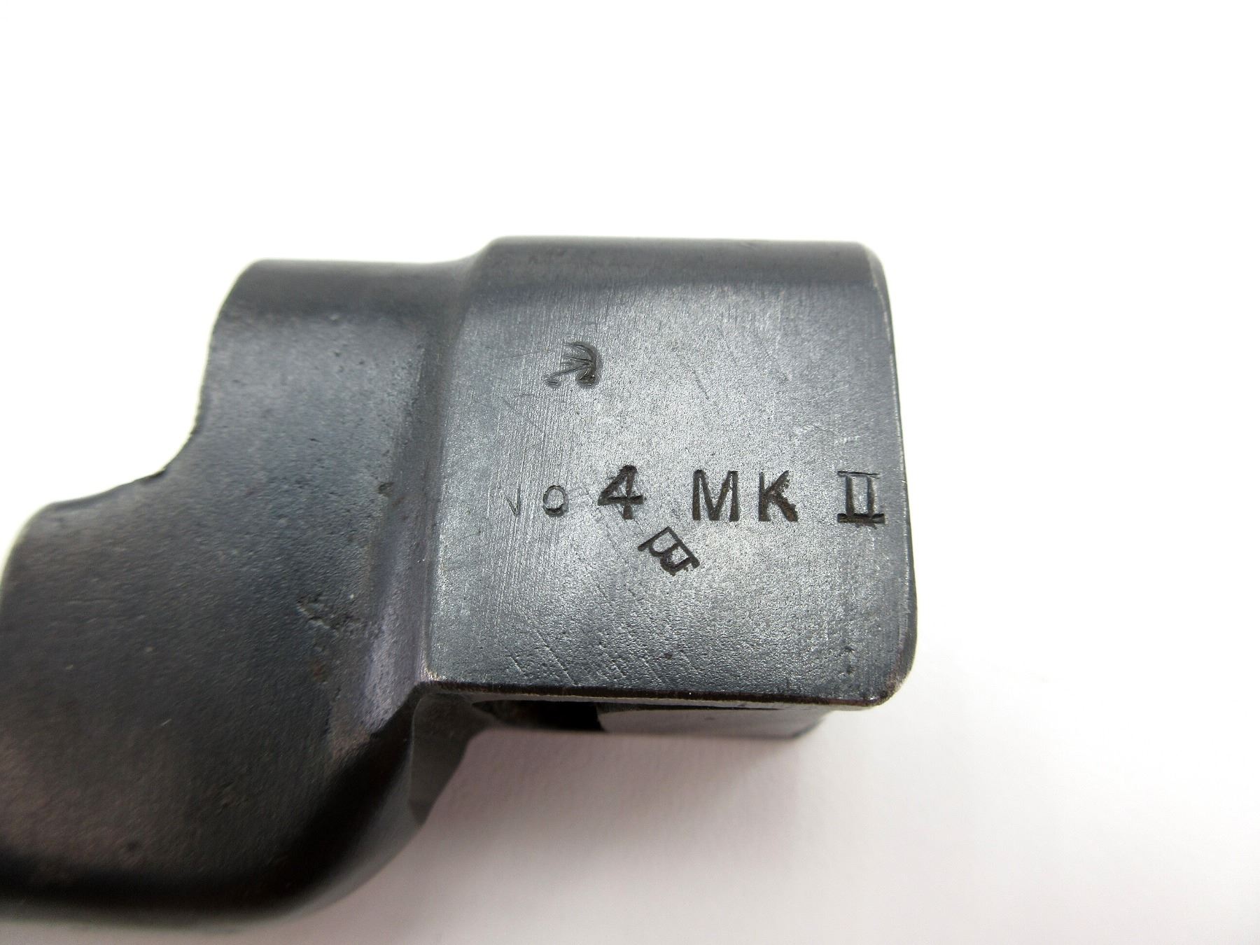 (1) FITS LEE ENFIELD NO.4 MKI & MKII SERIES RIFLES, SOCKET MARKED: "NO 4 MK II", "LB (LONG BRANCH)" & PARTIAL C-BROAD ARROW, METAL MK I. SCABBARD, NO VISIBLE MARKINGS, BLADE APPROX. 8" & OAL APPROX. 9 7/8". SEE PHOTOS.