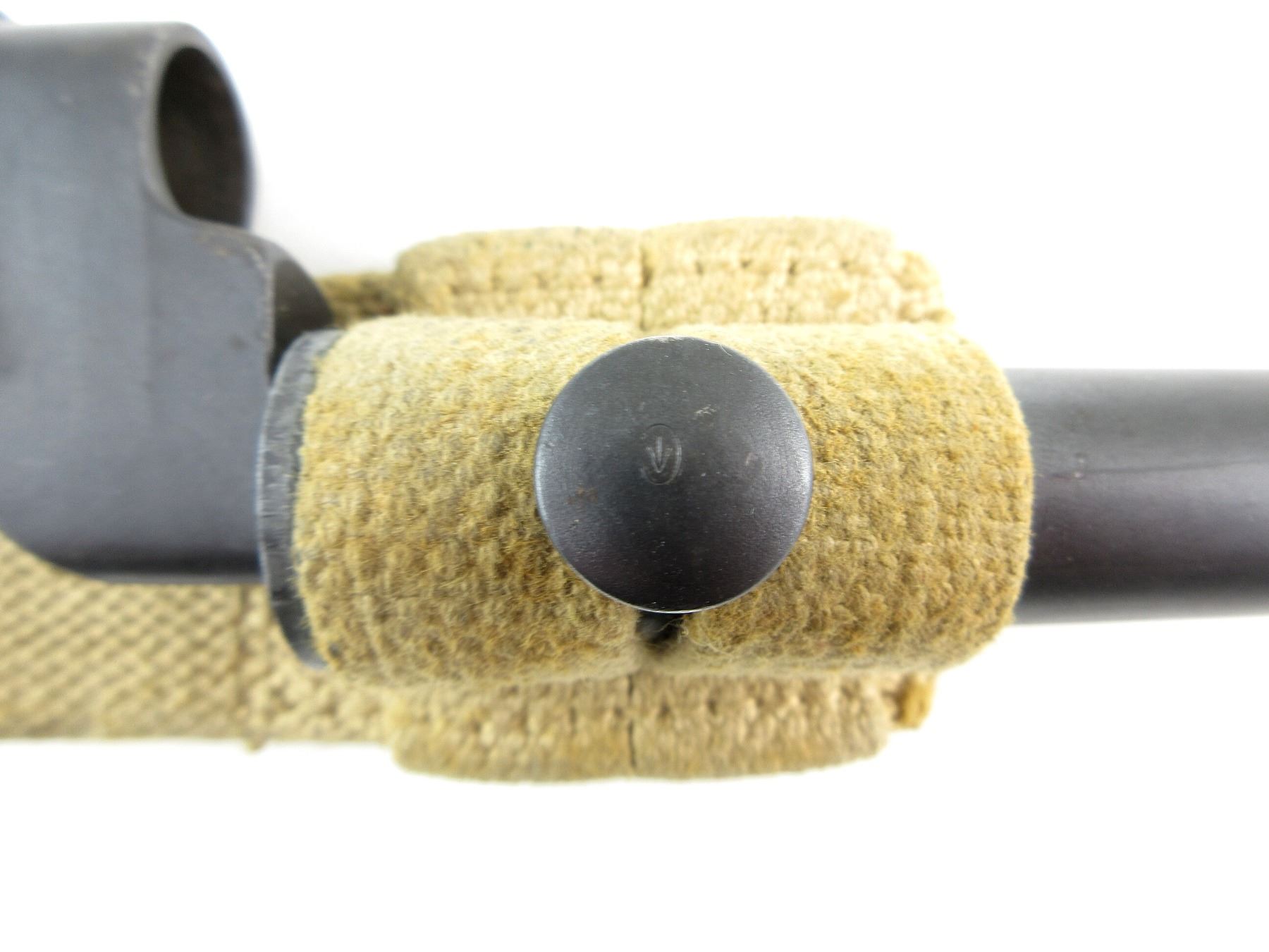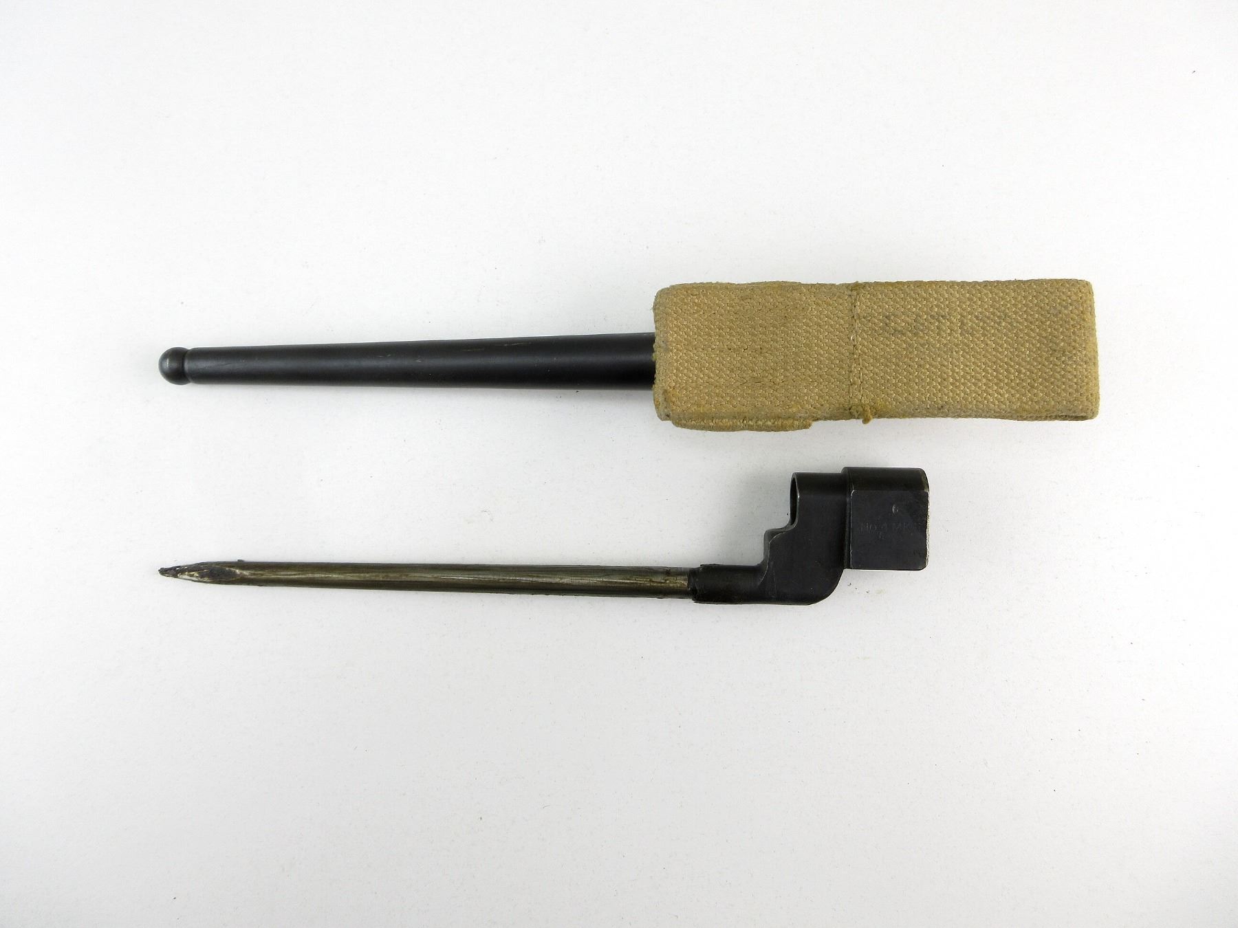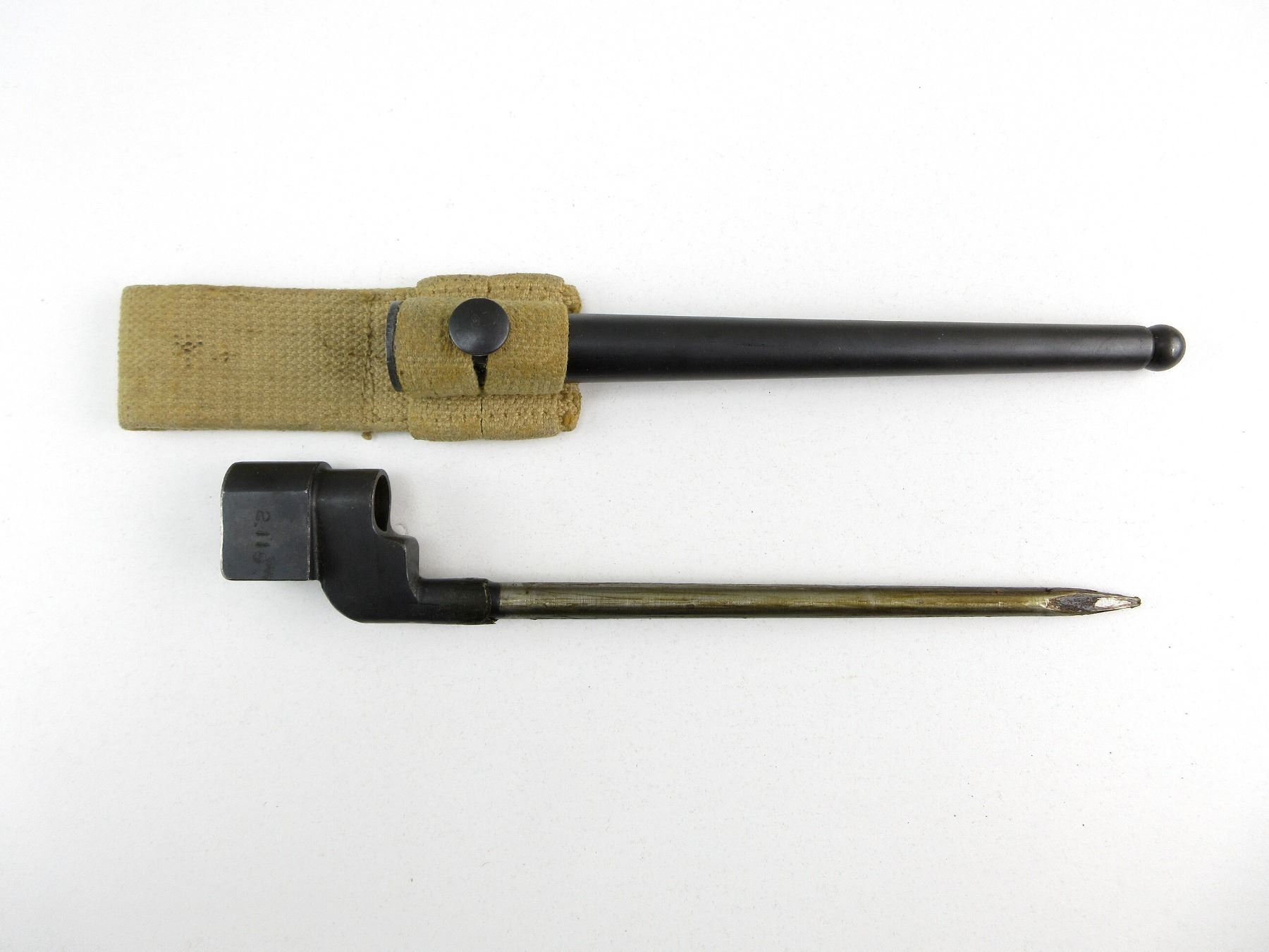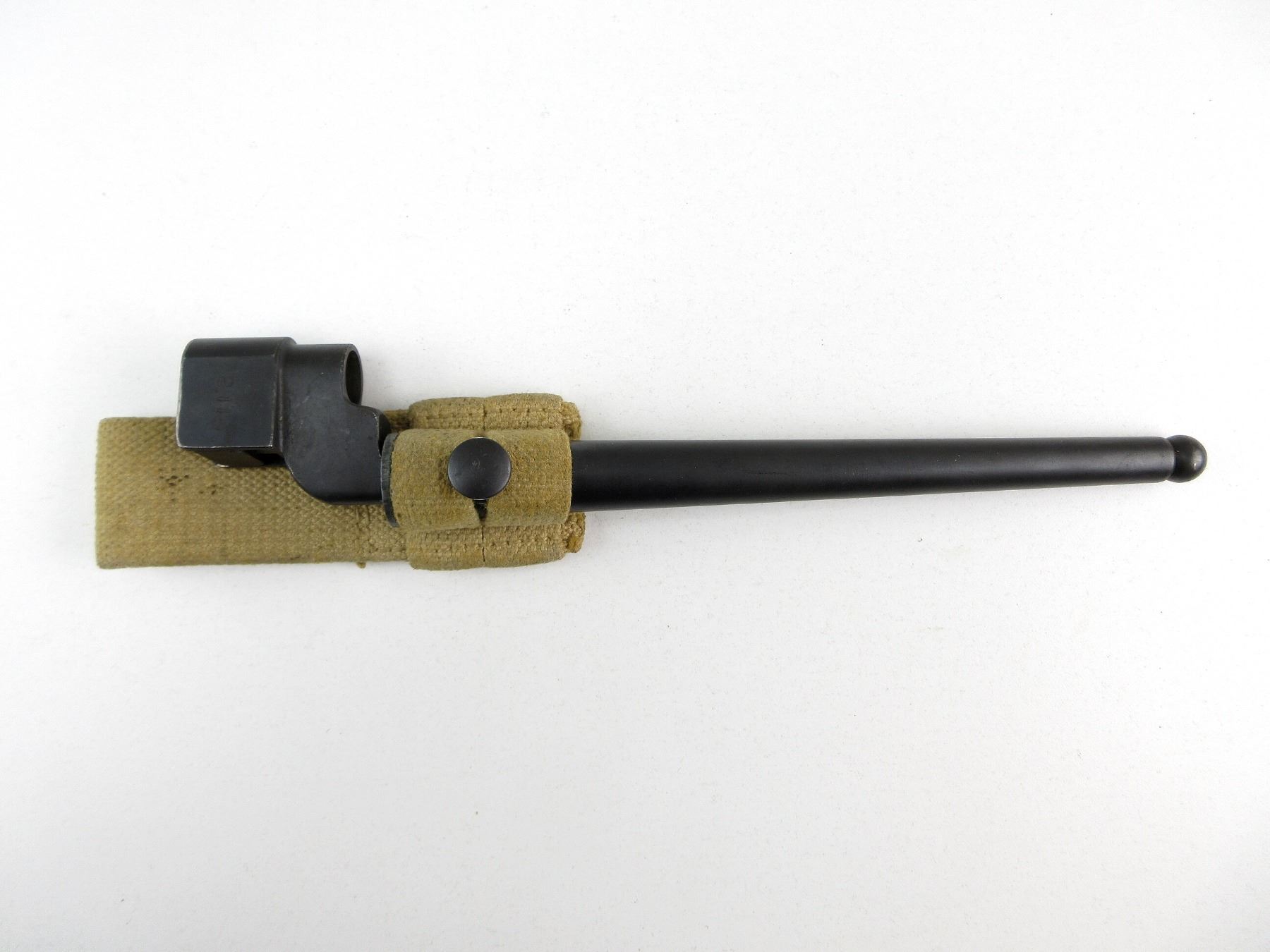 (1) FITS LEE ENFIELD NO.4 MKI & MKII SERIES RIFLES, SOCKET MARKED: "NO 4 MK II", "LB (LONG BRANCH)", C-BROAD ARROW & "2119" METAL MK. I SCABBARD, STUD MARKED WITH C-BROAD ARROW, TAN P37 WEB CANVAS BELT FROG, FAINTLY MARKED: "Z.L.& T. LTD." & C-BROAD ARROW, BLADE APPROX. 7 7/8" & OAL APPROX. 9.75". SEE PHOTOS.
