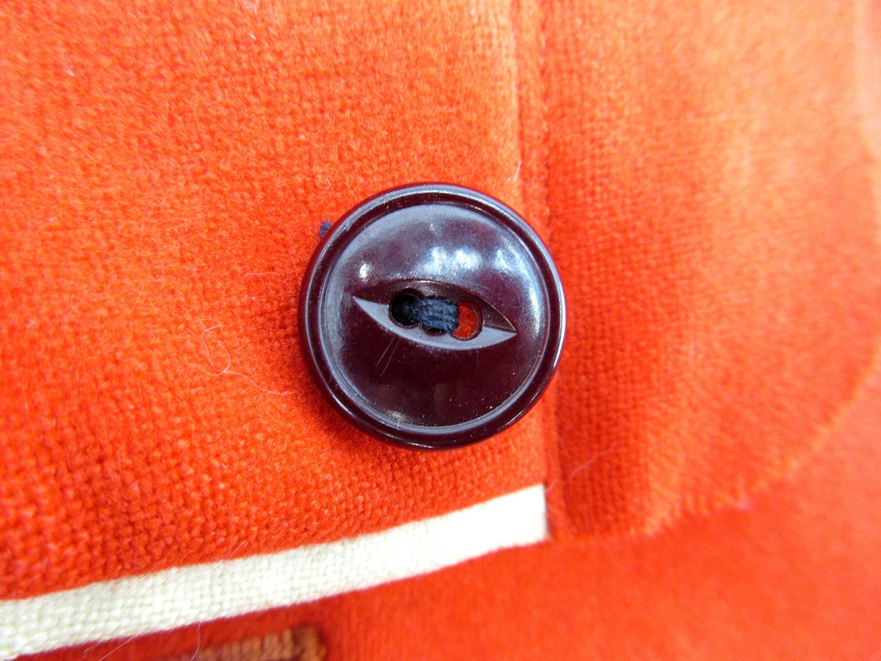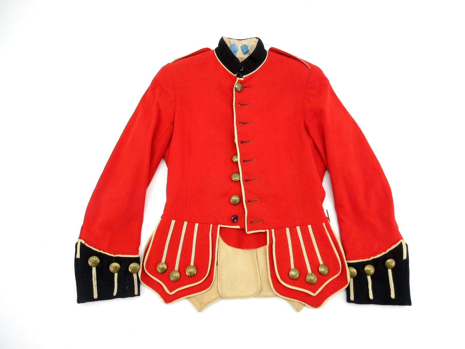 (1) RED WOOL TUNIC WITH BLUE COLLAR / CUFFS, MARKED: "ST. ANDREW'S COLLEGE, ??????, ONTARIO CANADA", VARIOUS HAND-WRITTEN MARKINGS, BRASS QUEEN VICTORIA CROWN & "VRI" BUTTONS ON SHOULDERS, CLOSED COLLAR, MISSING ONE HOOK ON COLLAR, BUTTON-FRONT, BRASS ST. ANDREW BUTTONS ON FRONT / CUFFS, ONE BUTTON REPLACED, SHOWS AGE / WEAR, SHOULDER WIDTH APPROX. 14.5". SEE PHOTOS.