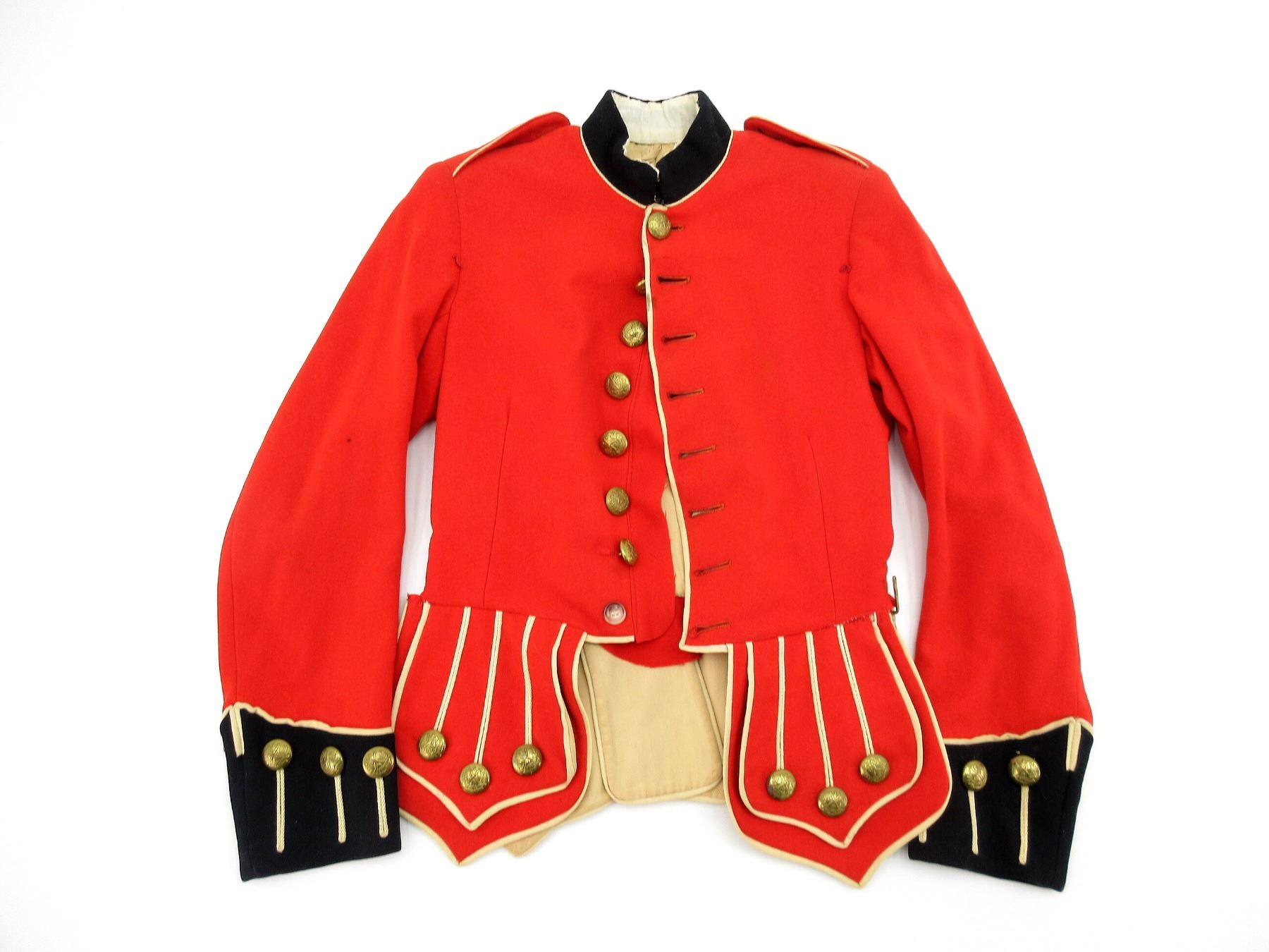 (1) RED WOOL TUNIC WITH BLUE COLLAR / CUFFS, MARKED: "ST. ANDREW'S COLLEGE, ??????, ONTARIO CANADA", VARIOUS HAND-WRITTEN MARKINGS, BRASS QUEEN'S CROWN WITH "THE CANADIAN SCOTTISH" BUTTONS ON SHOULDERS, CLOSED COLLAR, BUTTON-FRONT, BRASS ST. ANDREW BUTTONS ON FRONT / CUFFS, ONE BUTTON REPLACED, SHOWS AGE / WEAR, SHOULDER WIDTH APPROX. 14.5". SEE PHOTOS.