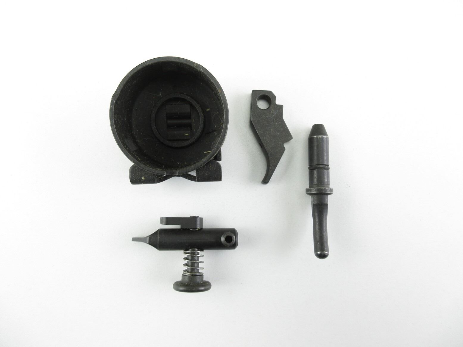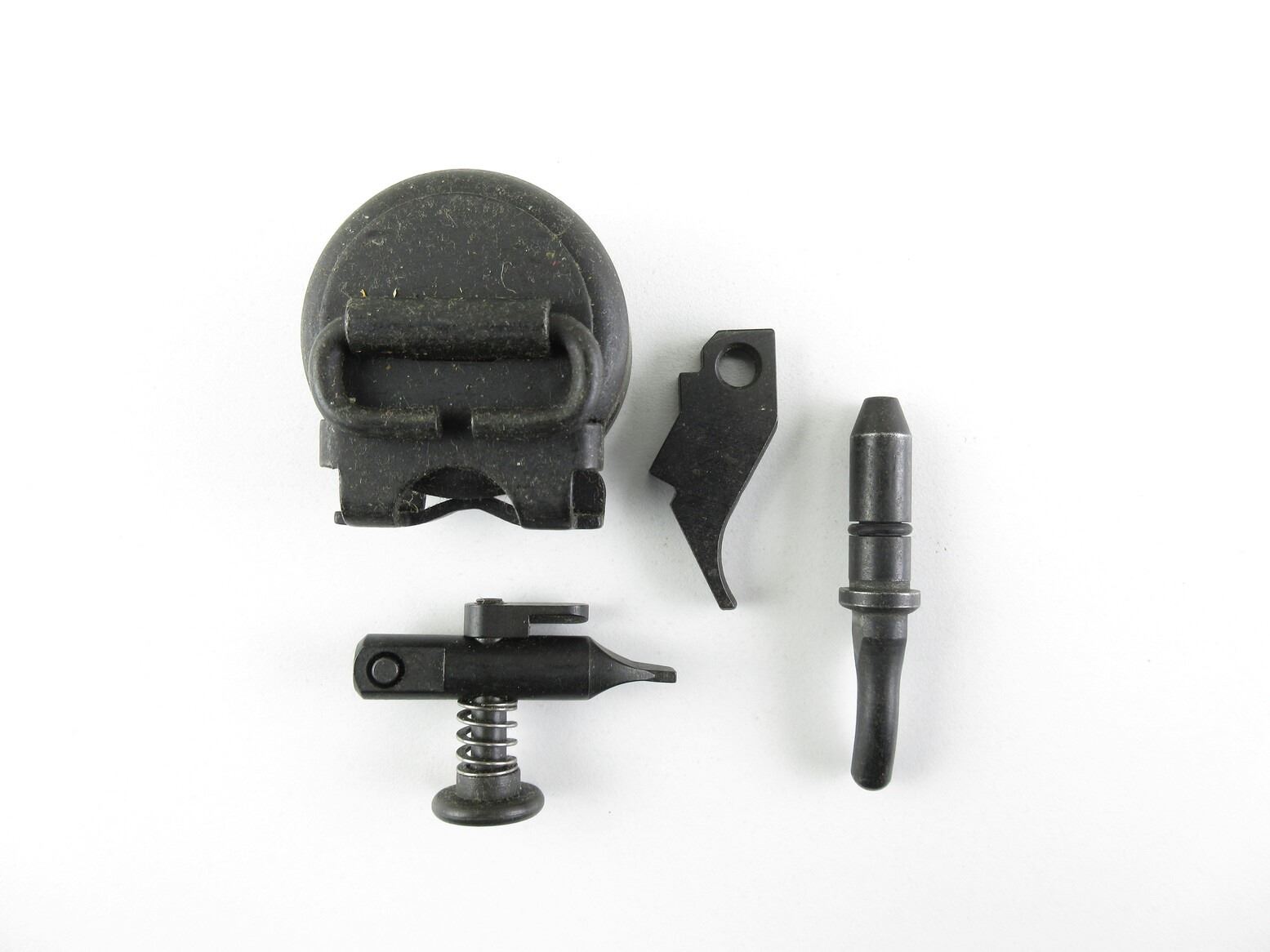 CANADIAN STERLING 9MM SMG PARTS LOT. LOT INCLUDES; (1) END CAP, UNMARKED, WITH SWIVEL, (1) COCKING HANDLE, STEEL, (1) TRIGGER, (1) EJECTOR & MAG CATCH ASSEMBLY. SEE PHOTOS.