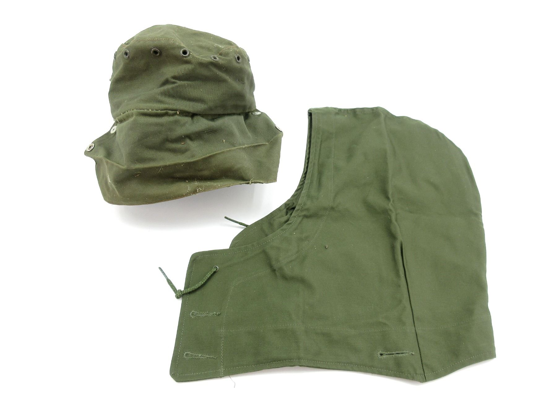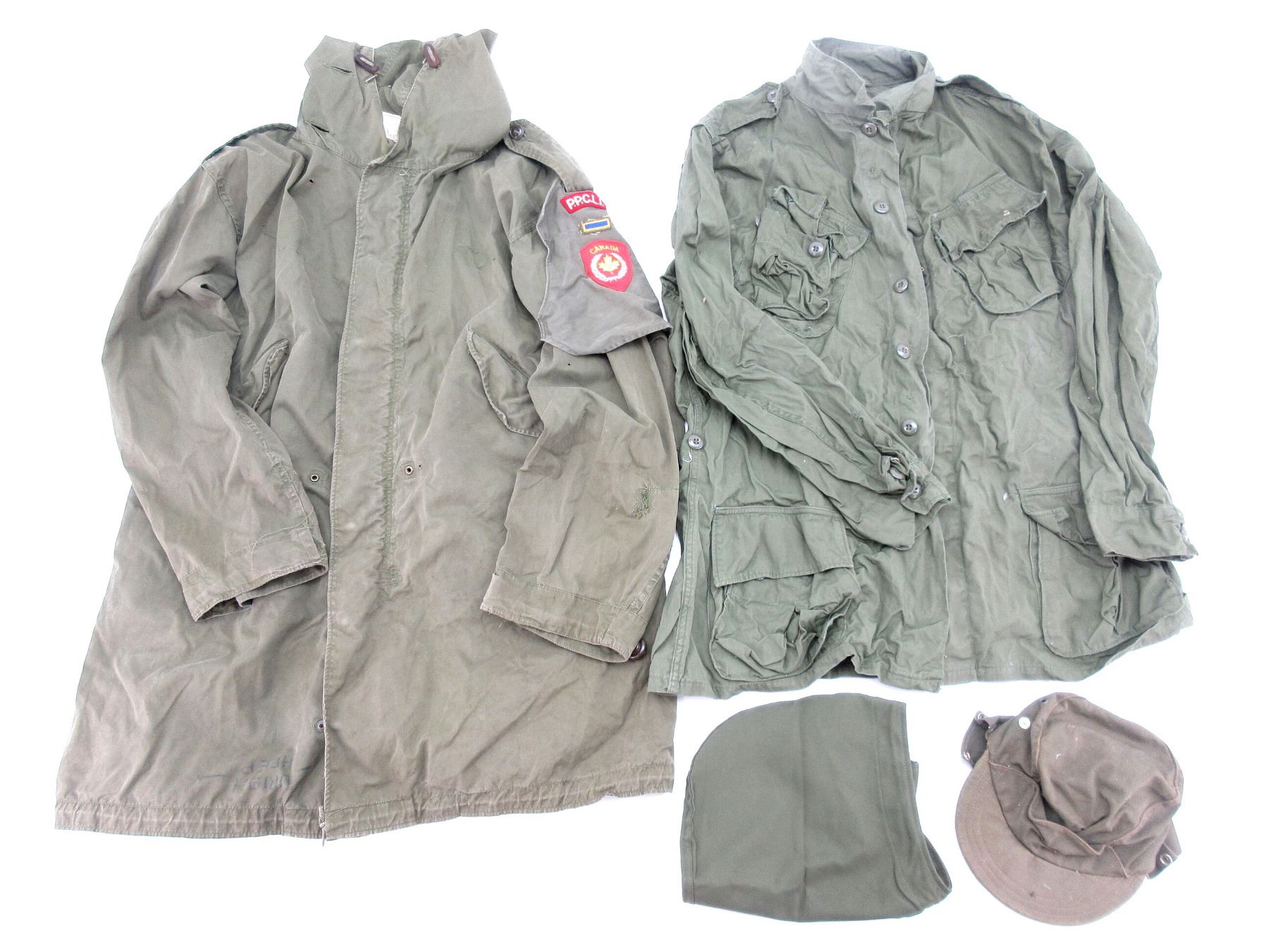 LOT INCLUDES; (1) GREEN CANVAS COAT, HOOD MARKED: "SIZE SMALL, 8415 22? 76?4", "PARKA, SHELL, M-1951" & "SHELL, M-1951, 12 MARCH 1951" & VARIOUS OTHER FAINT / UNCLEAR MARKINGS, SNAP / ZIPPERED FRONT (WORKS), BRASSARD WITH P.P.C.L.I. BADGE, CANADA BADGE & BLUE / YELLOW DIVISION BADGE, COAT SHOWS WEAR / SLIGHT TEARS, (1) GREEN CANVAS COAT MARKED: "COAT, MAN'S, COMBAT, TROPICAL, DSA-100-1387", "LONG-LARGE, CHEST: 41 TO 45 INCHES, HEIGHT: FROM 71 INCHES UP, 8405-082-5573" & VARIOUS OTHER MARKINGS / LABELS, BUTTON FRONT, SHOWS WEAR / SLIGHT TEARS, (1) CANADIAN MILITARY GREEN CANVAS FIELD CAP, VERY FAINT / UN-CLEAR MARKINGS & MAPLE LEAF PROOF MARK, SIZE UNKNOWN & (1) U.S. MILITARY JACKET HOOD, MARKED: "HOOD, JACKET, FIELD, M-1951, SHERR BROS, MFG. CO. INC., 29 MAY 1953" ETC., "MEDIUM (38-40-42)" ETC. SEE PHOTOS.