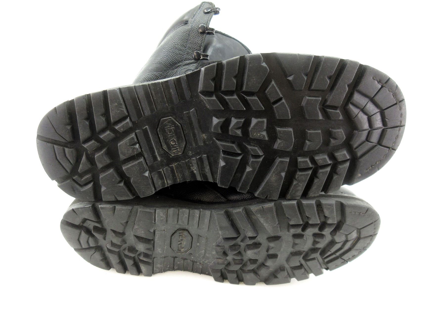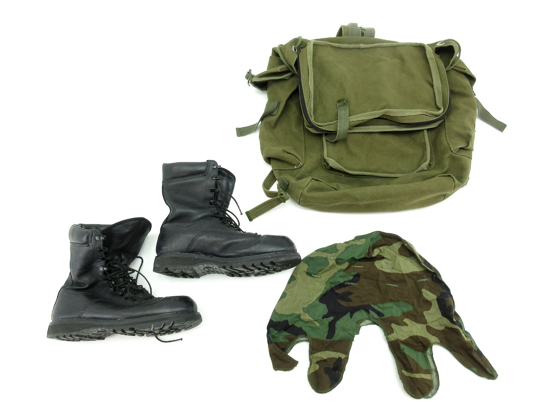 LOT INCLUDES; (1) CANADIAN MILITARY PAIR OF BLACK LEATHER COMBAT BOOTS, MARKED: "GORE-TEX, BEST DEFENSE", "VIBRAM" & "W8430-21-918-0050, 08/01, BOOTS, COMBAT, WET WEATHER, H.H. BROWN SHOE CO. (CANADA) LTD, 280/106" ETC., SIZE 280/106 (11), WITH LACES, (1) U.S. MILITARY CAMO HELMET COVER, MARKED: "COVER HELMET CAMOUFLAGE, 8415-00-105-0605, 10" ETC. & (1) GREEN CANVAS MILITARY STYLE RANGE PACK, MARKED: "100% COTTON, MADE IN CHINA", SHOULDER & WAIST STRAPS, VARIOUS POCKETS, DRAWSTRING TOP. SEE PHOTOS.
