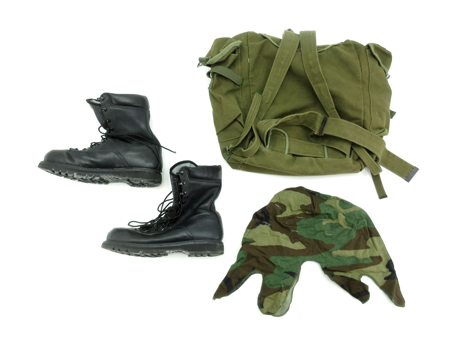 CANADIAN / U.S. MILITARY COMBAT BOOTS, HELMET COVER, ETC. LOT
